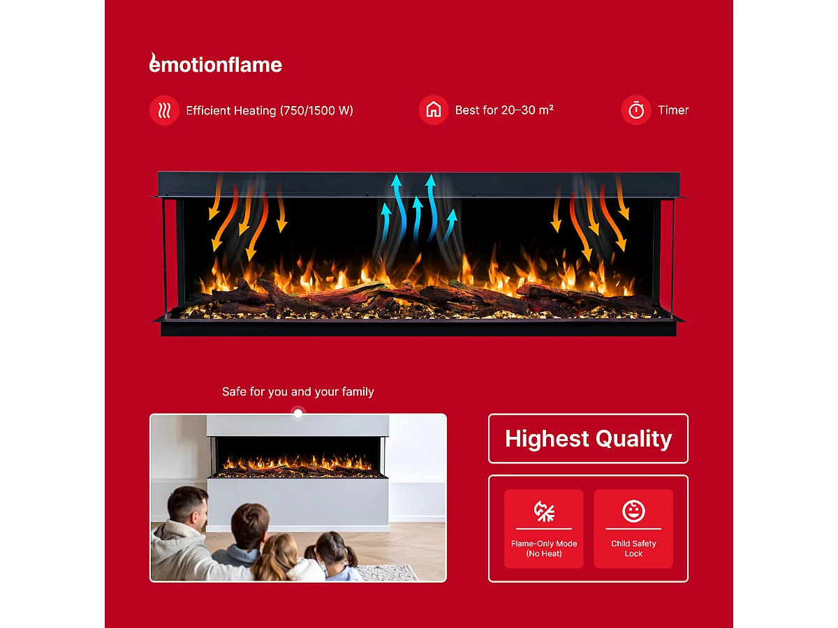 Cheminée électrique à 3 côtés SOLIS 180 - feu premium, encastrable - 180x30x46 cm - cheminée LED - chauffage 750/1500 W