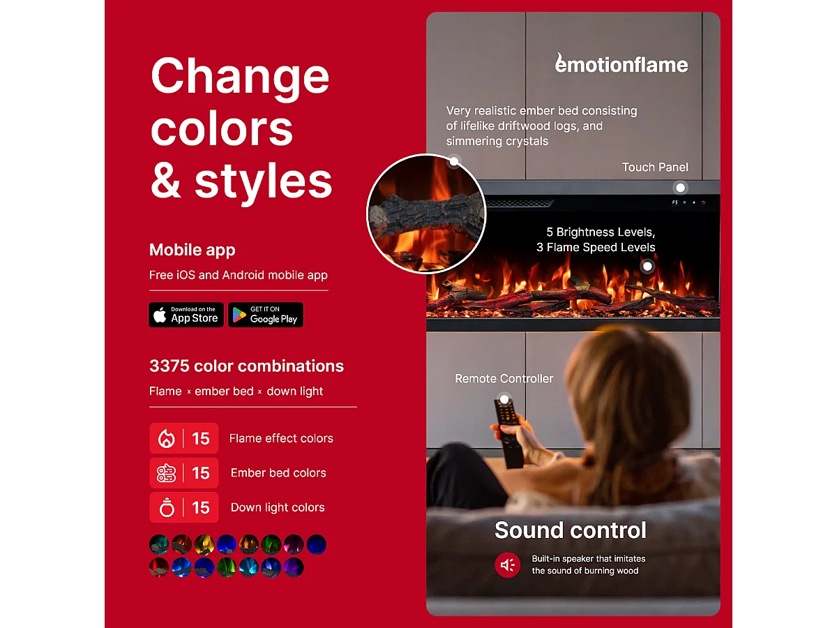Cheminée électrique à 3 côtés UNITY 183 - feu premium, murale ou encastrable - 183x19x36 cm - cheminée LED - chauffage 900/1800 W