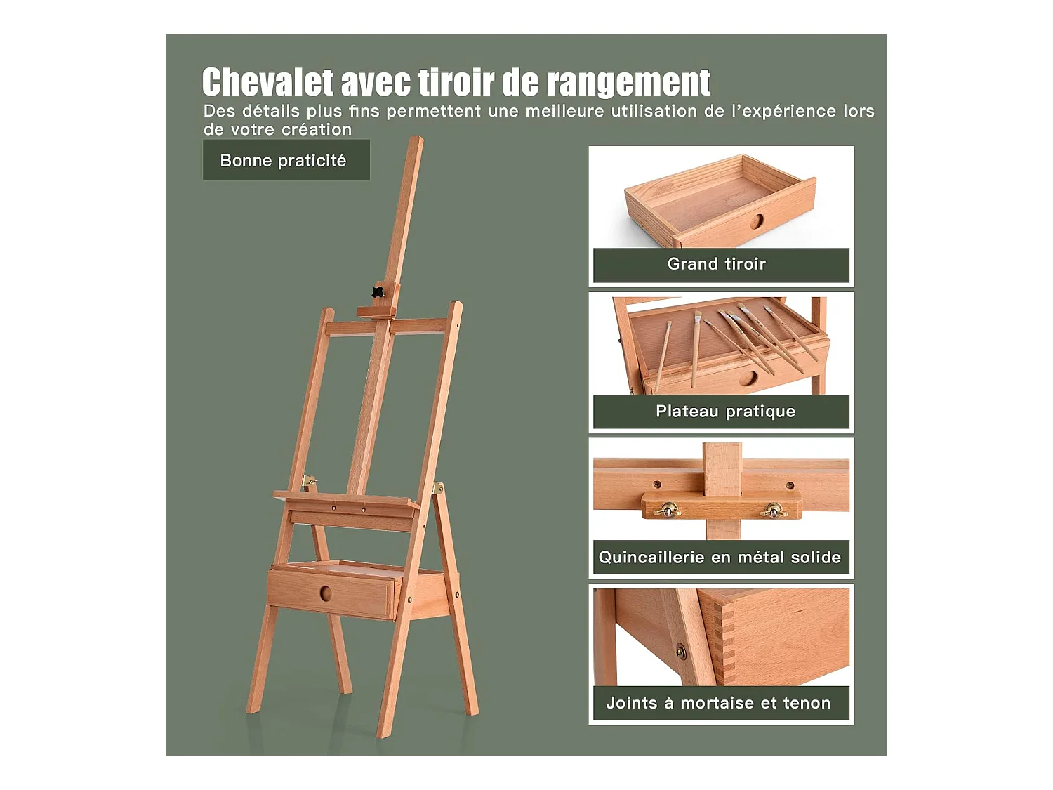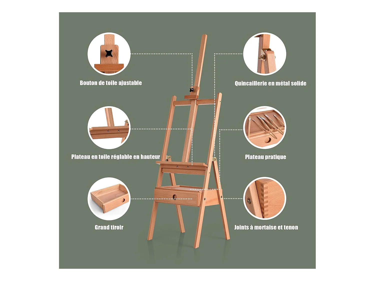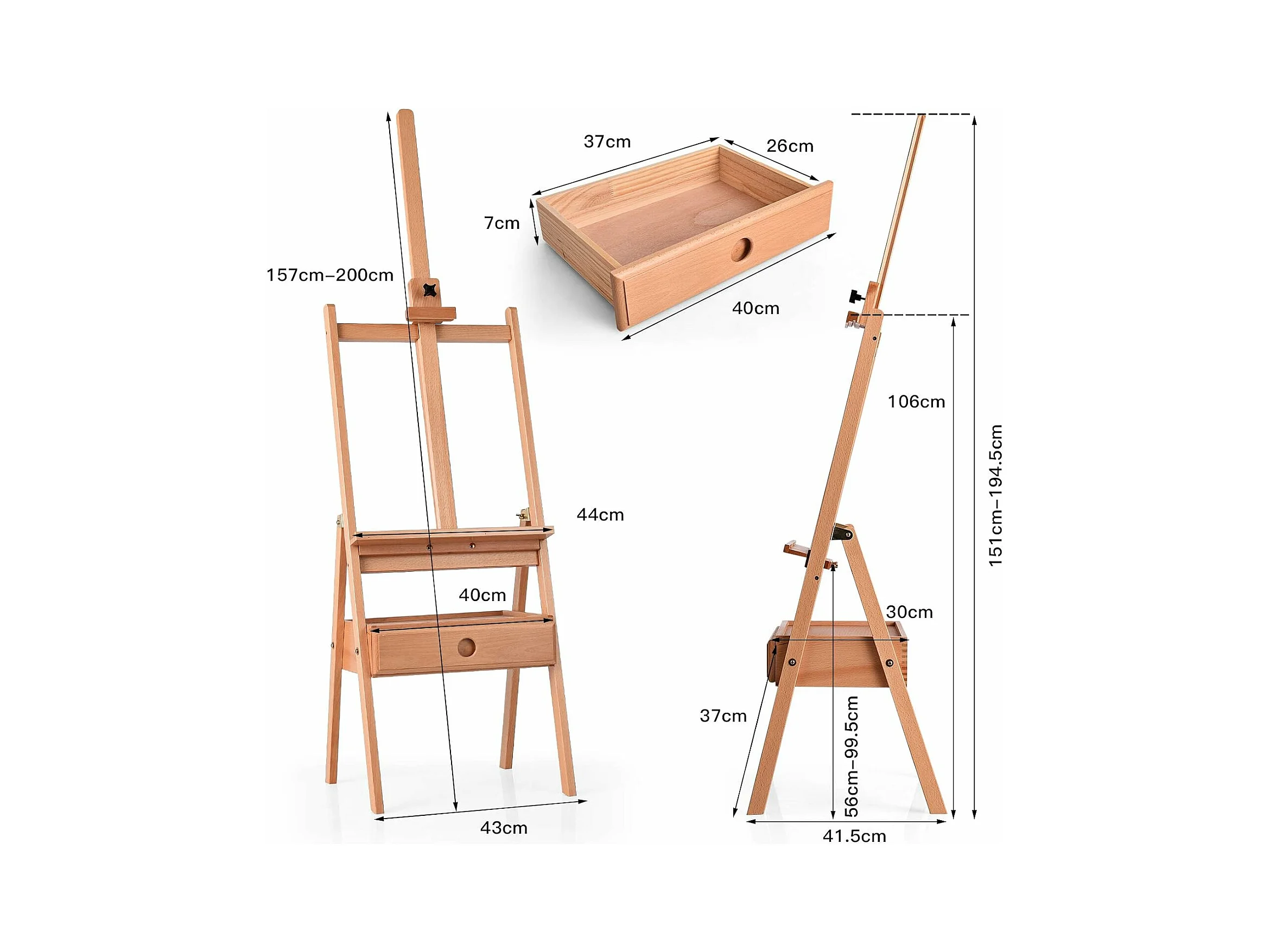 Chevalet de Peintre sur Pied en Bois Hêtre Hauteur 2M avec Tiroir et Plateau Support de Toile Réglable à 92cm pour Affichage