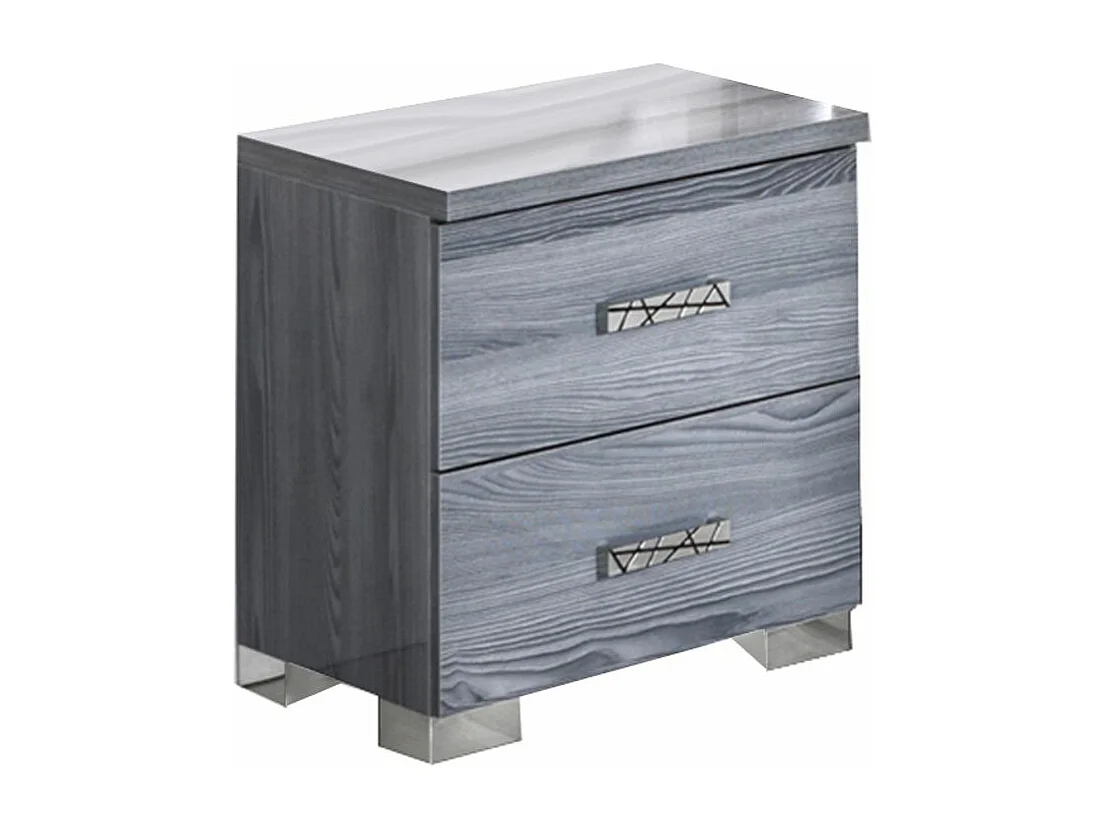 Chevet design bois laqué gris clair et pieds acier chromé Dezina