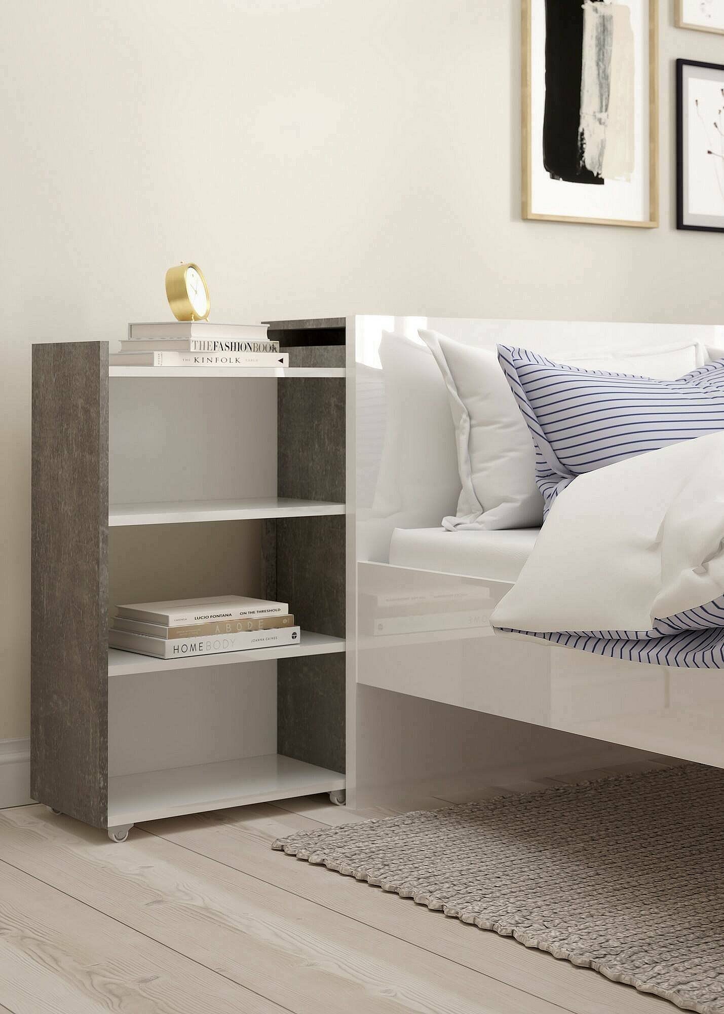Chevet Azar, Commode basse, Table de nuit, Étagère de chevet, 50x40 h50 cm, Ciment et blanc brillant