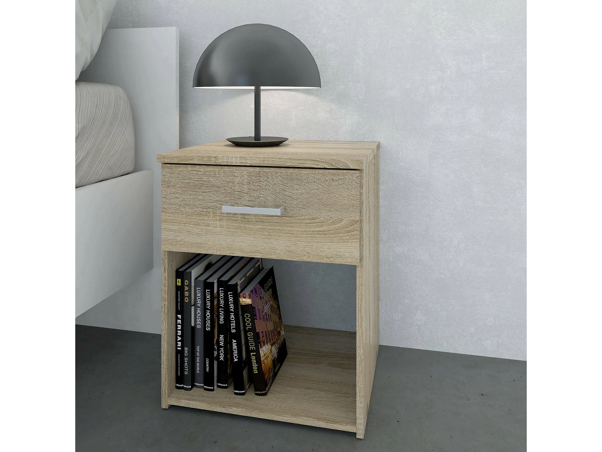 Chevet Antlia, Commode basse, Table de nuit, Étagère de chevet, 60x40h61 cm, Chêne