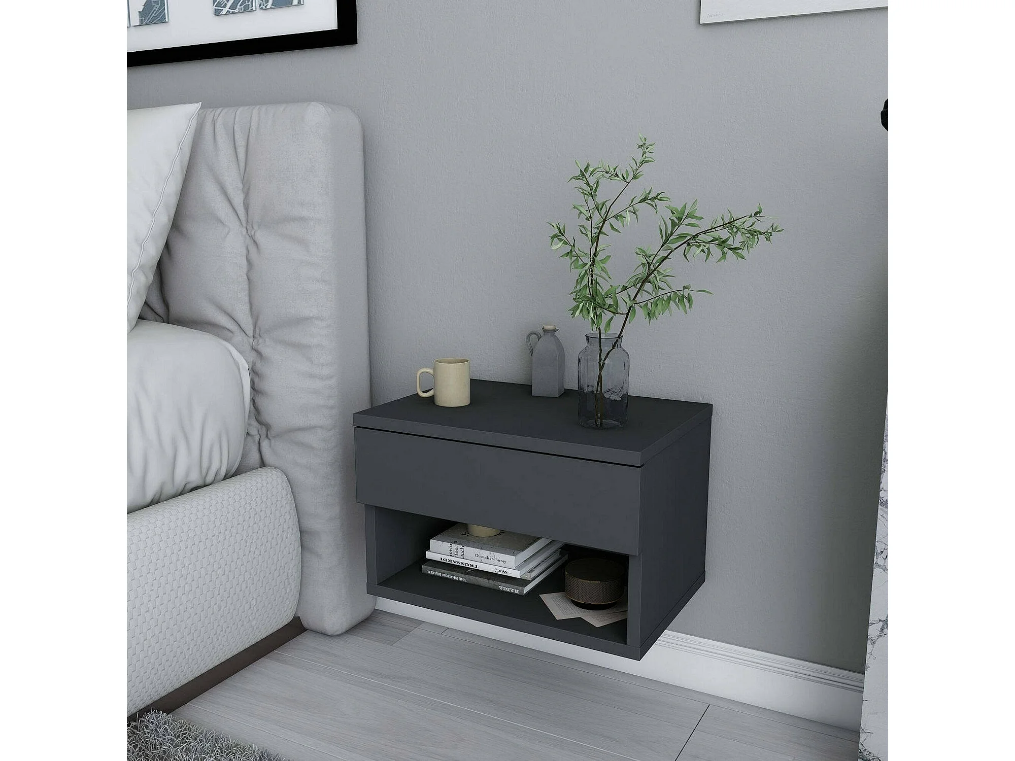 Chevet Pleiades, Commode basse, Table de nuit, Étagère de chevet, 45x29h32 cm, Anthracite