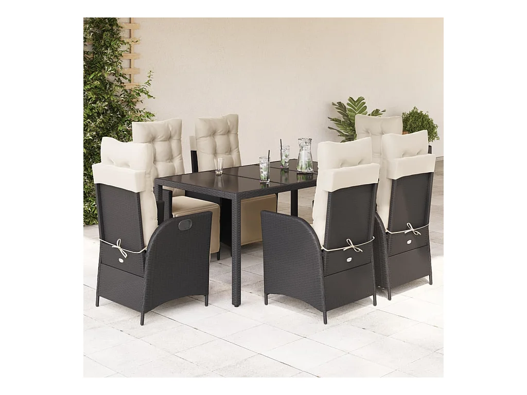 Vrikja Ensemble à manger de jardin coussins 7pcs Noir Résine tressée