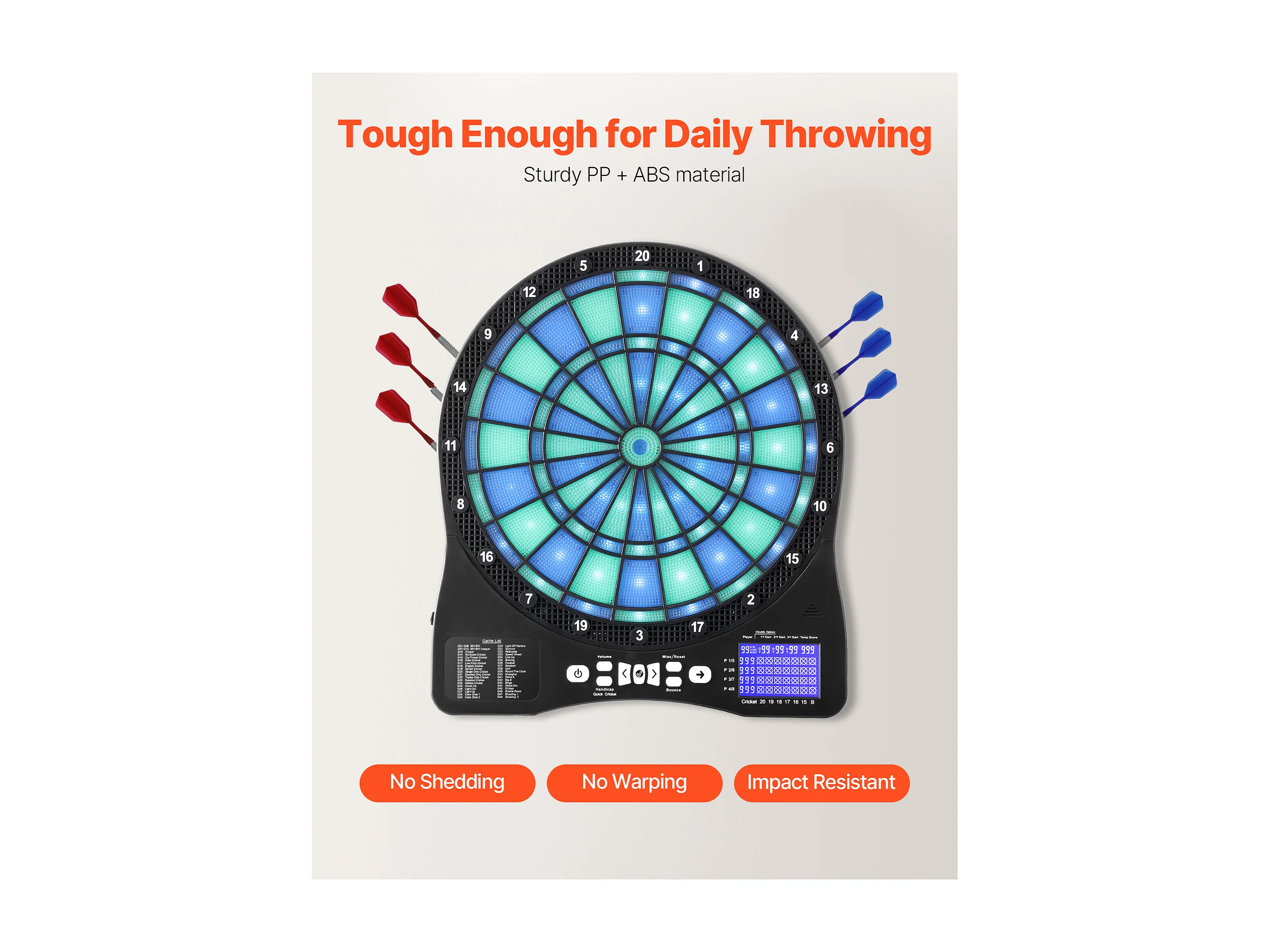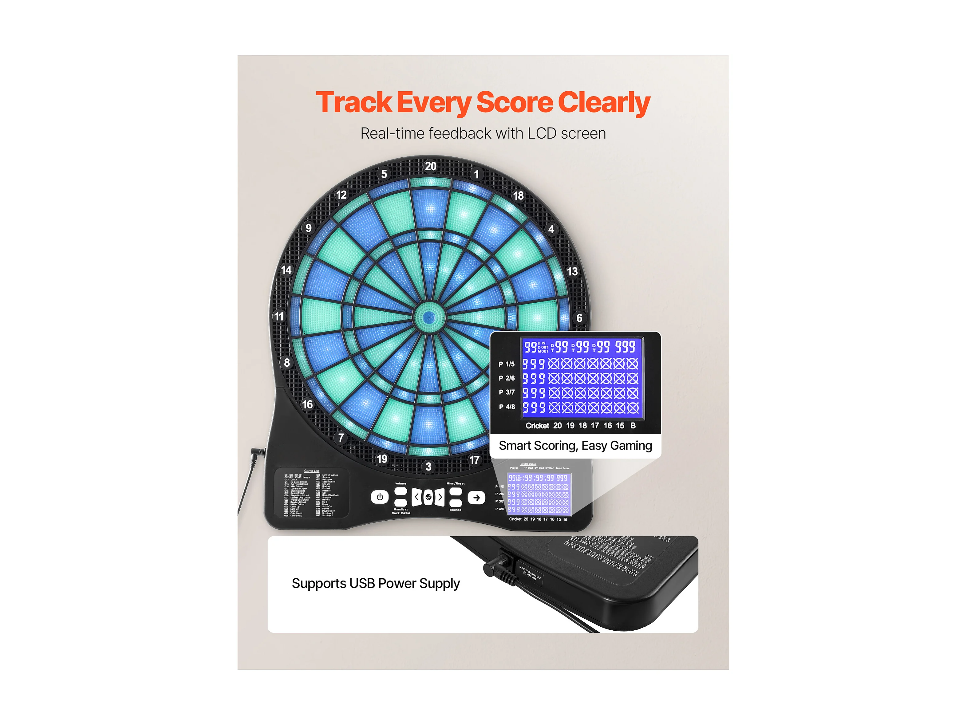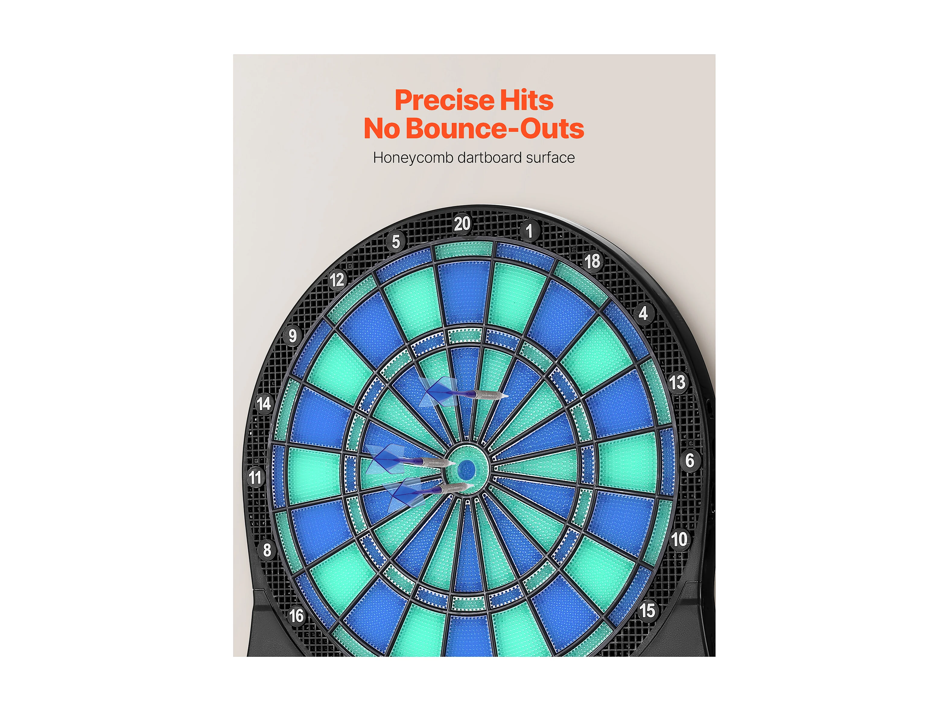 Cible de Fléchettes Électronique SucceBuy pour 8 Joueurs, Planche à Fléchettes Éclairée par LED avec 48 Jeux et Plus de 500 Variantes, 6 Tiges de Fléchette