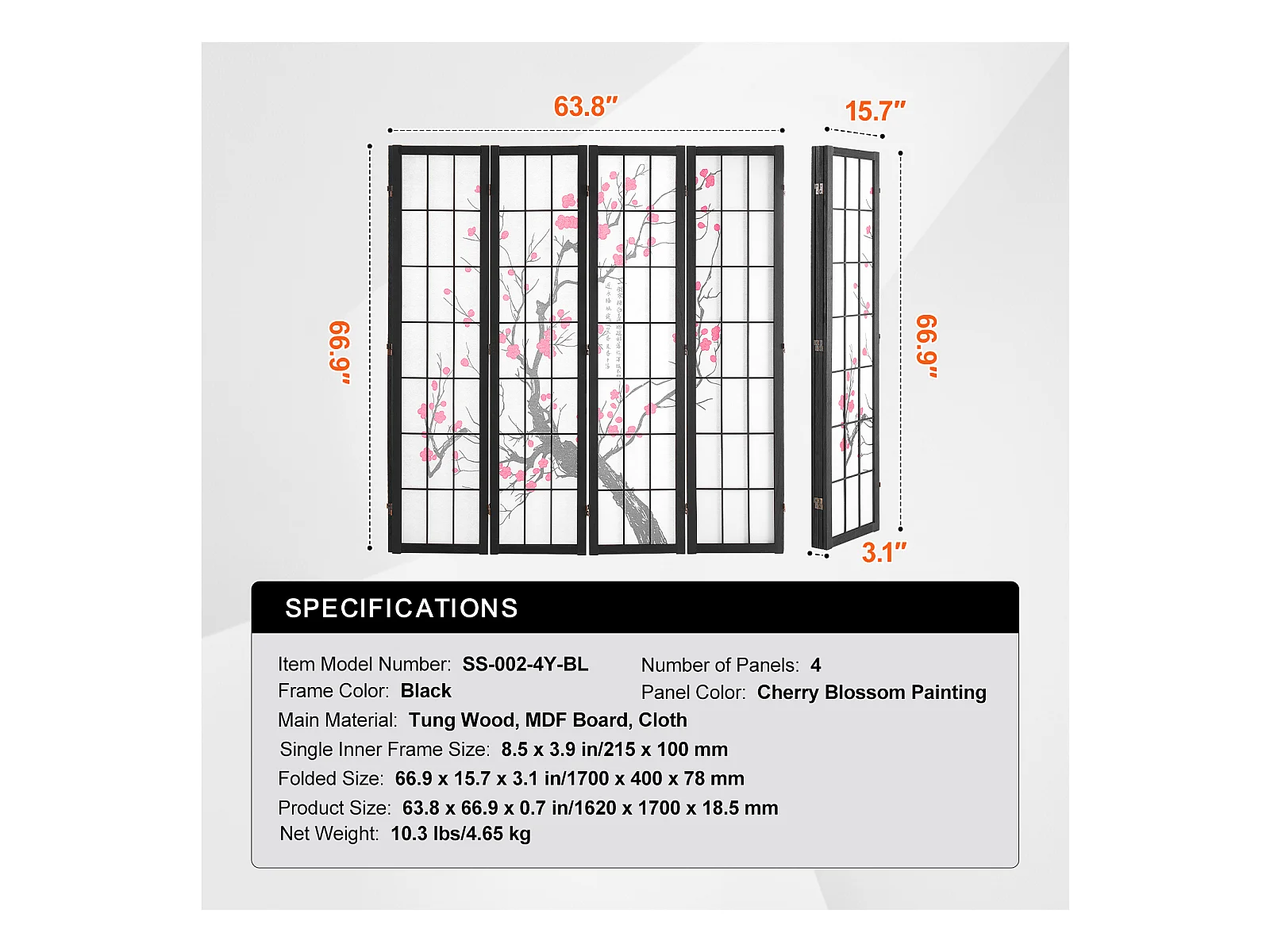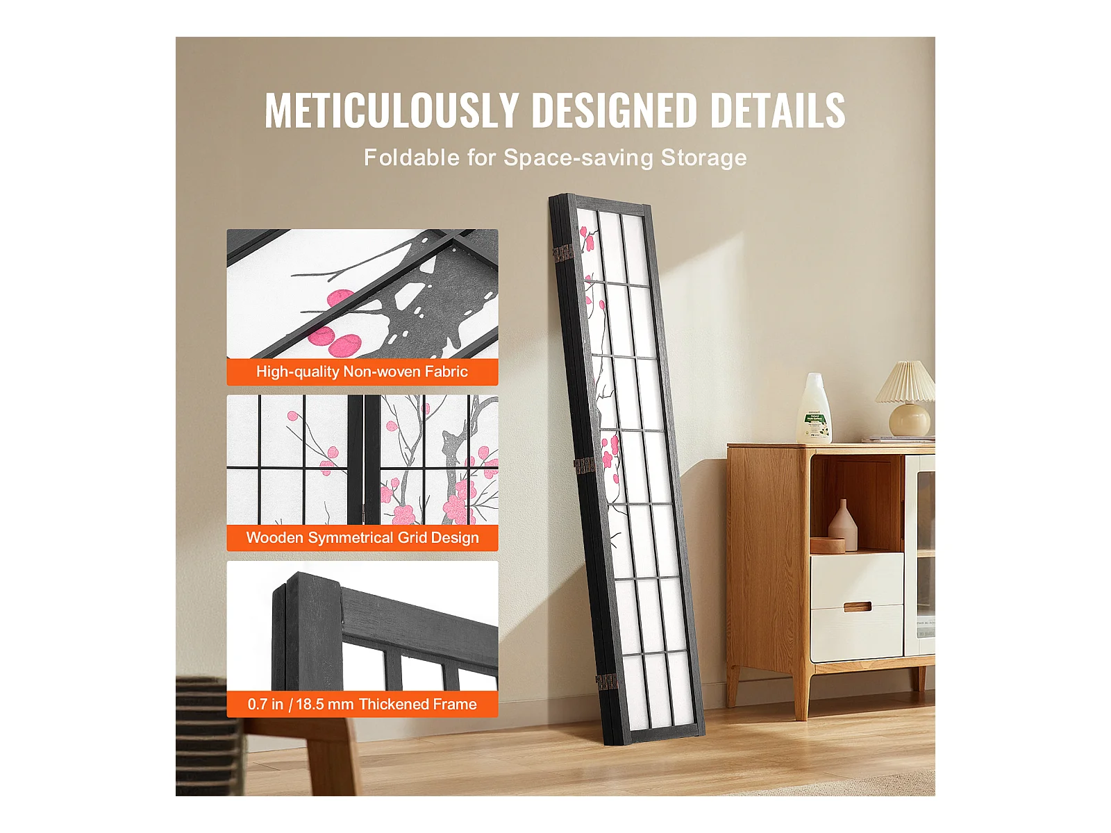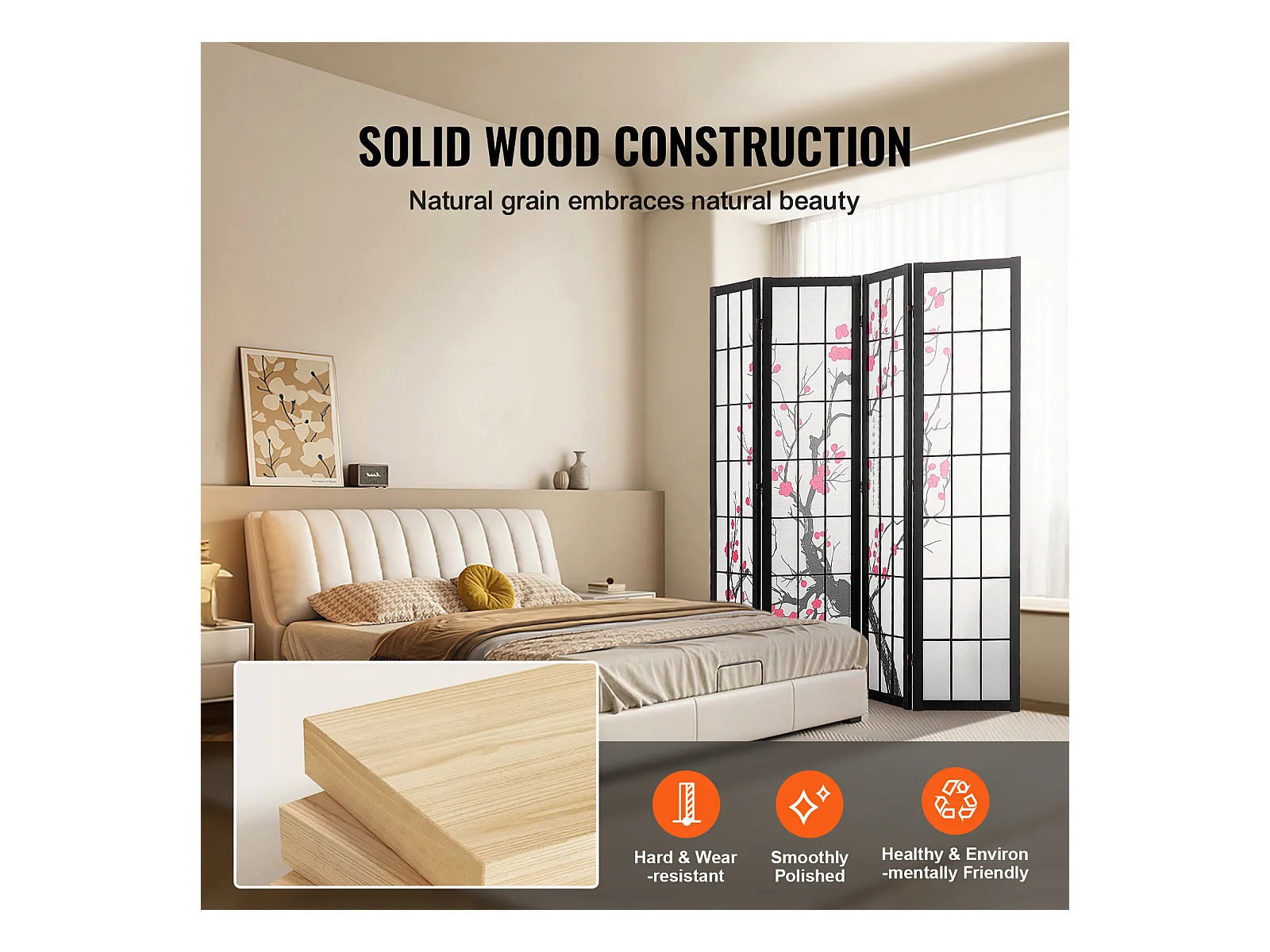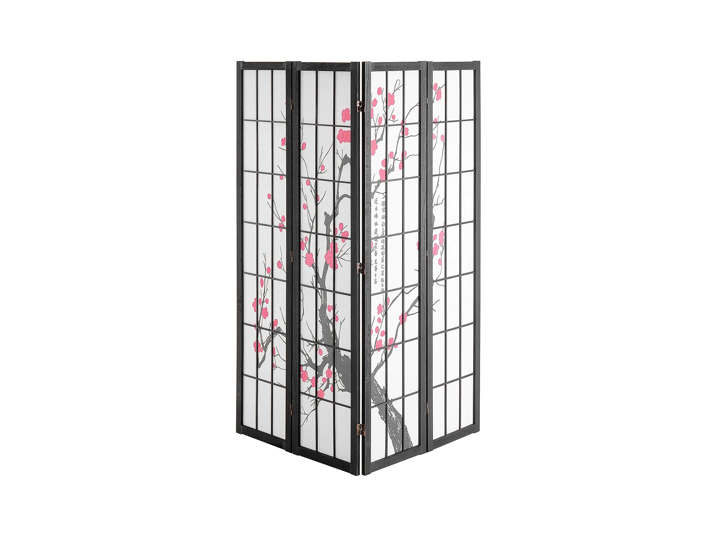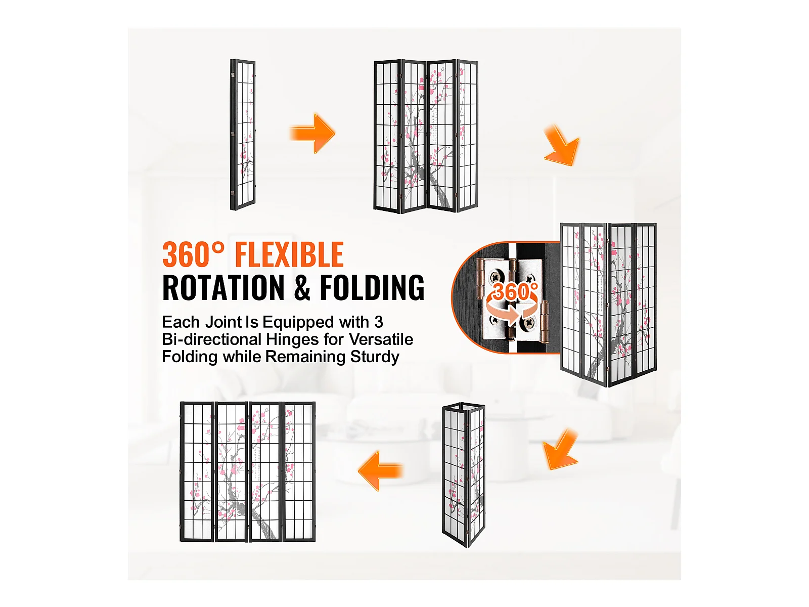 Cloison de Séparation SucceBuy, Cloison de Séparation Japonaise Paravent à 4 Panneaux Fleur de Cerisier, Portable, en bois pivoter à 360°, pour Séparation de Pièce