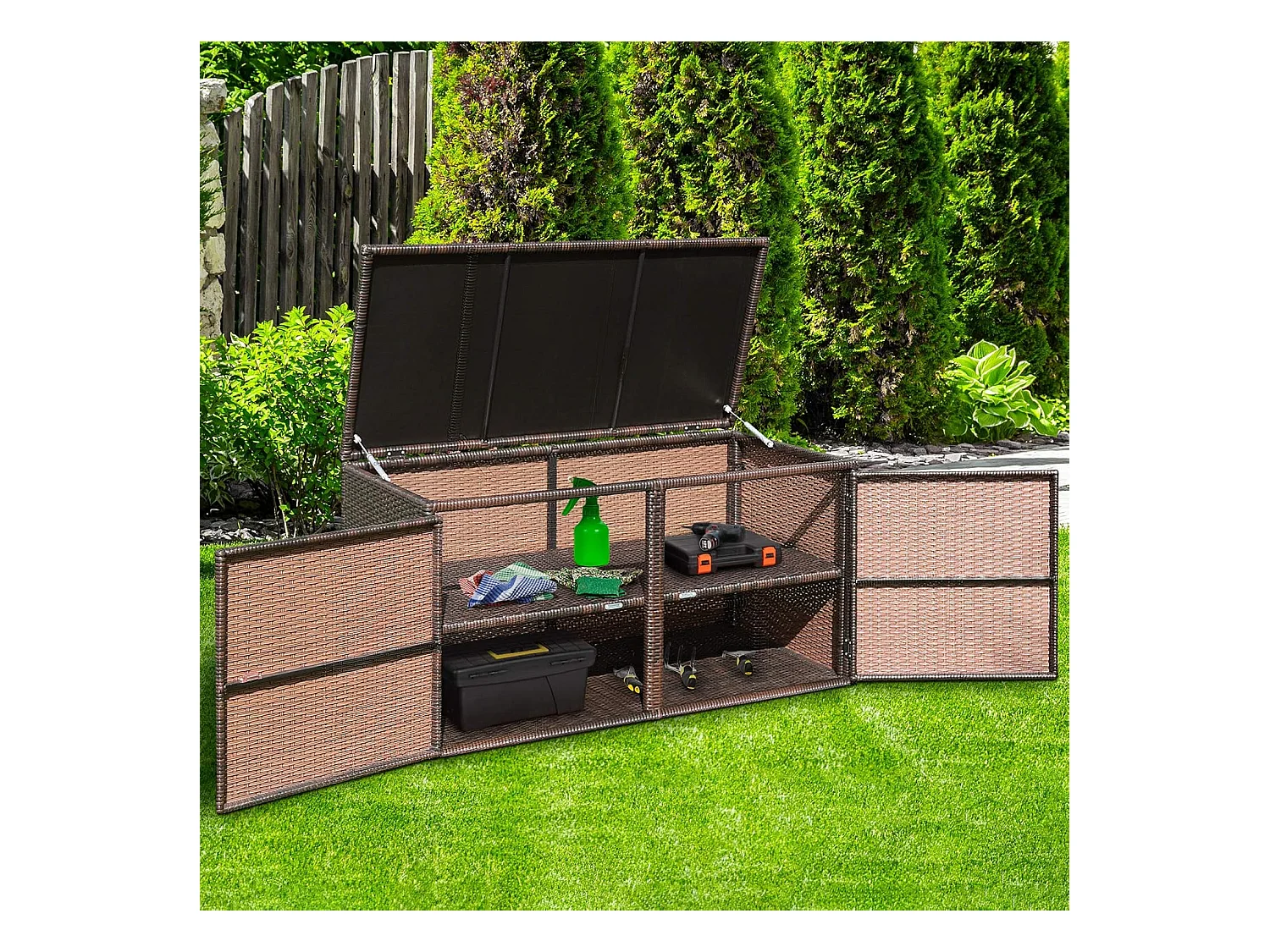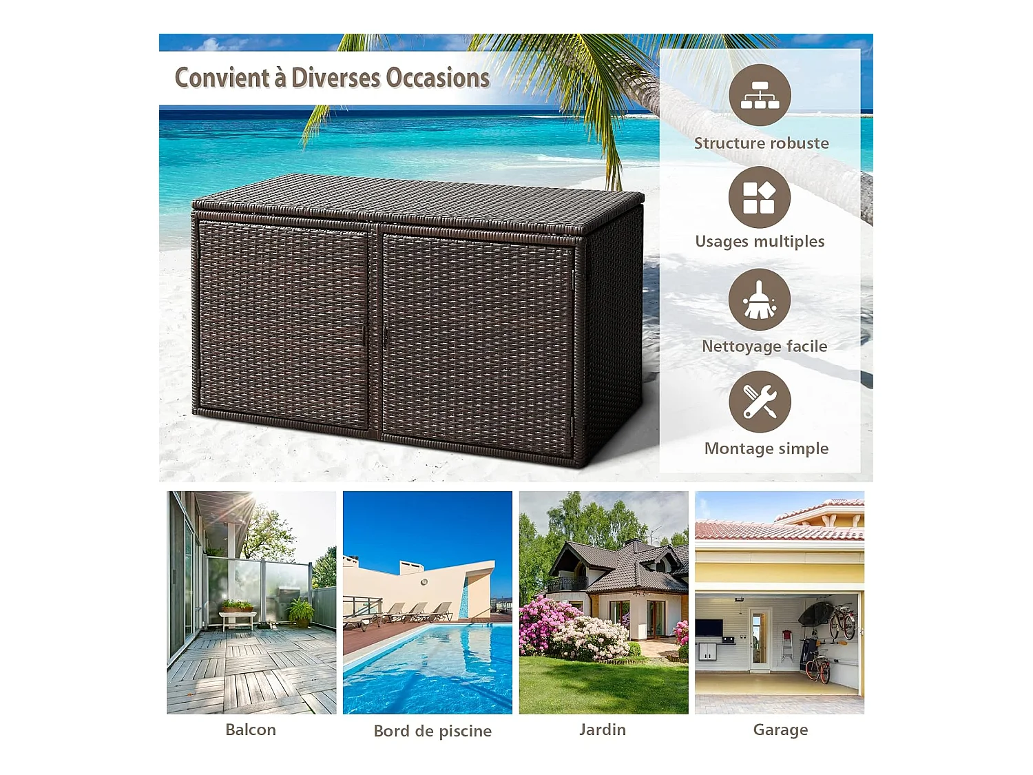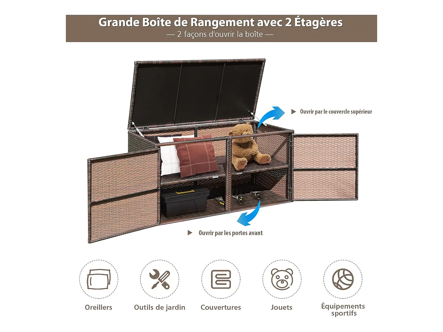 Coffre de Rangement en Résine Tressée 318 L, Boîte de Rangement Jardin avec 3 Portes Étagères Amovibles Grand Bac Étanche (Marron)
