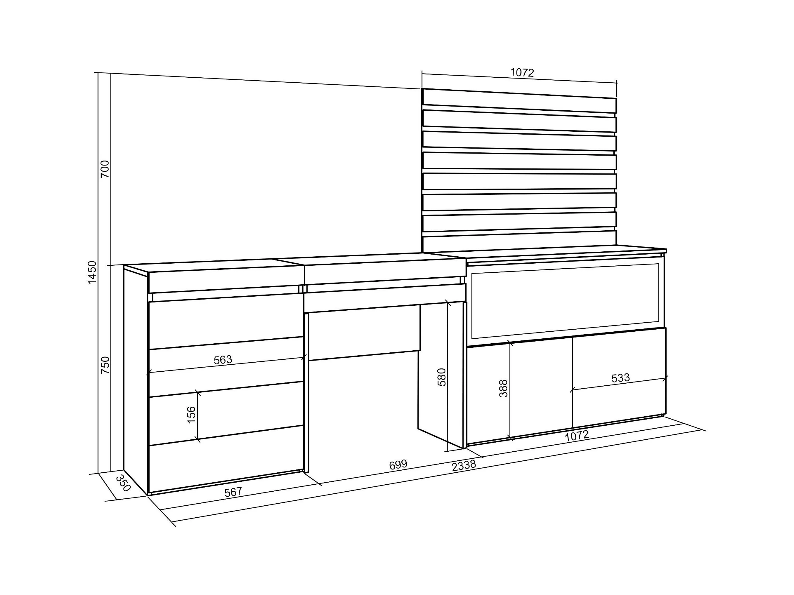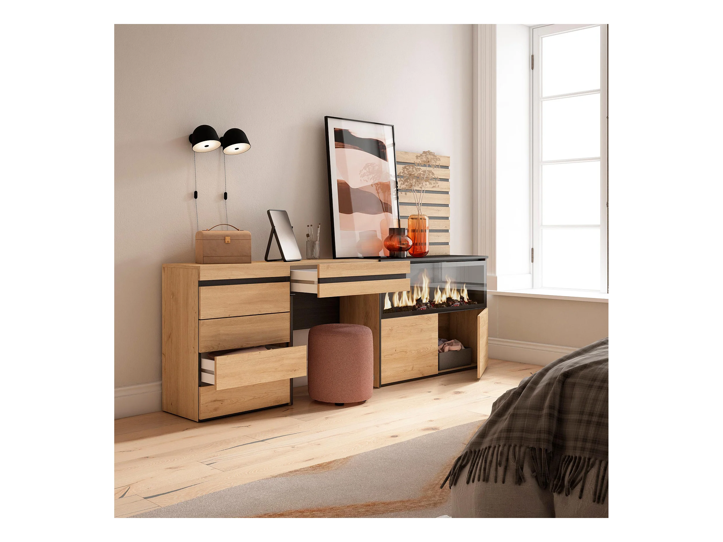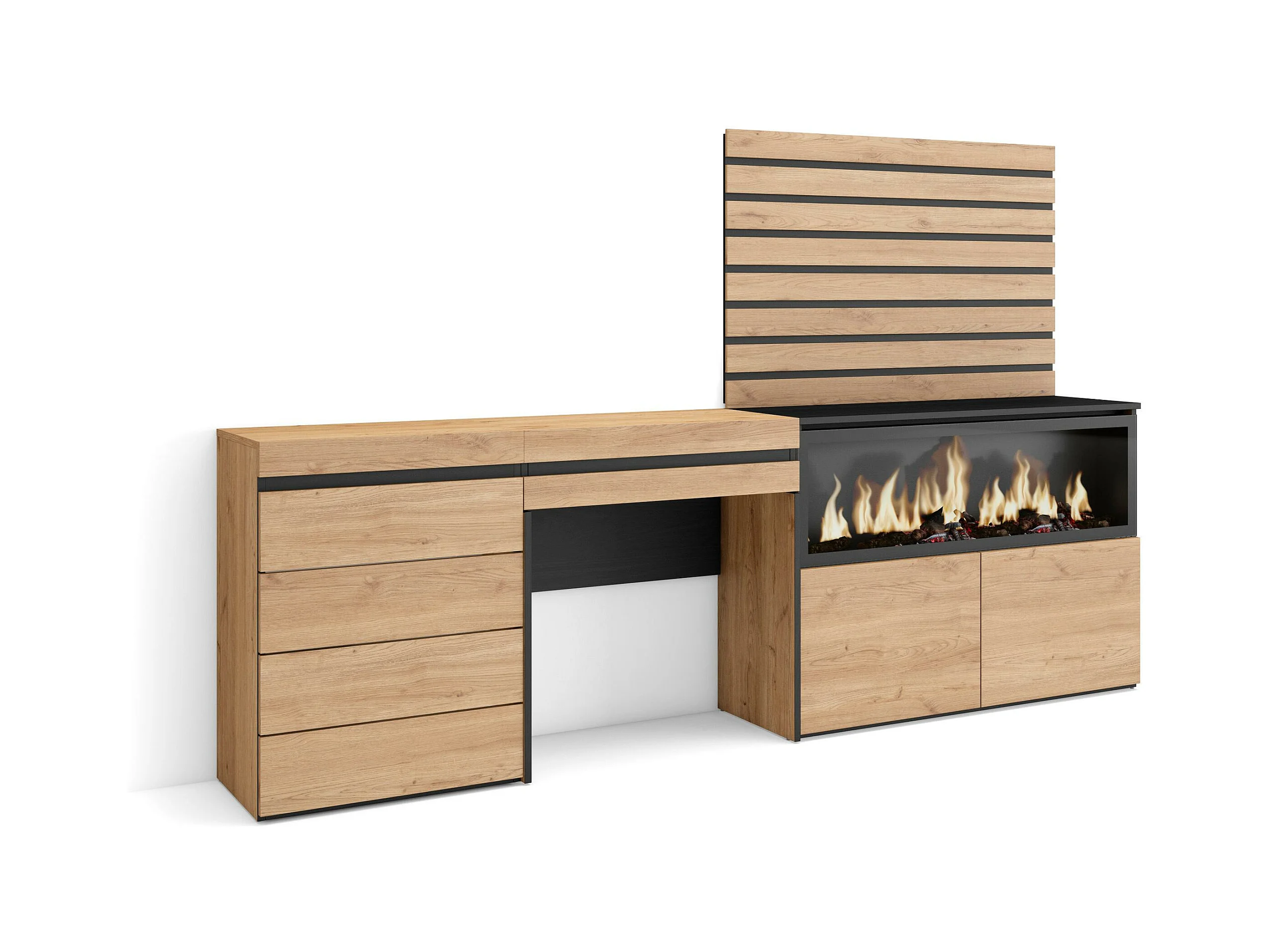 Coiffeuse, 234x35x145 cm, Avec tiroir, Cheminée électrique XXL, Commode, Buffet, Panneaux Muraux en Bois, Chêne