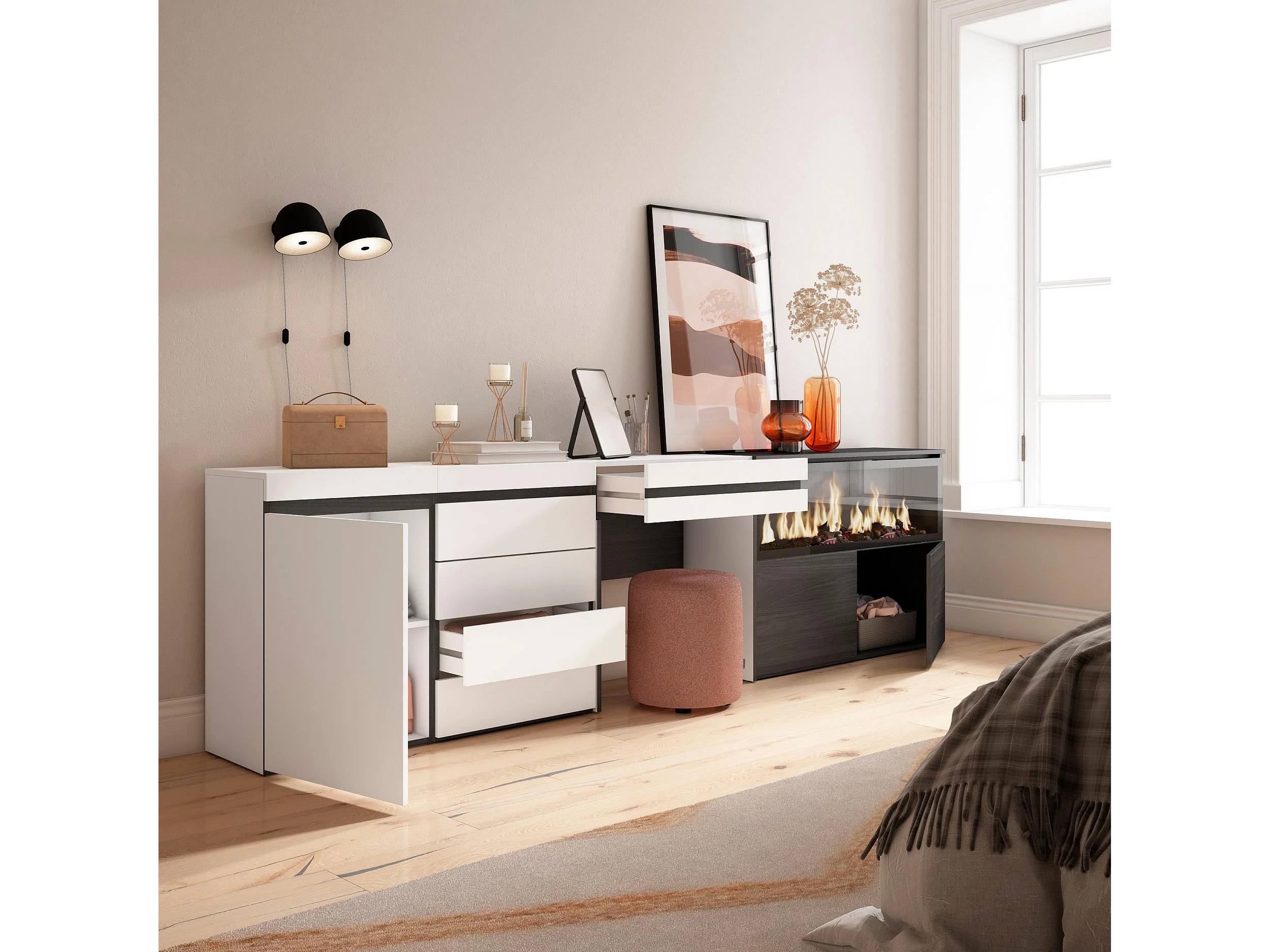 Coiffeuse, 284x35x75 cm, Avec tiroir, Cheminée électrique XXL, Commode, Buffet, Blanc