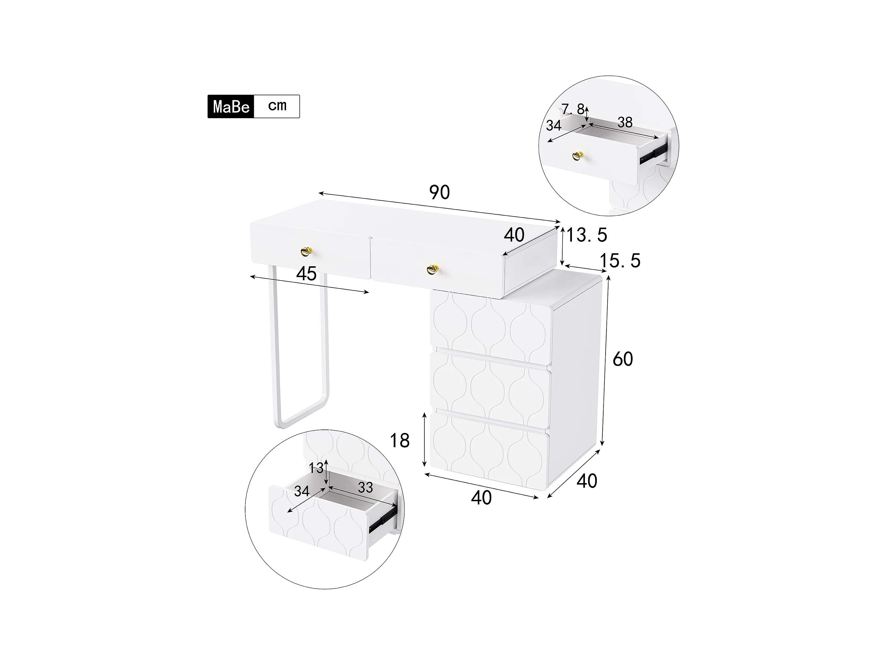Coiffeuse avec table d'appoint,table de bureau avec 6 tiroirs,poignées plaquées or