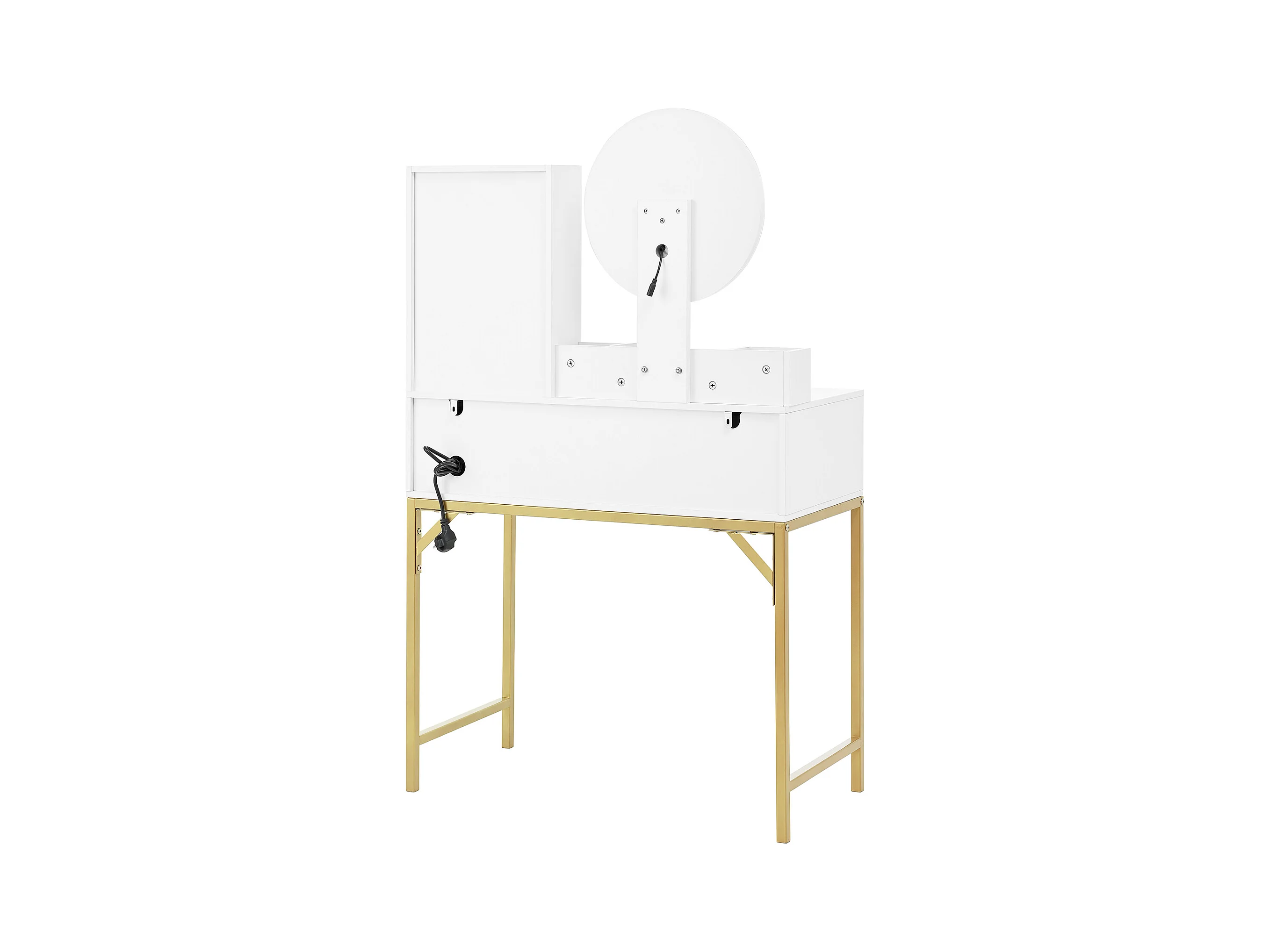 Coiffeuse avec 3 tiroirs, 1 porte et miroir LED, prise de courant, blanc et or, MDF