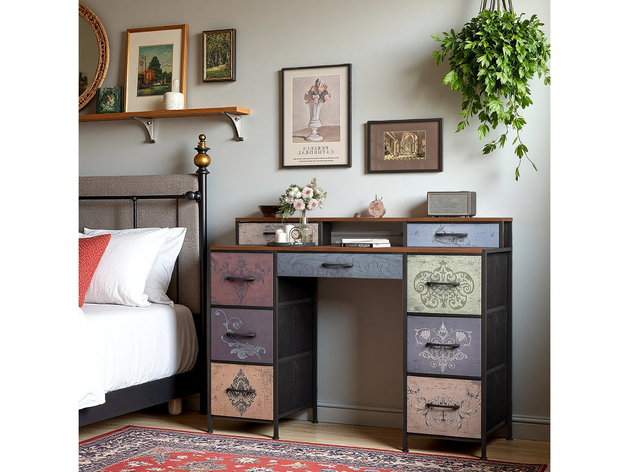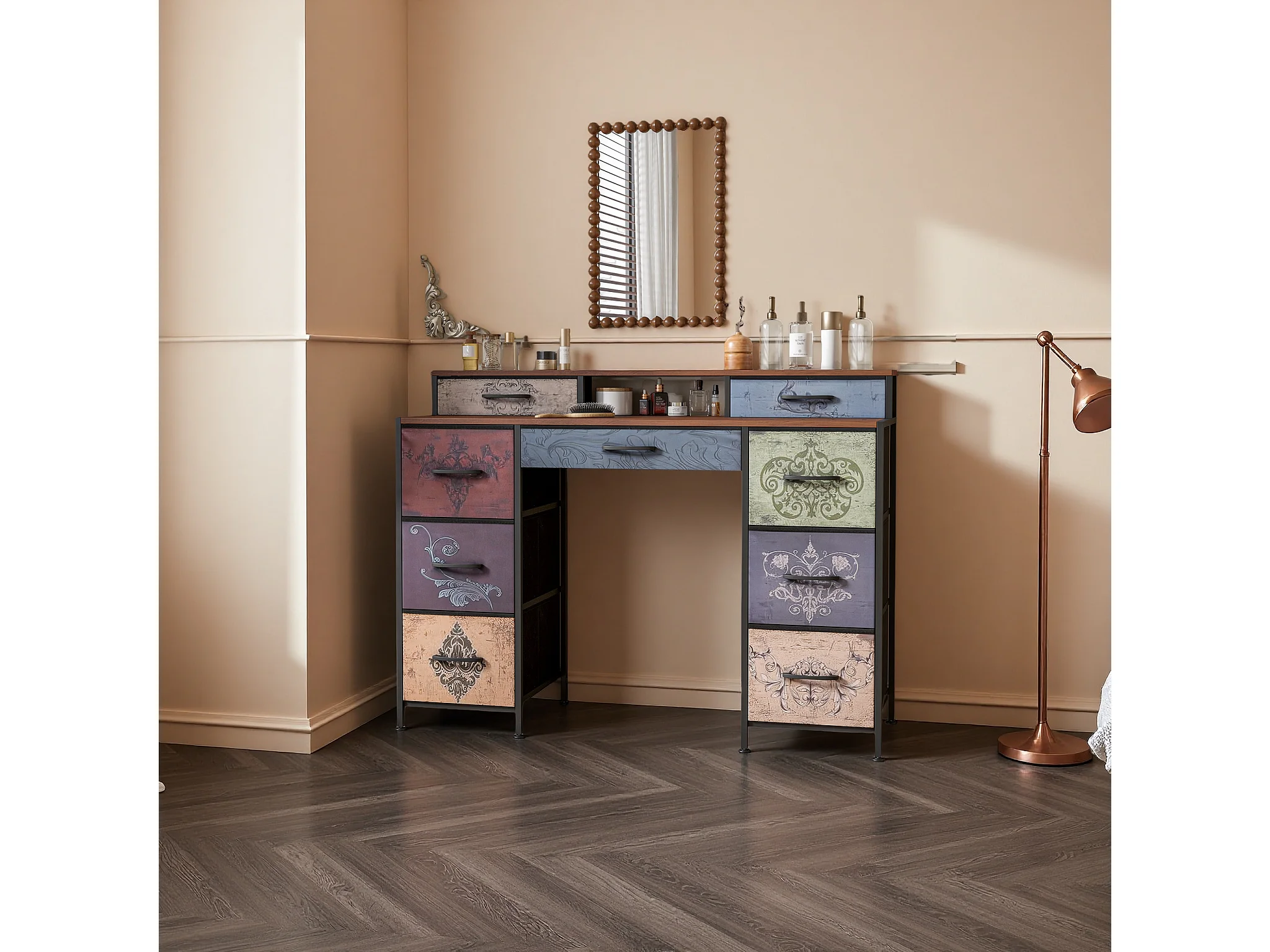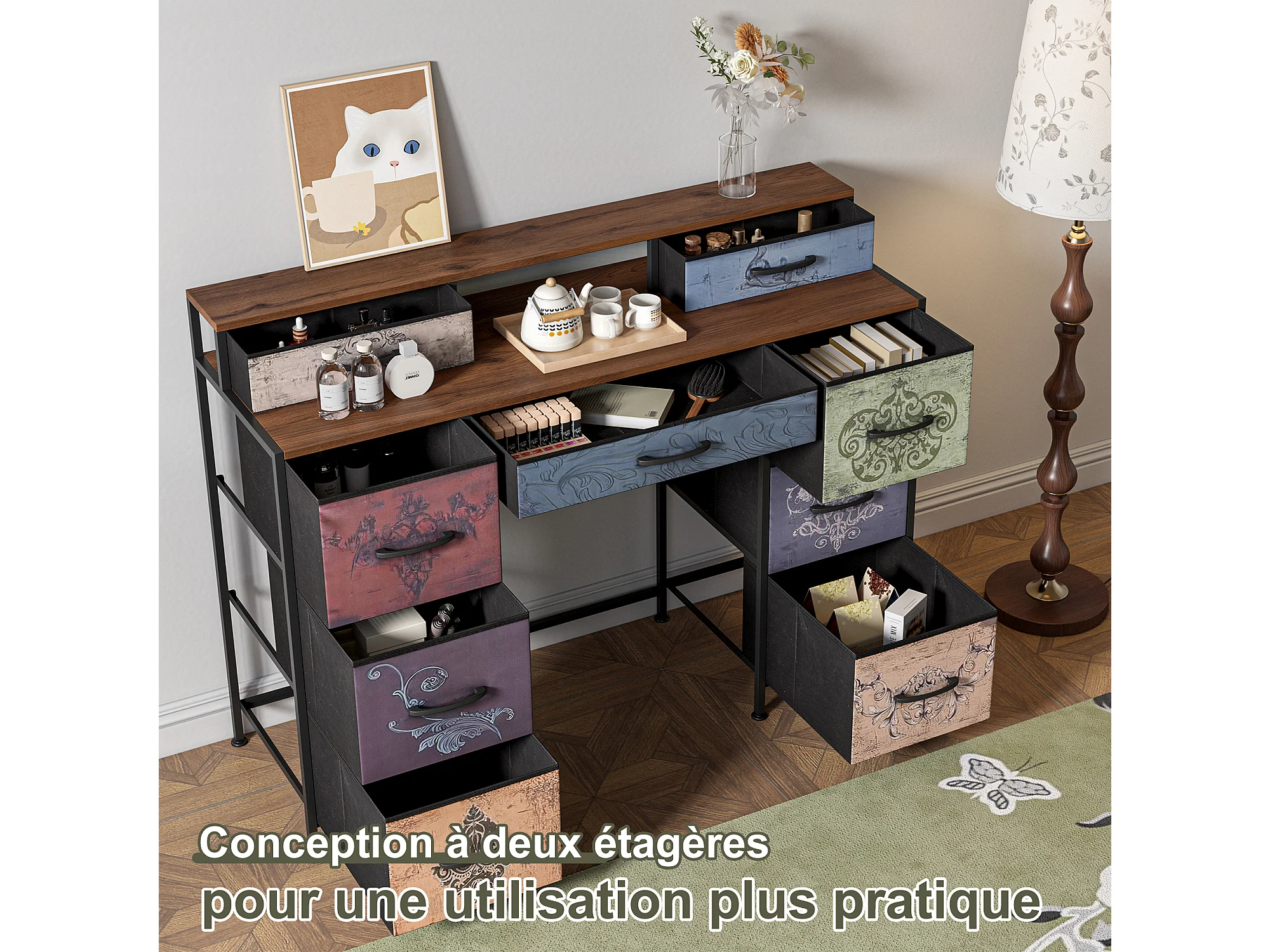 Coiffeuse avec 9 tiroirs, grand espace de rangement, plateau en bois, design double côté, pieds réglables et système anti-basculement