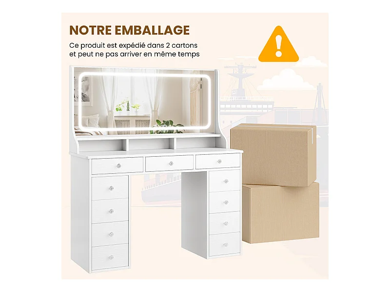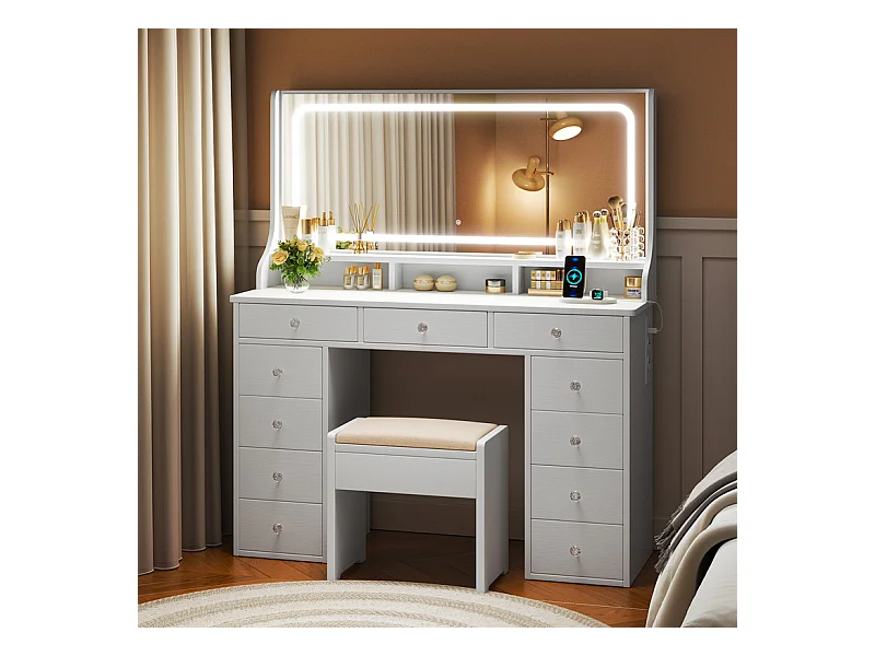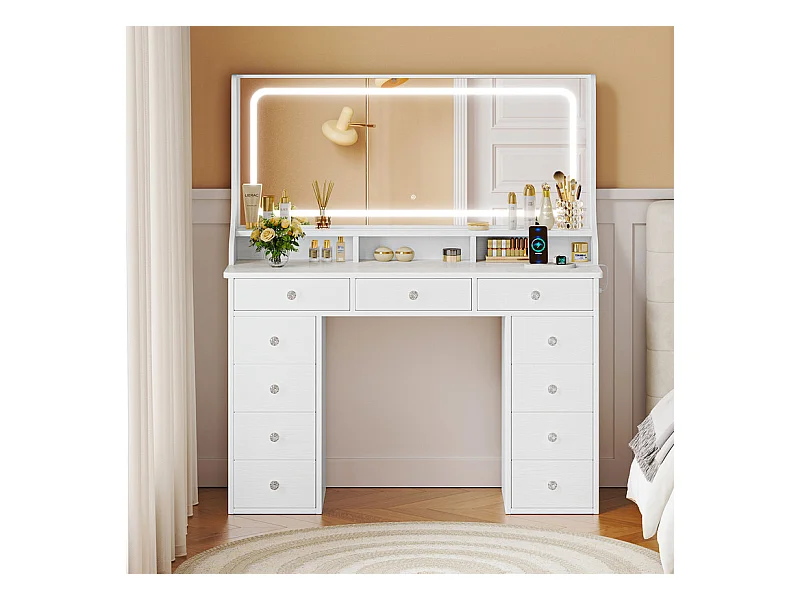 Coiffeuse avec grand miroir et éclairage LED, prise de Courant + USB, luminosité réglable, 11 Tiroirs, Blanc, 110x40x135cm