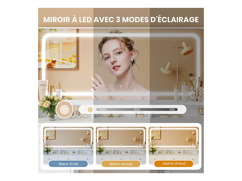 Coiffeuse avec éclairage LED et miroir rectangulaire surdimensionné,éclairage tricolore,armoires,tiroirs,100x45x135cm,Blanc
