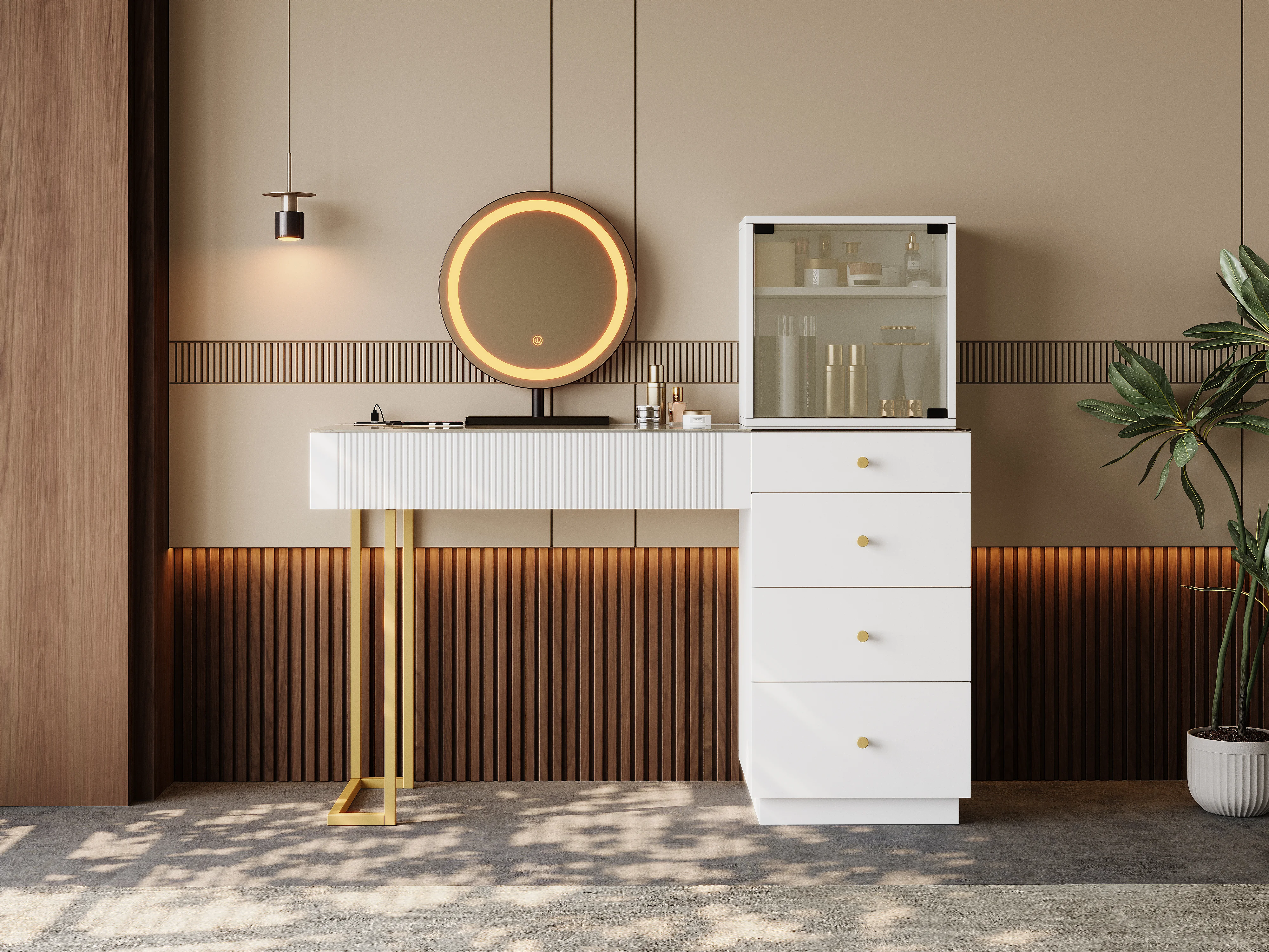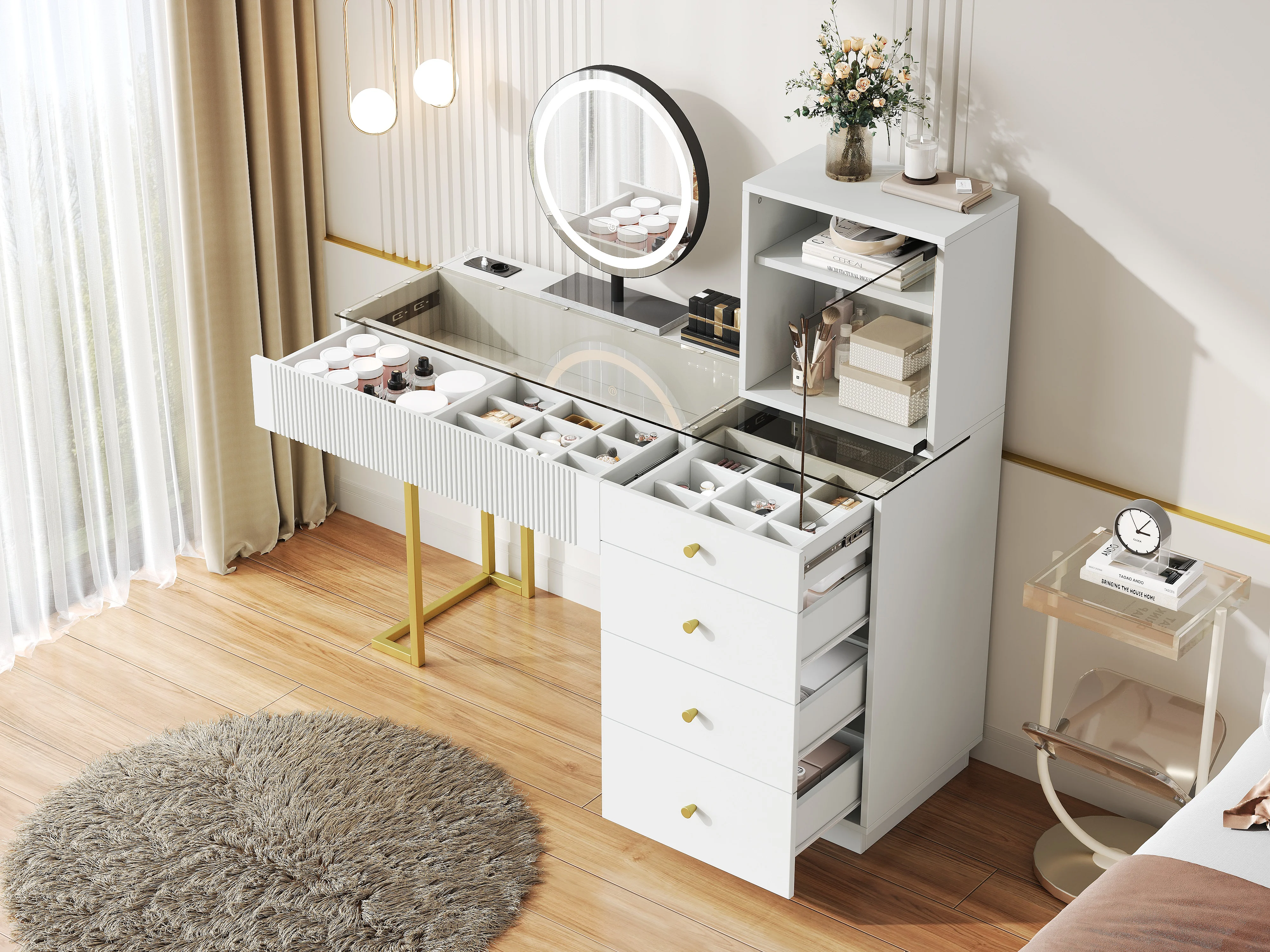 Coiffeuse avec miroir Leds - plateau en verre trempé transparent - avec 5 tiroirs - 120 x 40 x 120 cm - MDF + verre - blanc