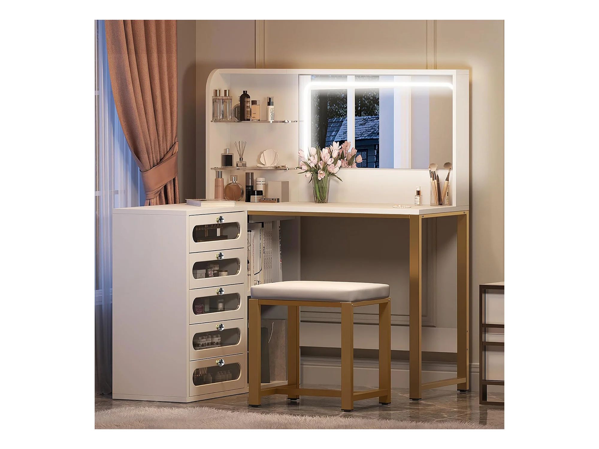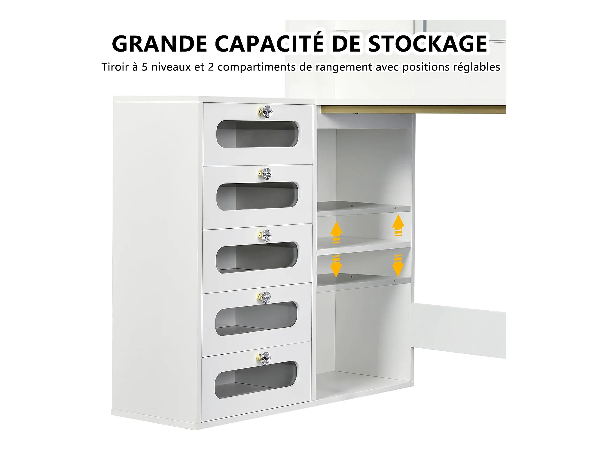 Coiffeuse avec Tabouret, Miroir HD et Lumières LED Réglables, Prise de Courant, 5 Tiroirs, Blanc
