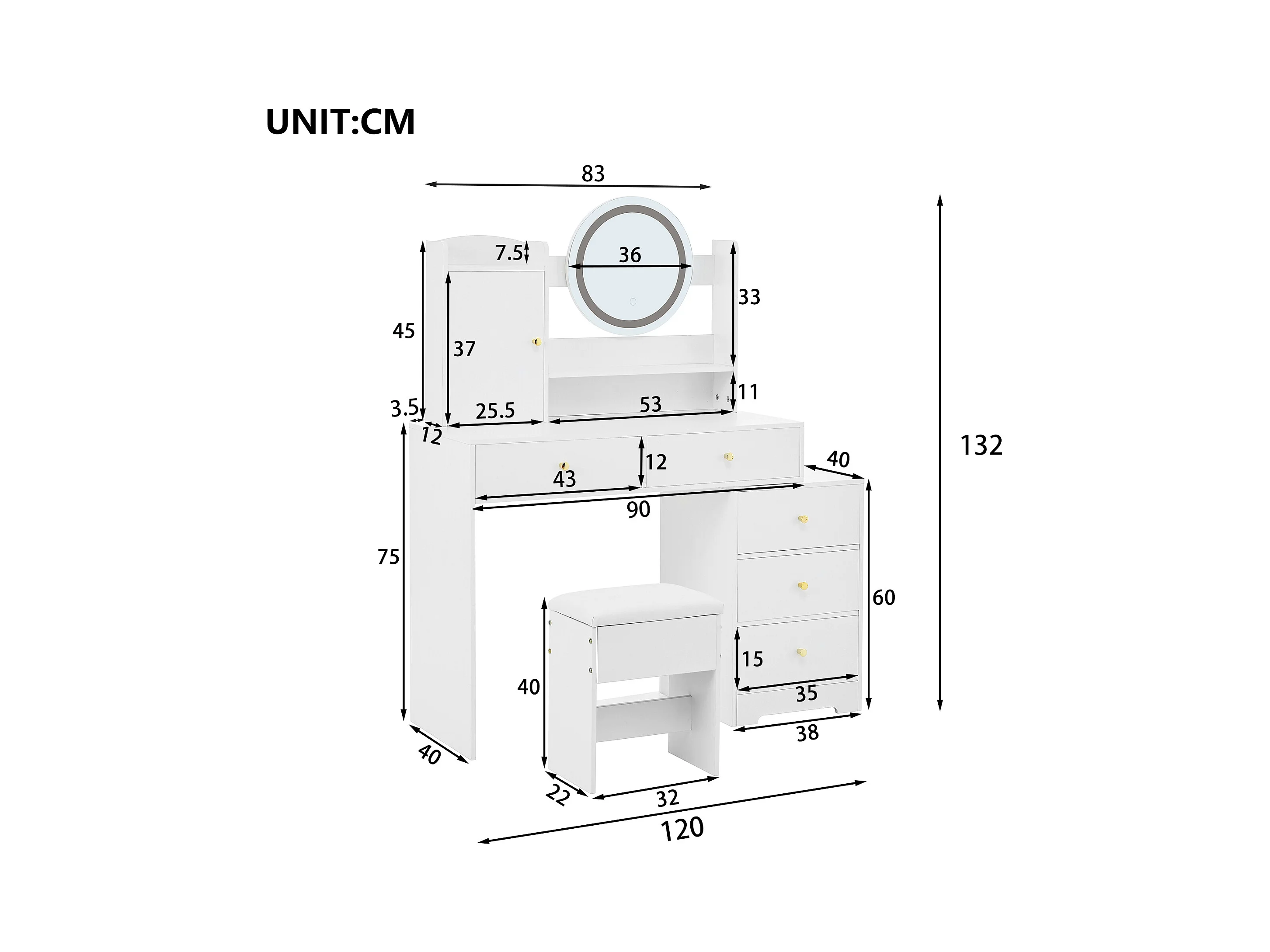 Coiffeuse avec Leds - 90 x 40 x 132 cm - avec 1 tabouret + 5 tiroirs + 1 miroir + 1 porte - MDF - blanc