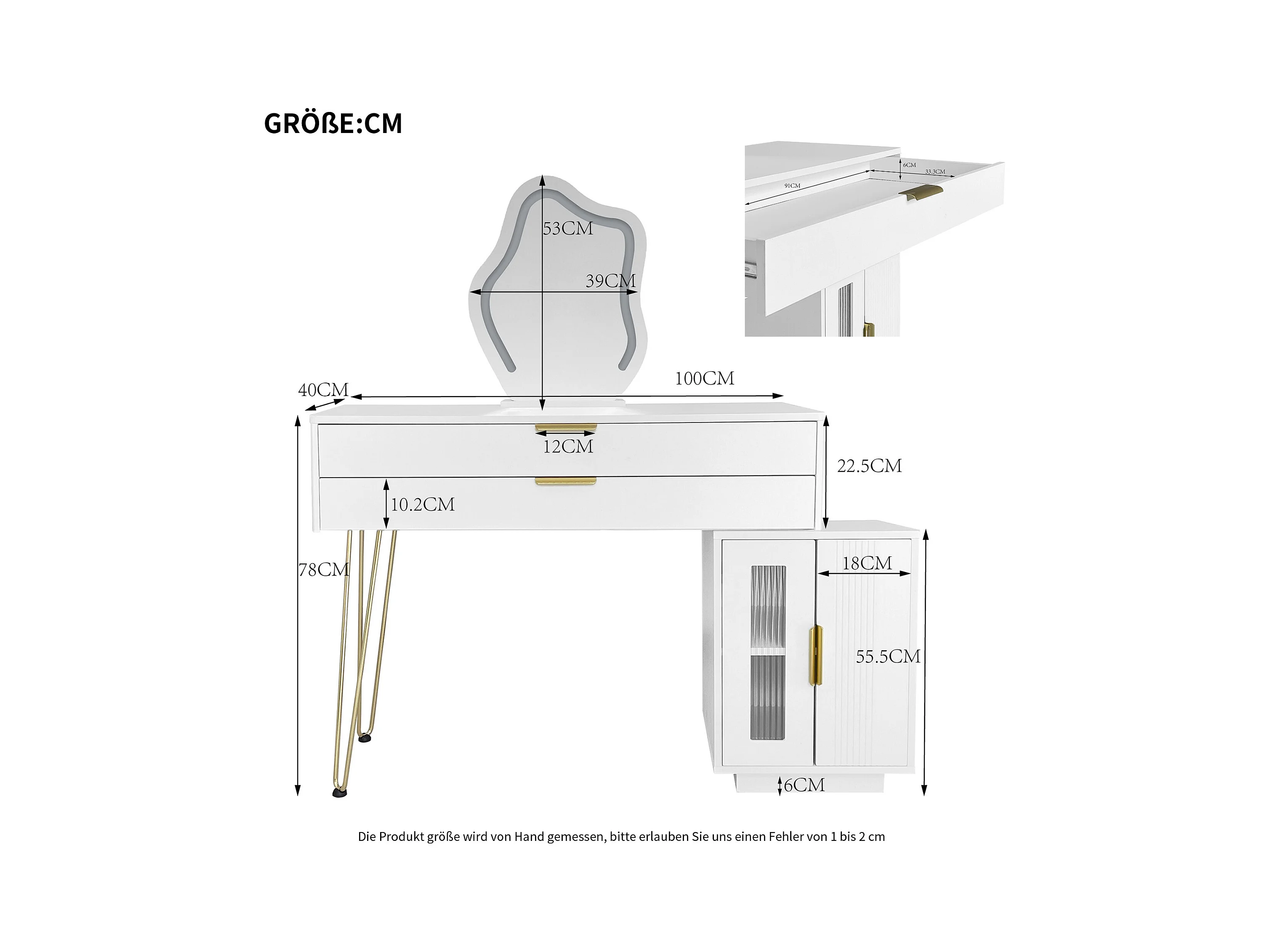 Coiffeuse blanche avec 3 tiroirs de rangement et 1 porte, miroir LED - sans tabouret