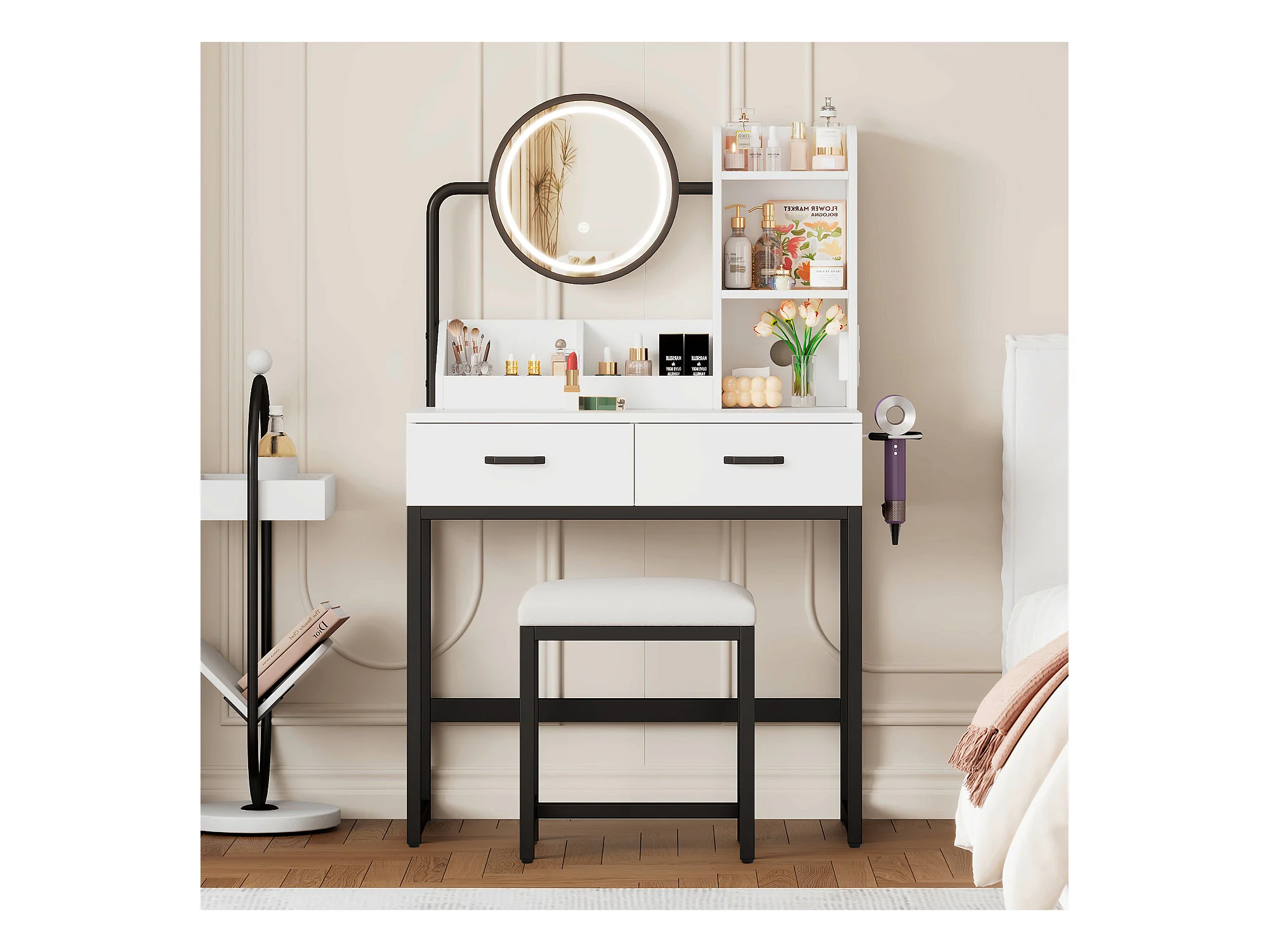 Coiffeuse blanche avec miroir LED et prise de courant, pieds en métal noir - tabouret inclus