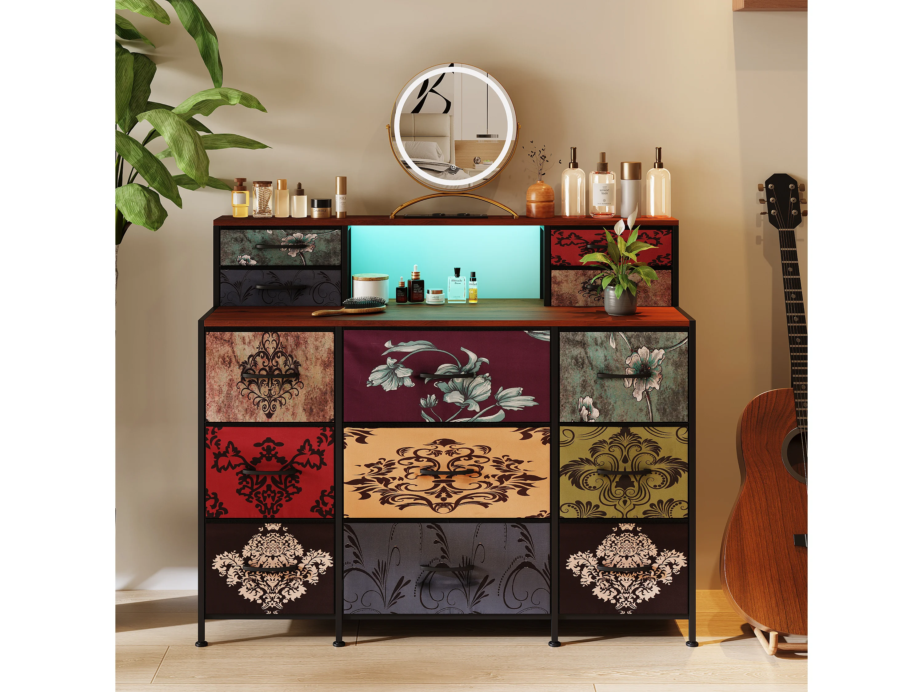 Coiffeuse de Rangement Vintage avec Tiroirs Multiples, LED RGB et Port USB – Grande Capacité, Design Rétro Élégant et Multifonctionnel