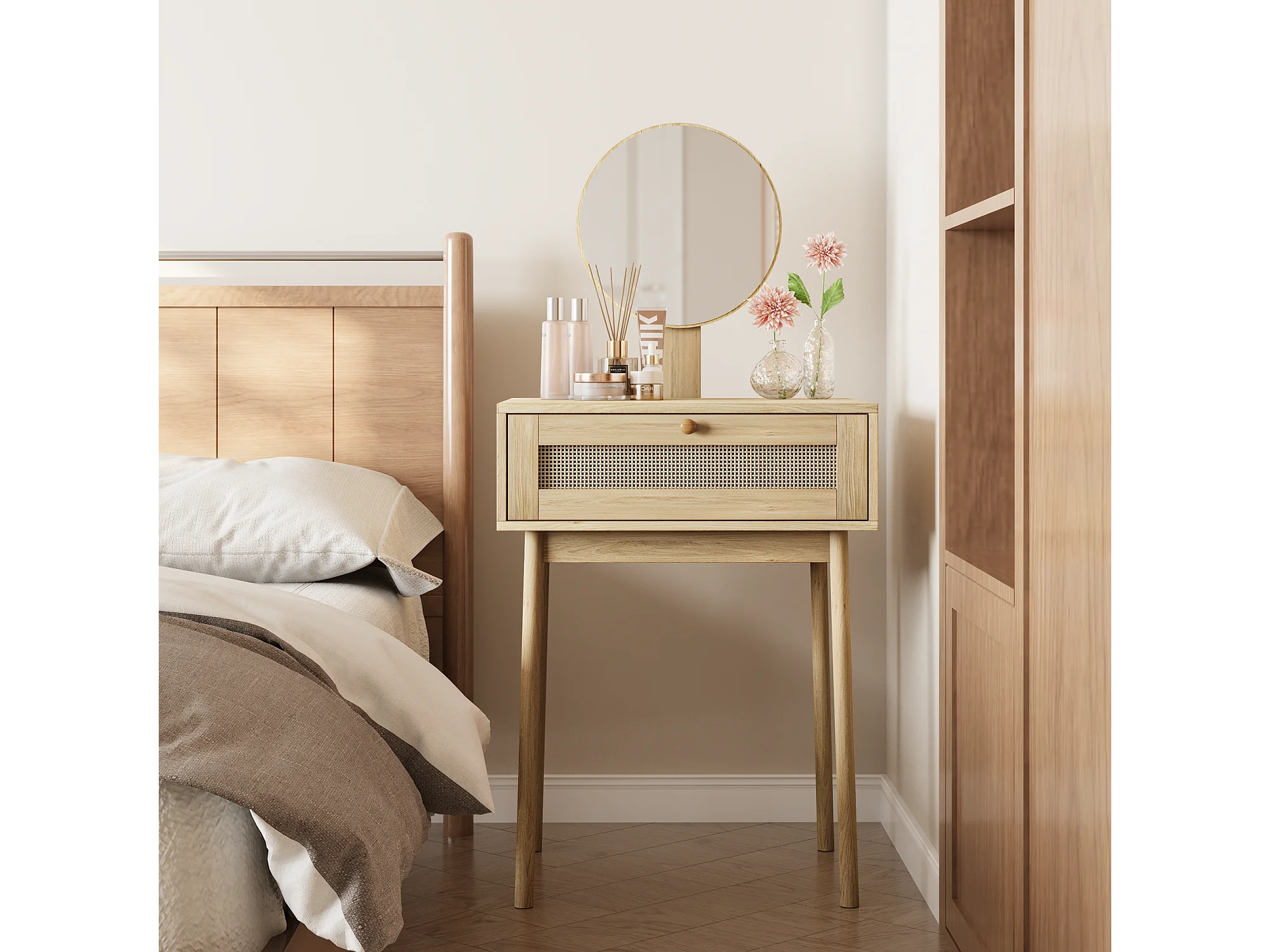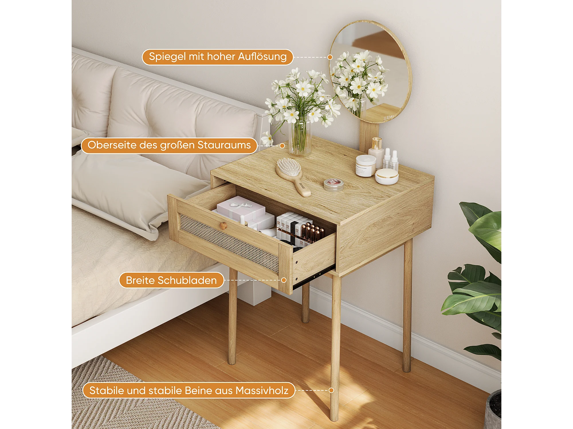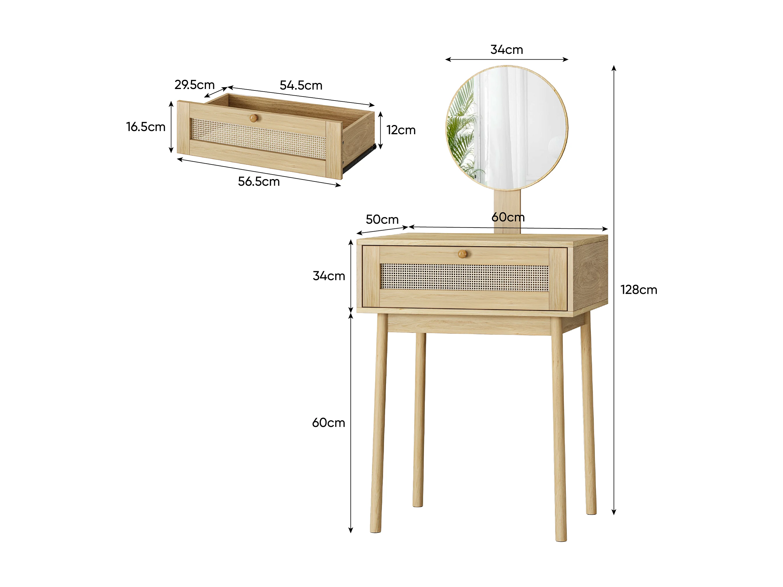 Coiffeuse en rotin avec miroir, design compact et élégant, MDF et verre, chêne (60x50x128 cm)