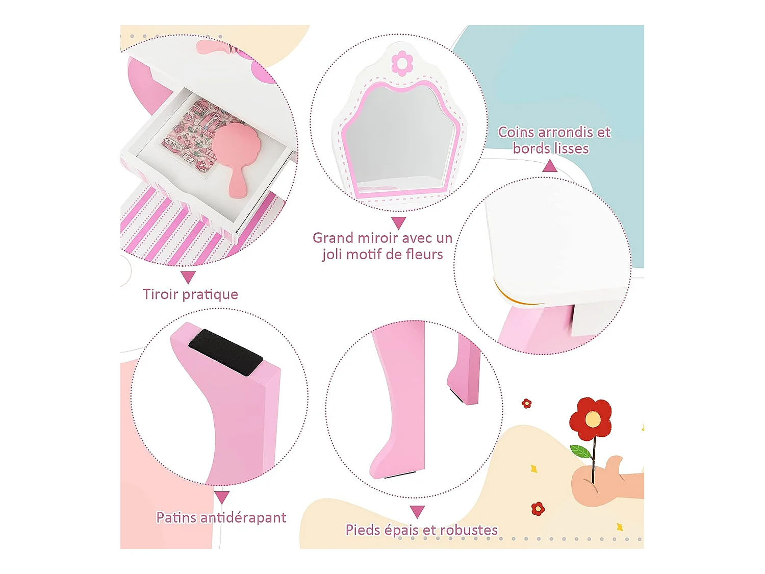Coiffeuse pour Enfants avec Miroir et Tabouret en Bois - Style Princesse Cadeau pour Filles Rose