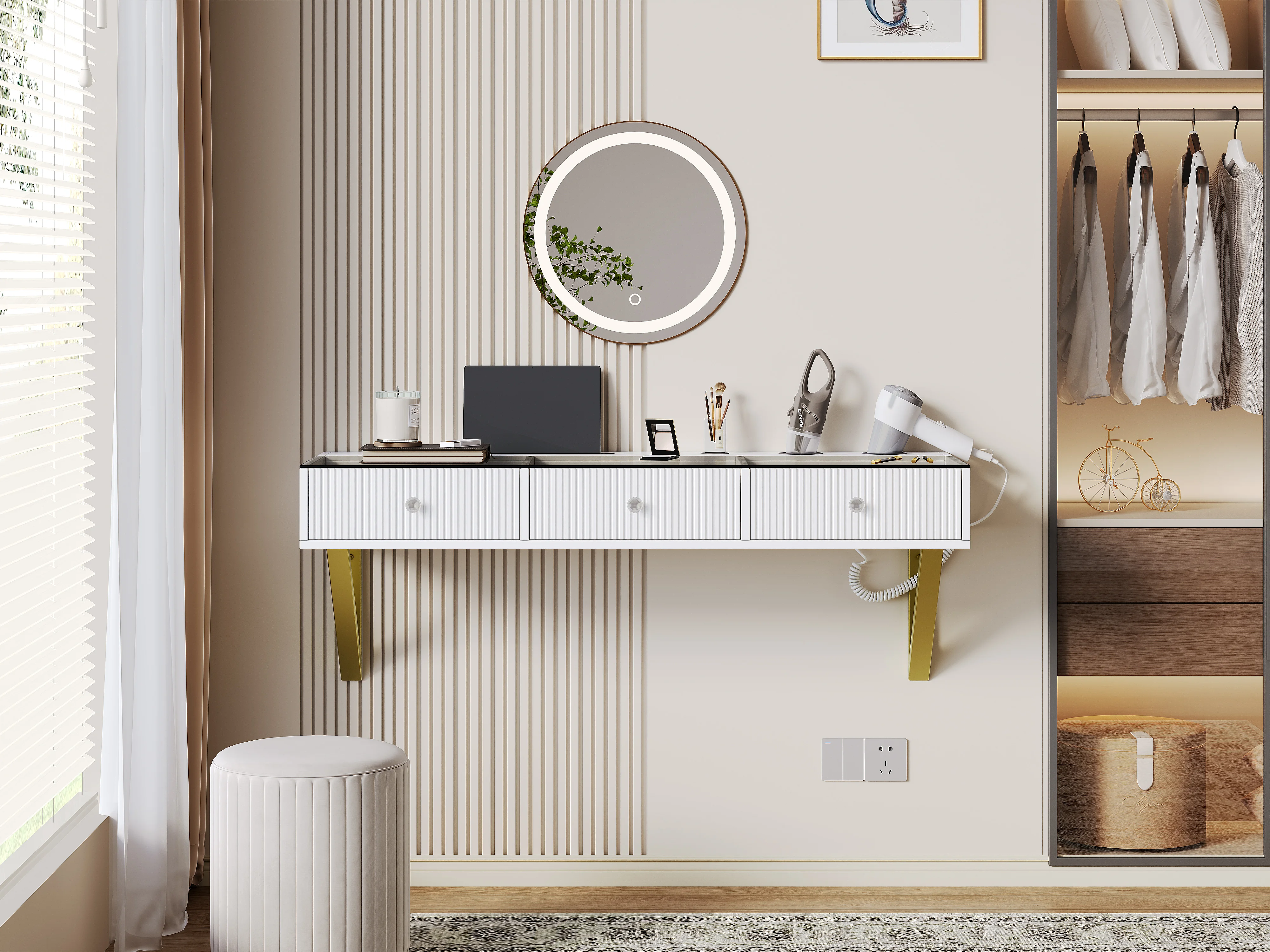 Coiffeuse suspendue 120x40x45cm - avec 3 tiroirs - avec support et porte-gobelet - Blanc (miroir non inclus)