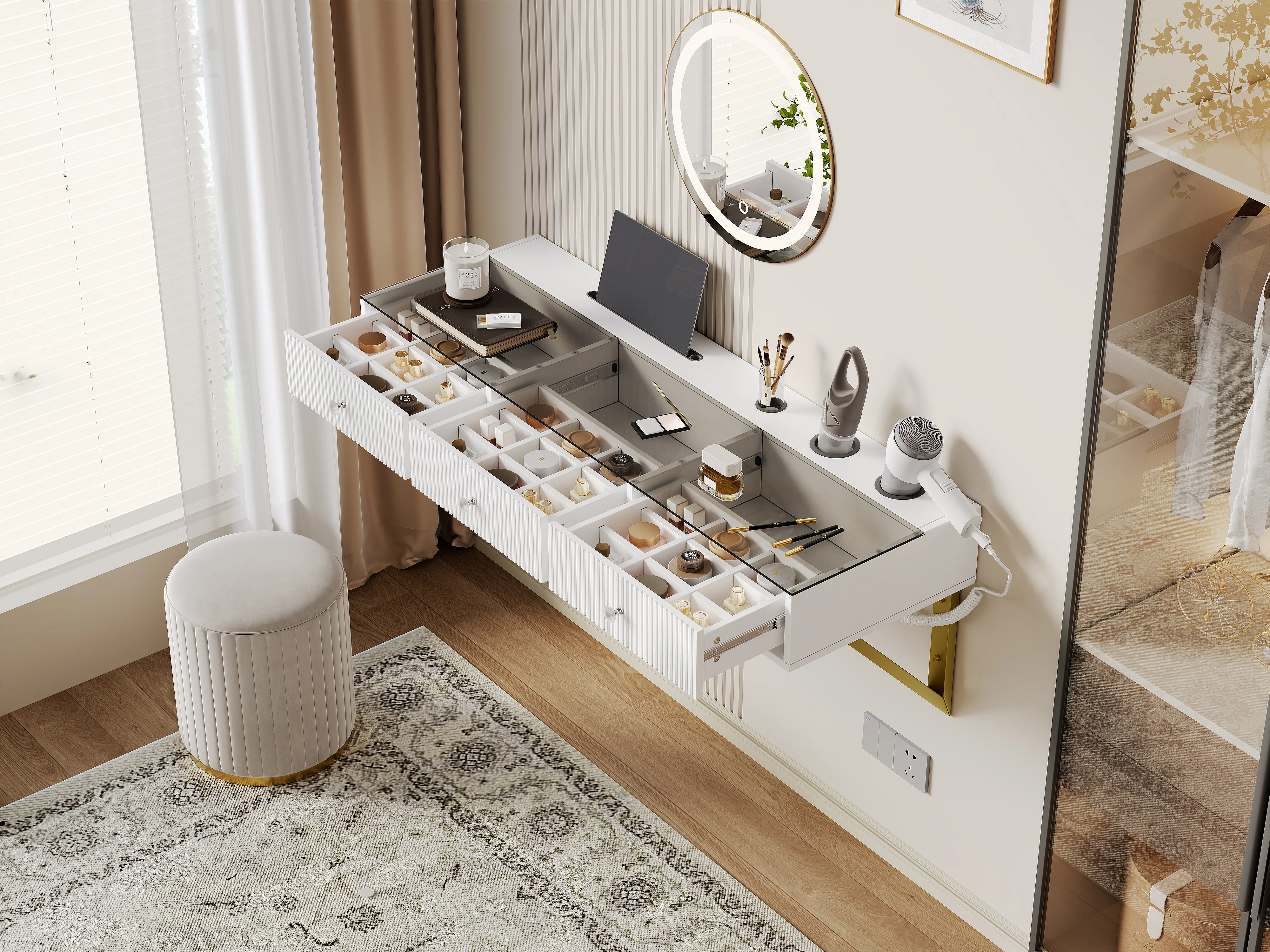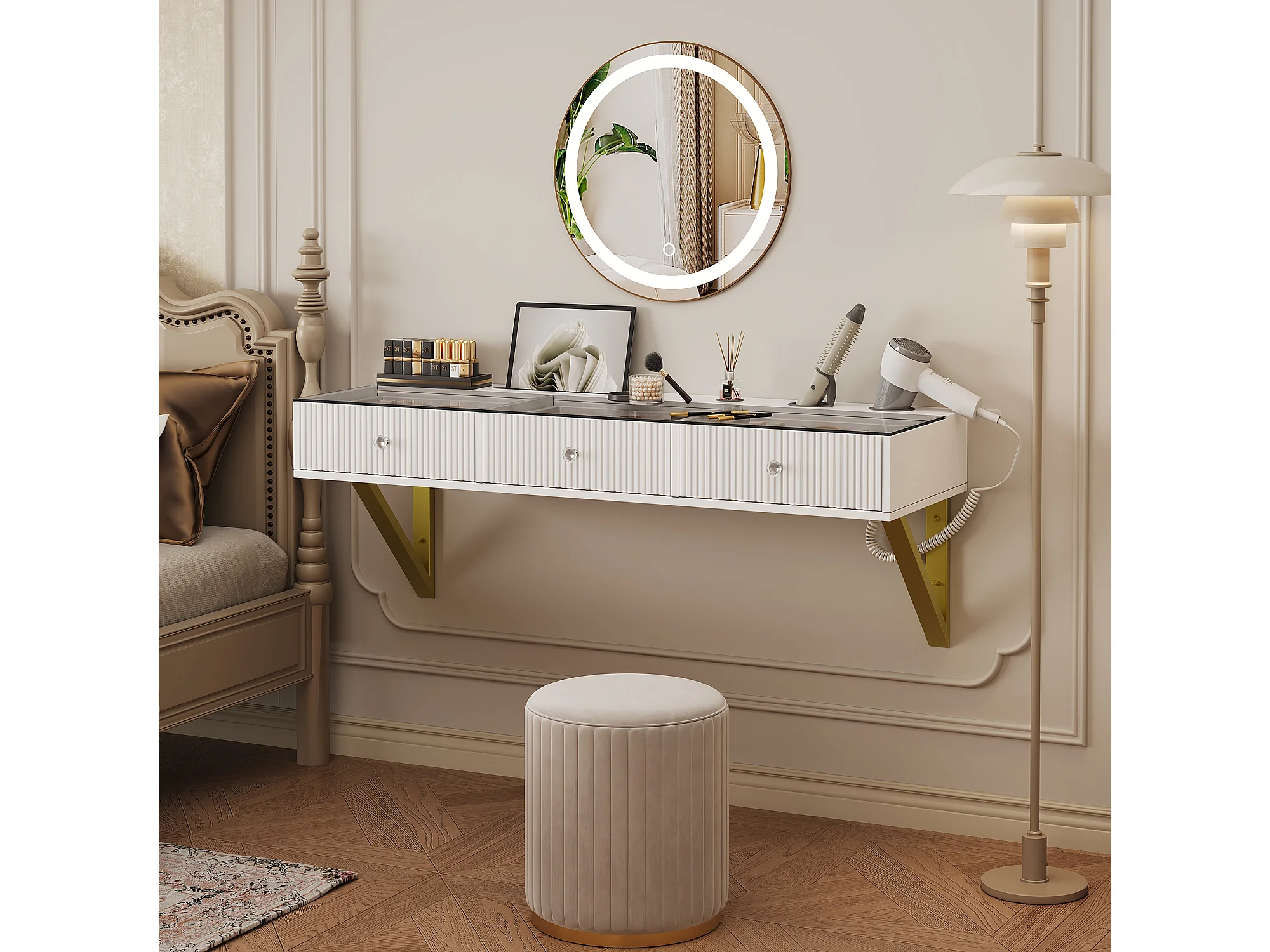 Coiffeuse suspendu avec miroir Leds + 3 tiroirs - 120 x 40 x 45 cm - plateau en verre - MDF + verre - blanc