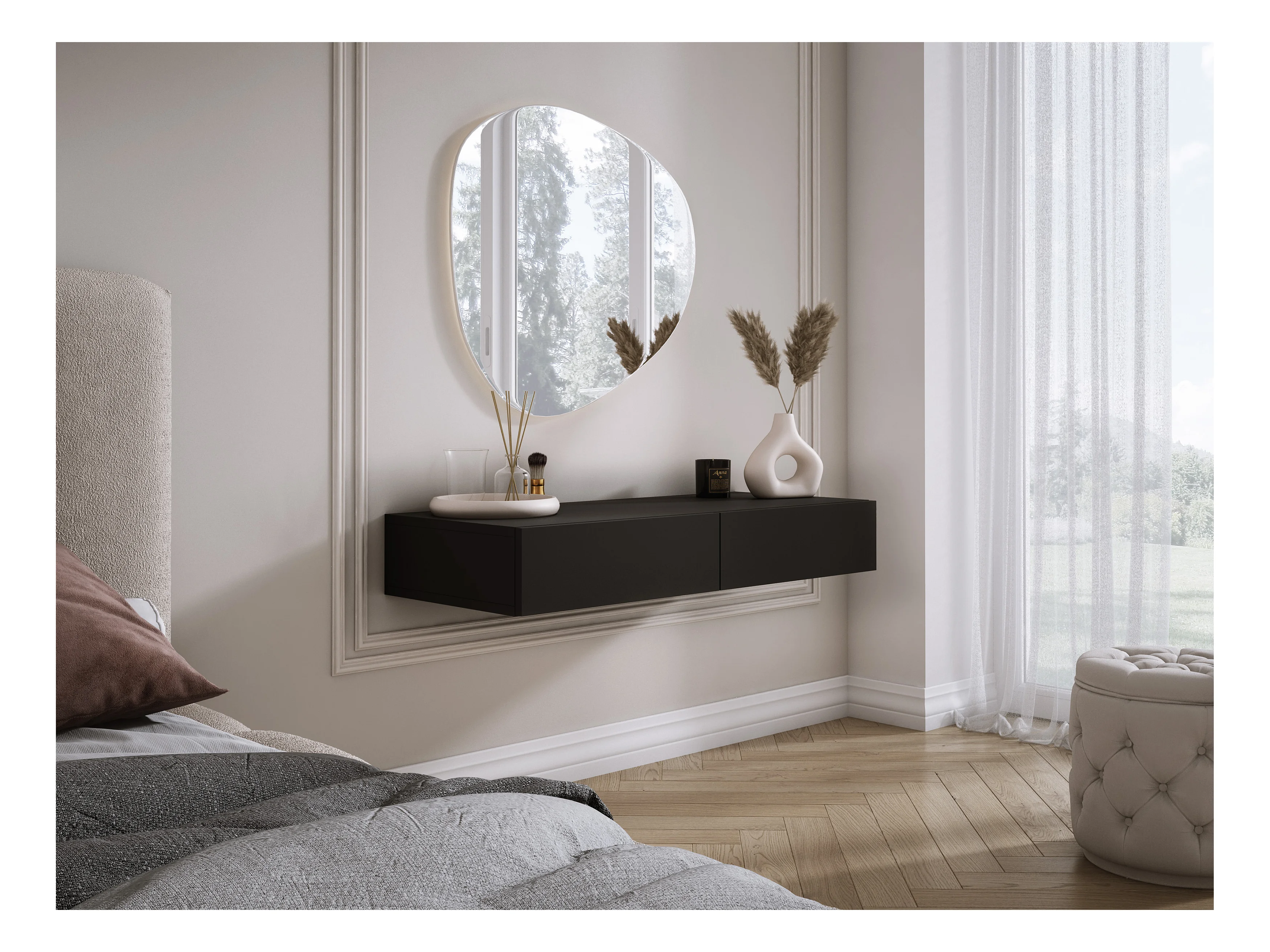 Coiffeuse suspendue avec deux tiroirs, façade lisse - Couleur : noir, 100 x 40 x 16 cm