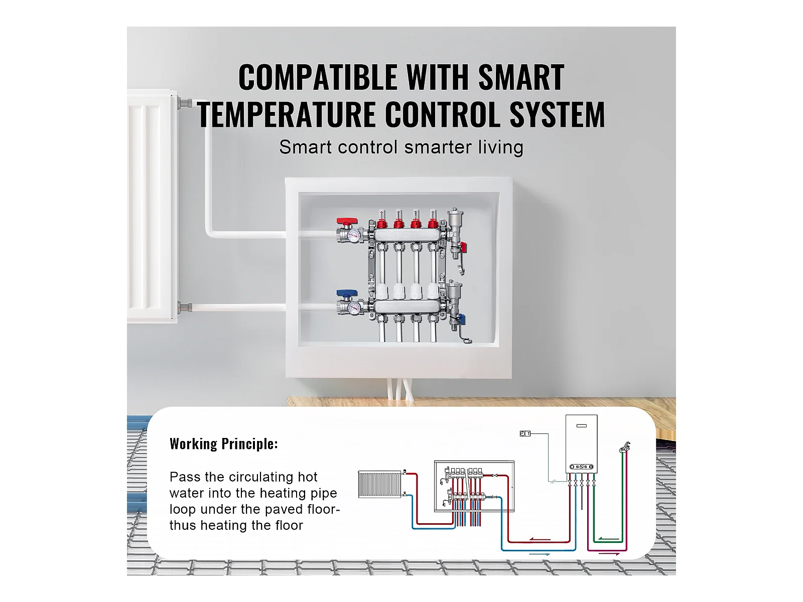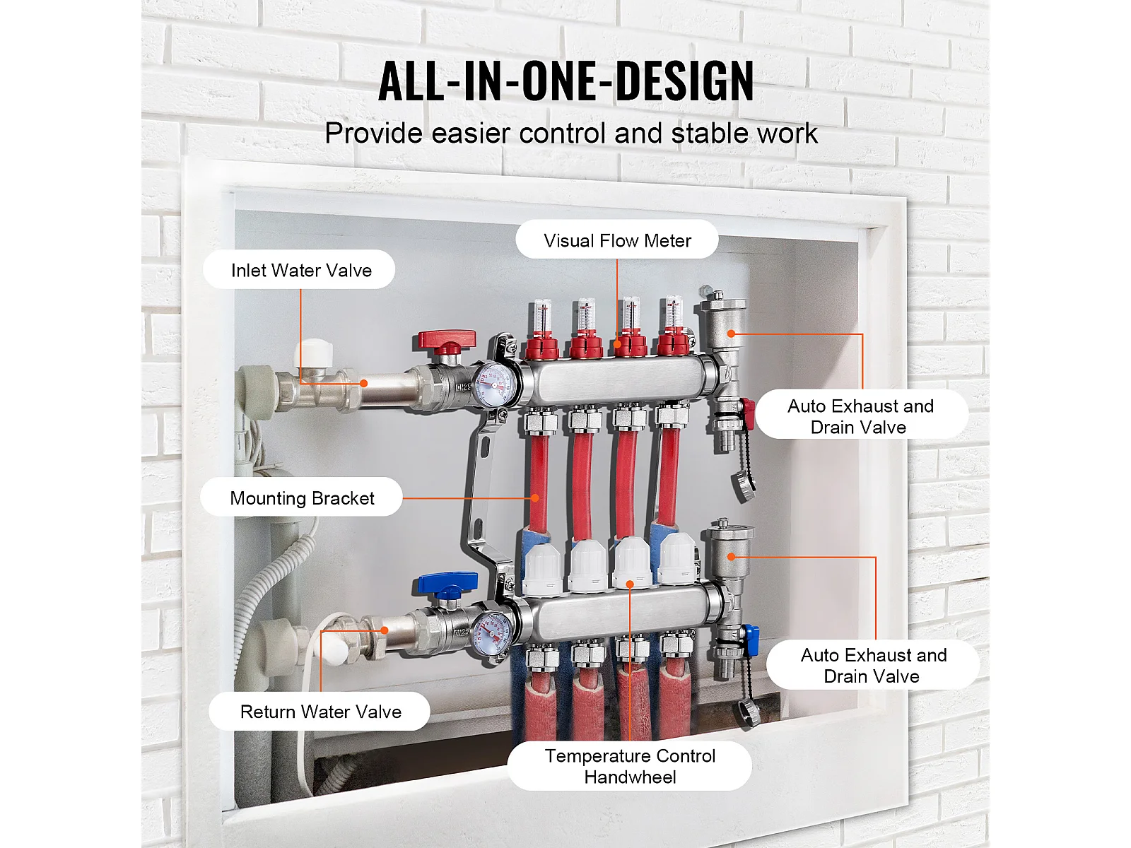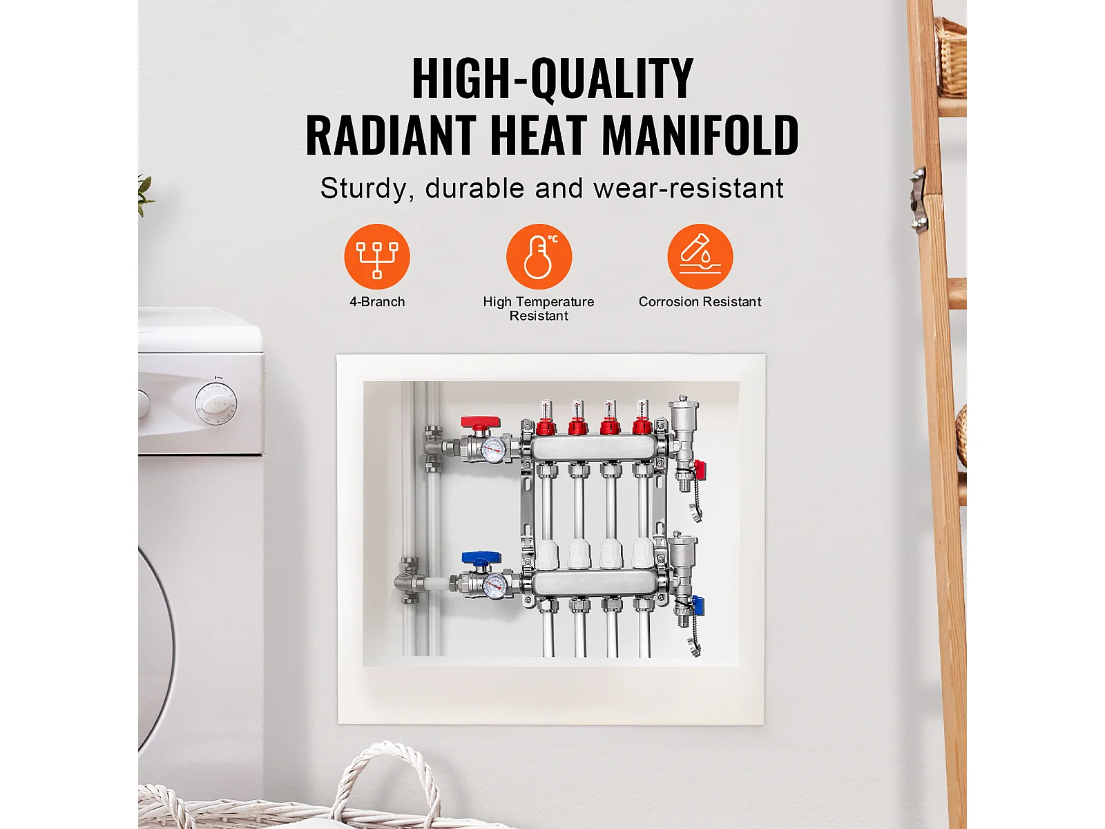 Collecteur de Chauffage Radiant SucceBuy à 4 Branches Ensemble de Collecteur de Chauffage par le Sol avec Tubes PEX de 2.54/5.08cm