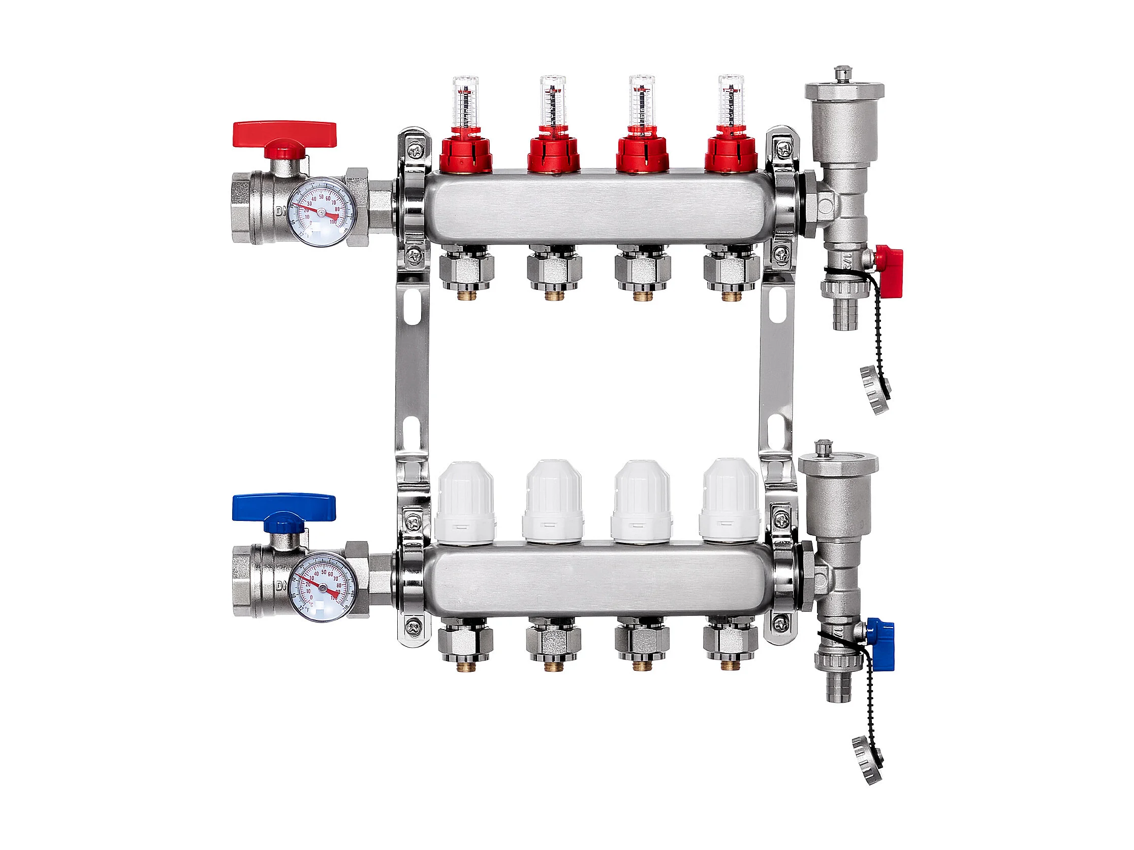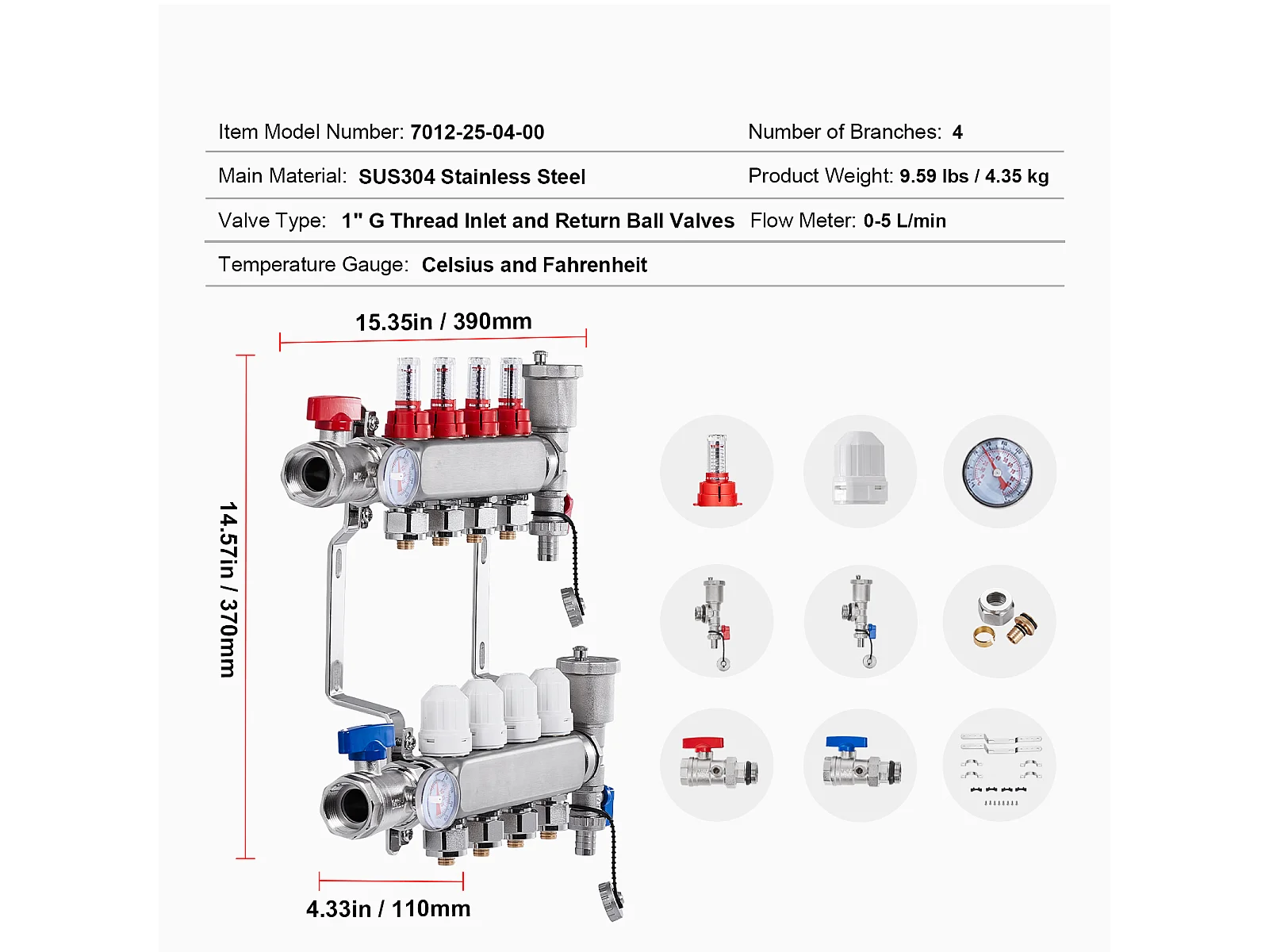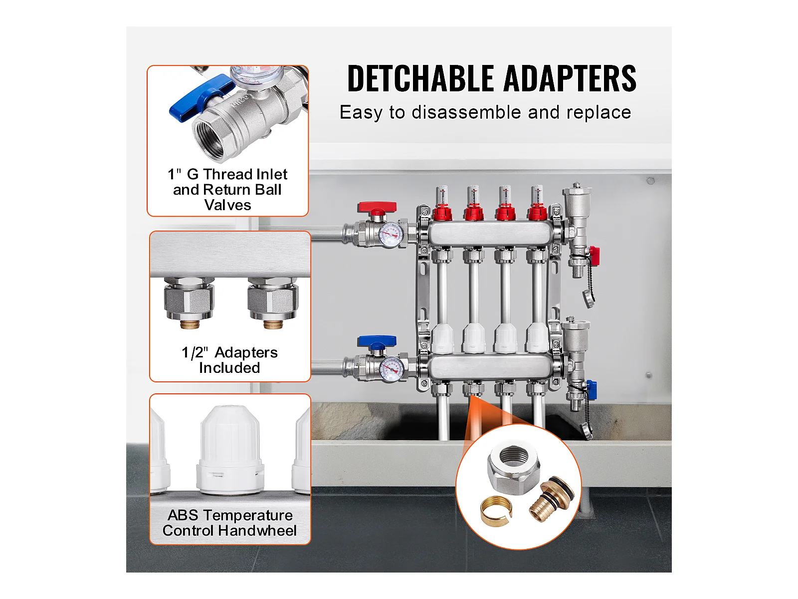 Collecteur de Chauffage Radiant SucceBuy à 4 Branches Ensemble de Collecteur de Chauffage par le Sol avec Tubes PEX de 2.54/5.08cm