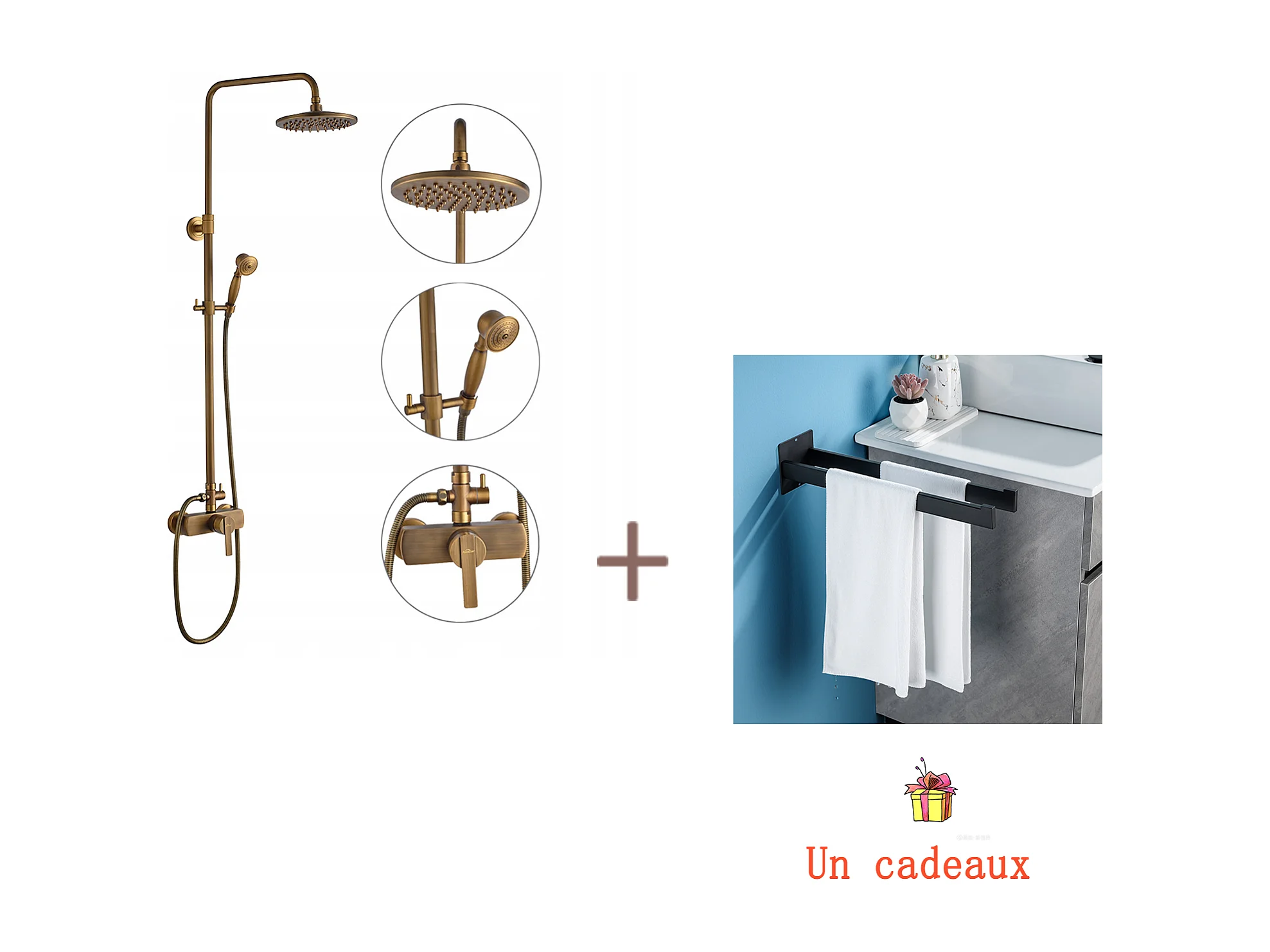Colonne douche en laiton Bronze Rétro,Douche avec Mitigeur Mécanique,Hauteur Réglable+Porte Serviette Salle Bain Adhésif,Barres Porte Serviettes,Noir