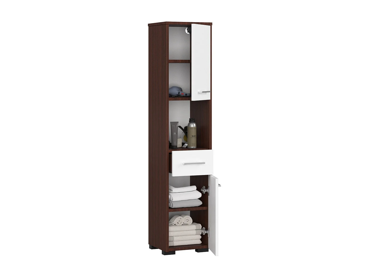 Colonne salle de bains AKORD FIN Wengé 30 cm 2 portes 1 tiroir façade Blanche 5 étagères 30x30x140 cm