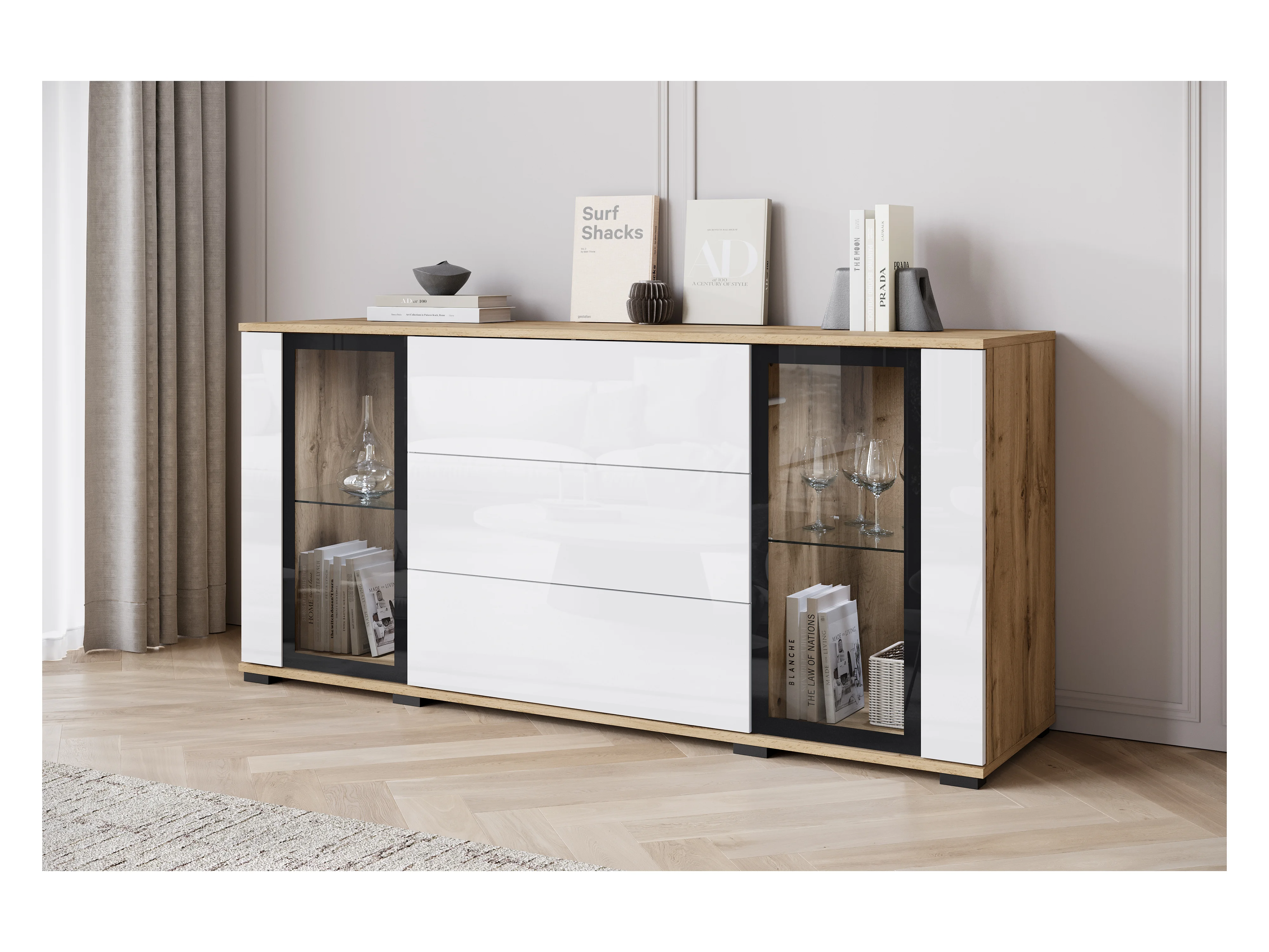 Commode moderne 150 cm avec LED pour salon – corps chêne wotan, façades blanc brillant, 3 tiroirs et 2 portes