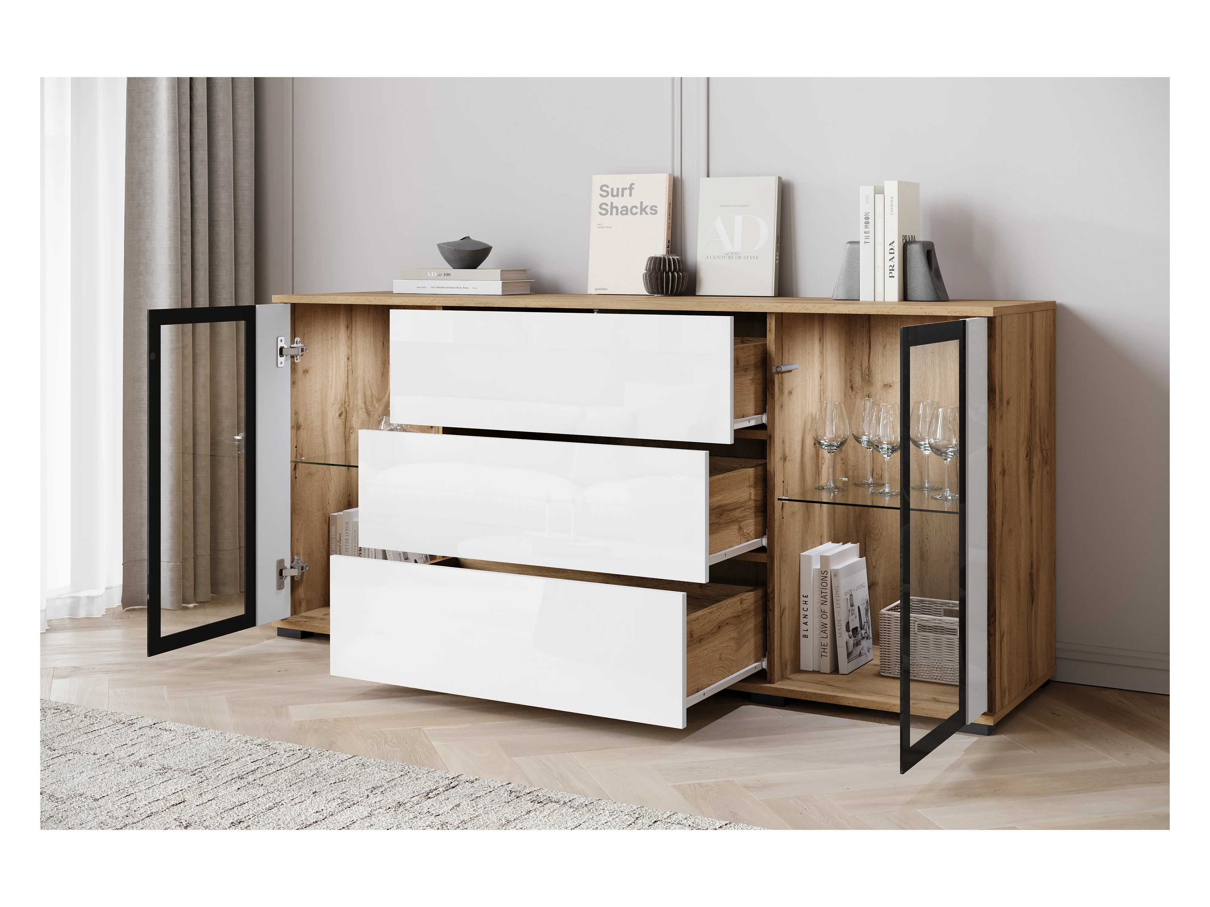 Commode 150 cm pour salon – vitrine moderne avec vitrages + tiroirs, corps chêne wotan, façades blanc brillant