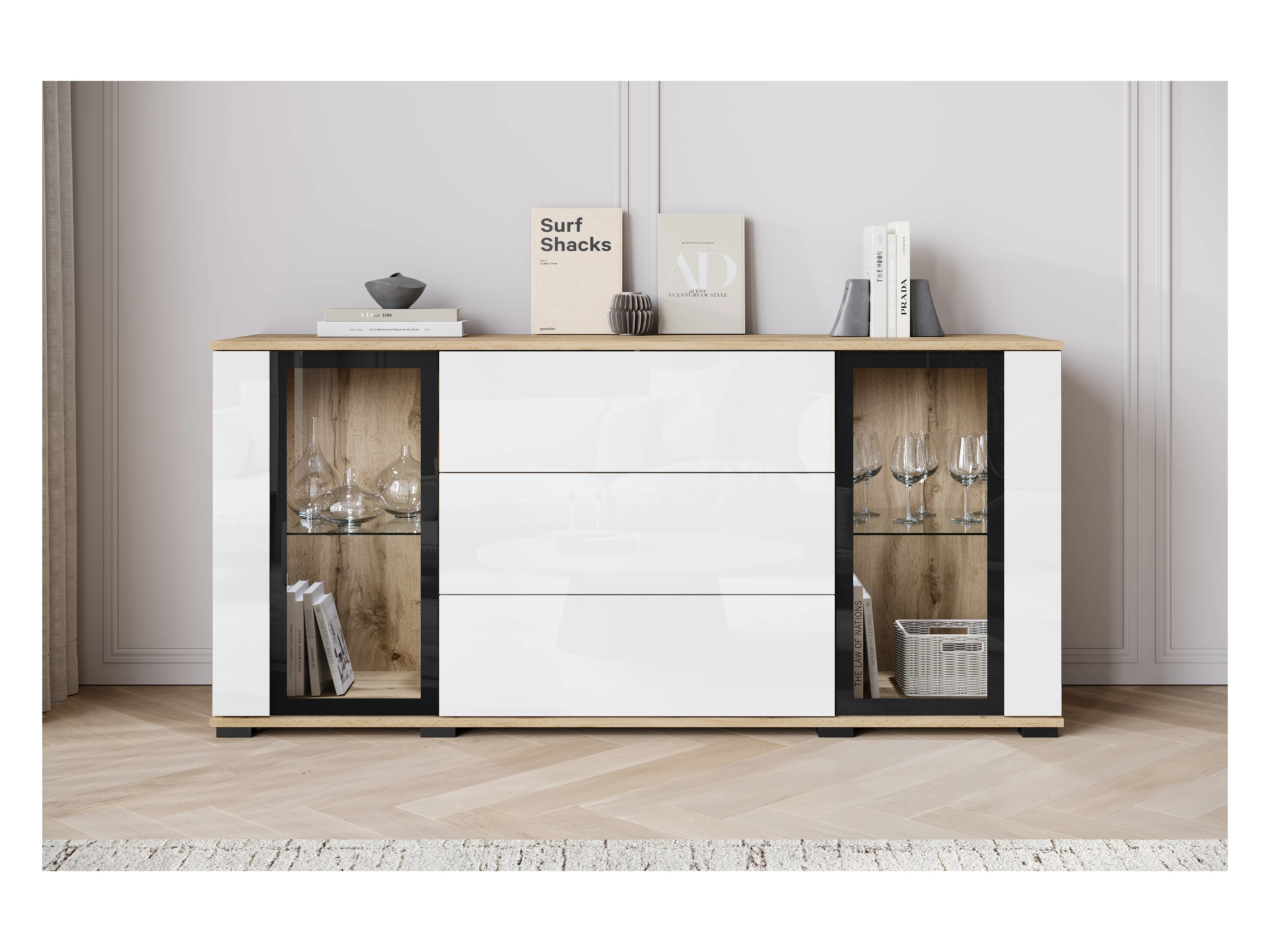 Commode moderne 150 cm avec LED pour salon – corps chêne wotan, façades noir brillant, 3 tiroirs et 2 portes