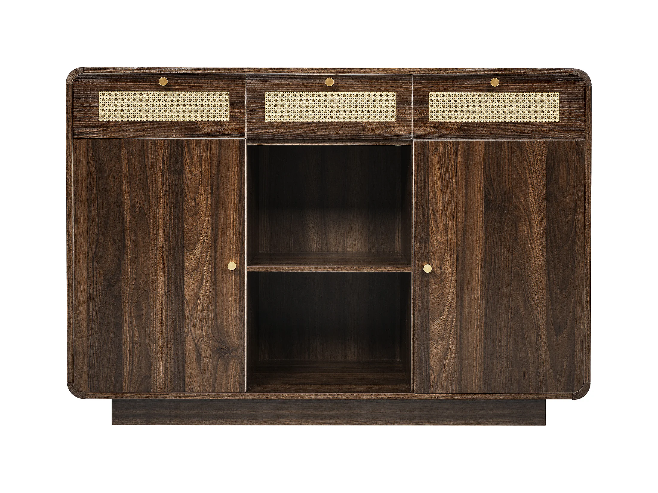 Commode 3 tiroirs - Buffet 2 portes et 2 compartiments de rangement ouverts - poignées dorées - noyer