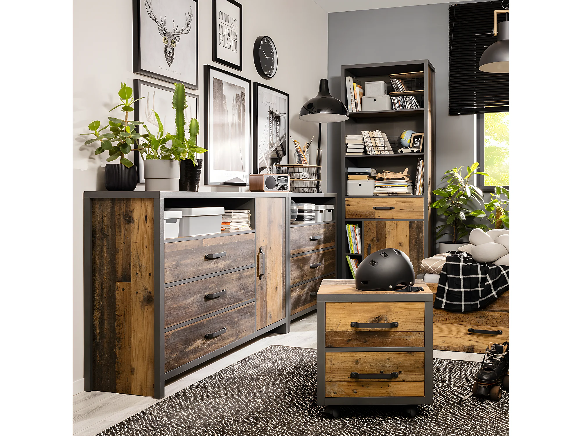 Indy Commode, 3 portes, 3 tiroirs, imitation chêne gris, look vieux bois.