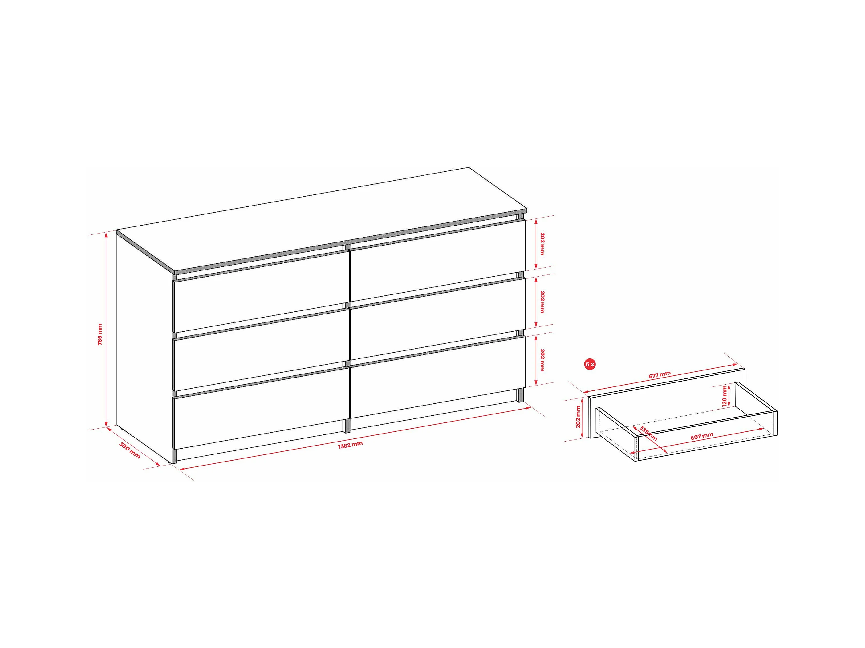 Commode 6 Tiroirs : Blanc Mat / Chêne Sonoma Top, 138 x 39 x 79 cm
