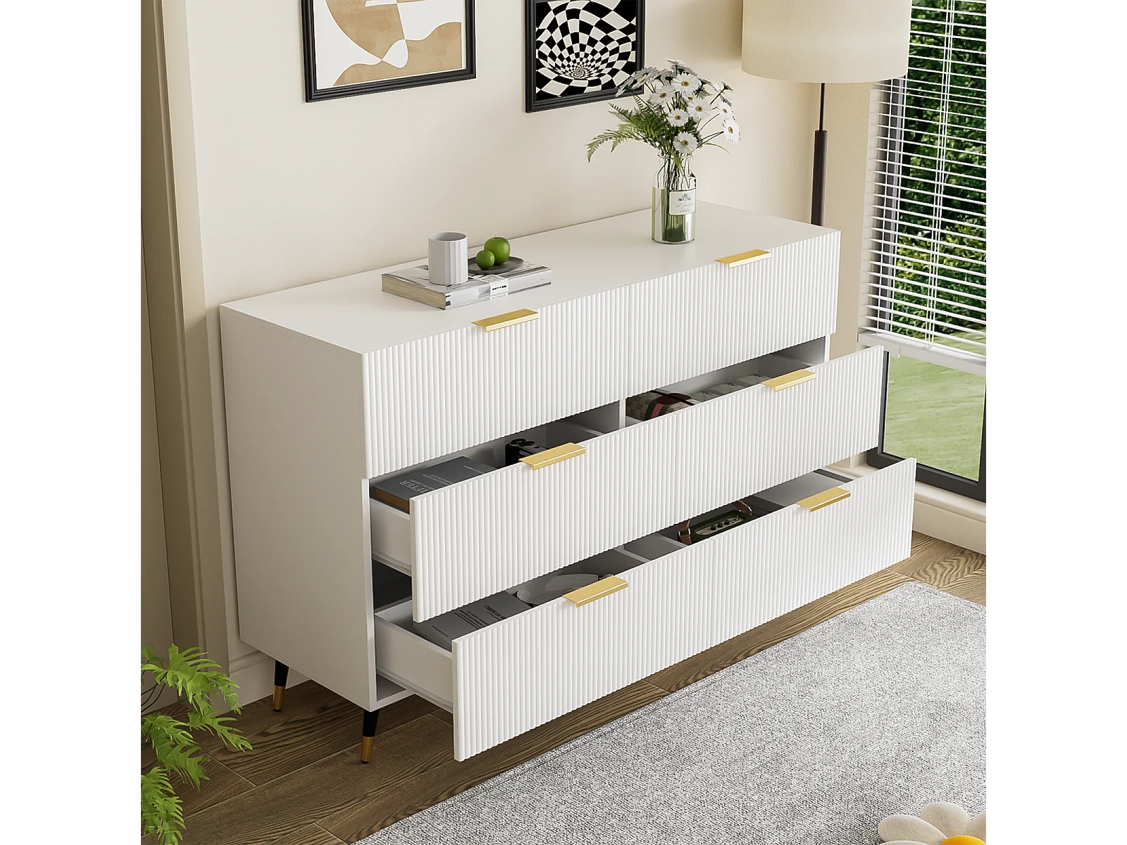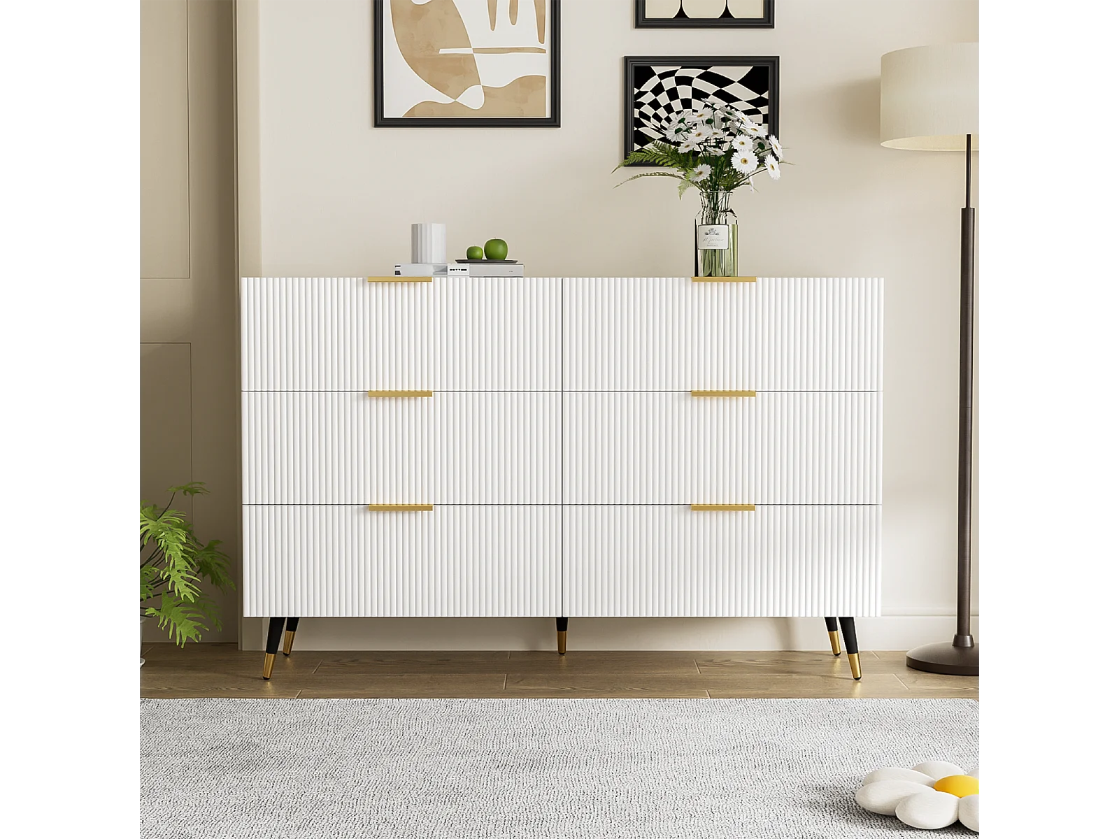 Commode 6 tiroirs Meuble tiroir Rangement Blanc avec Pieds et poignées dorés Meuble
