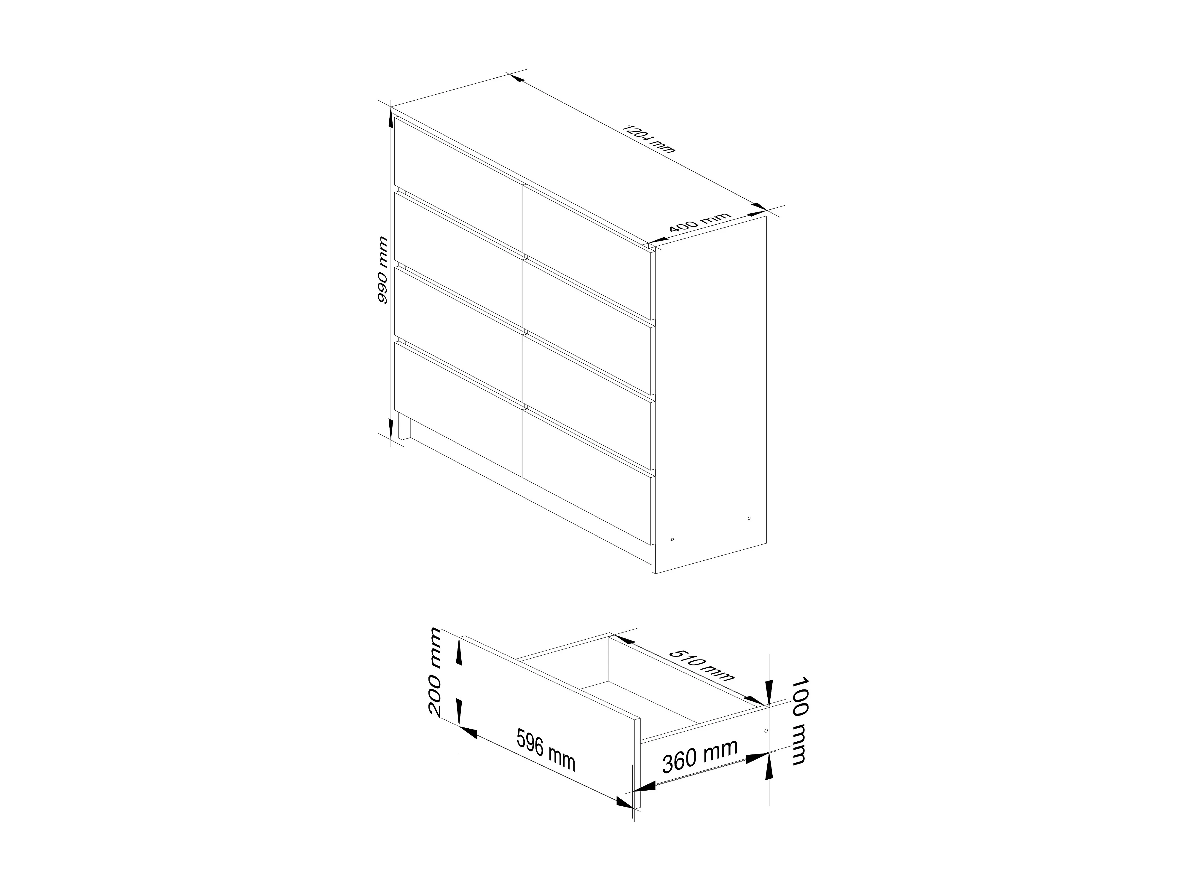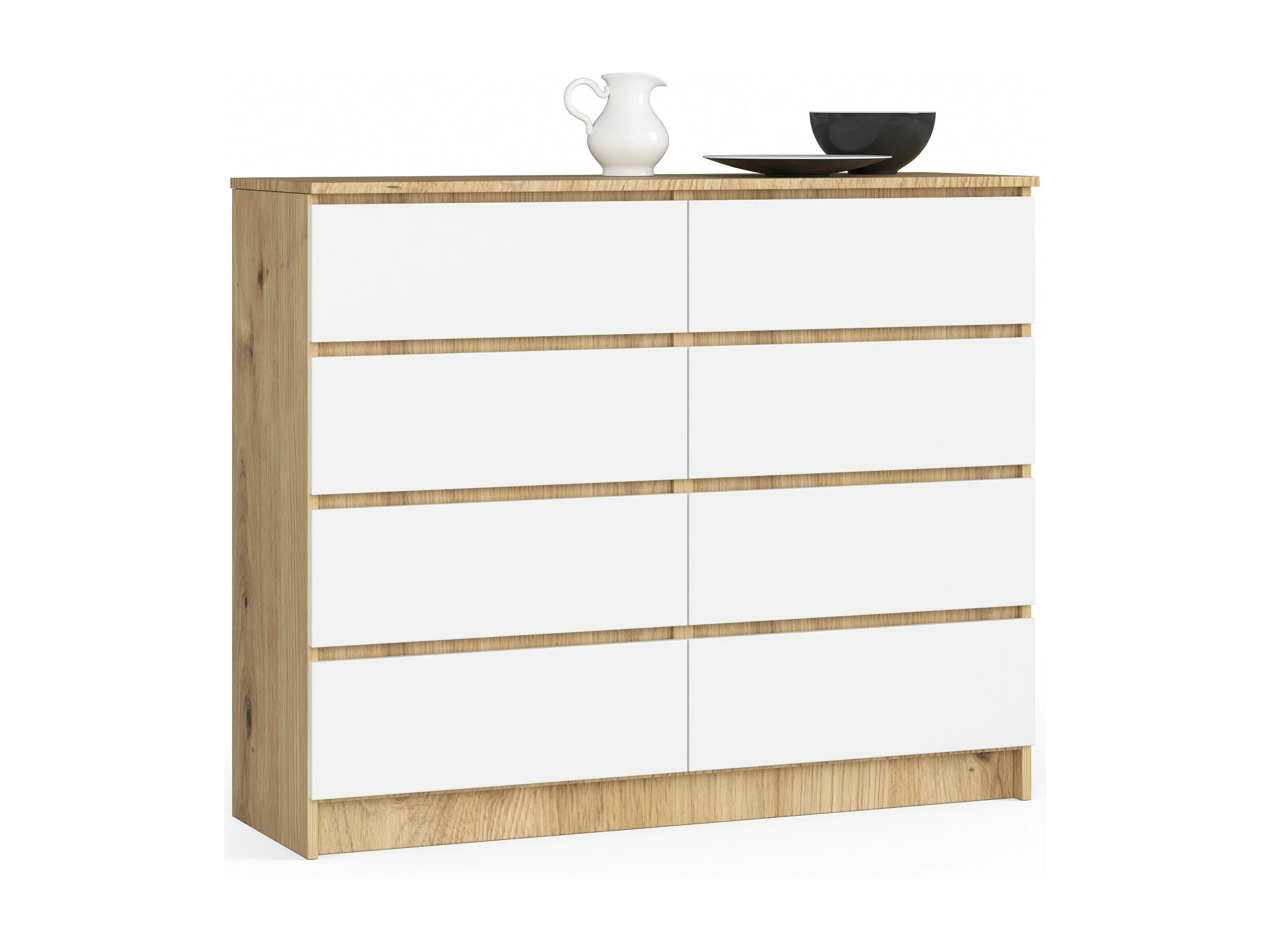 Commode AKORD K120 Chêne Artisan 120 cm 8 tiroirs façade Blanche 120x40x99 cm