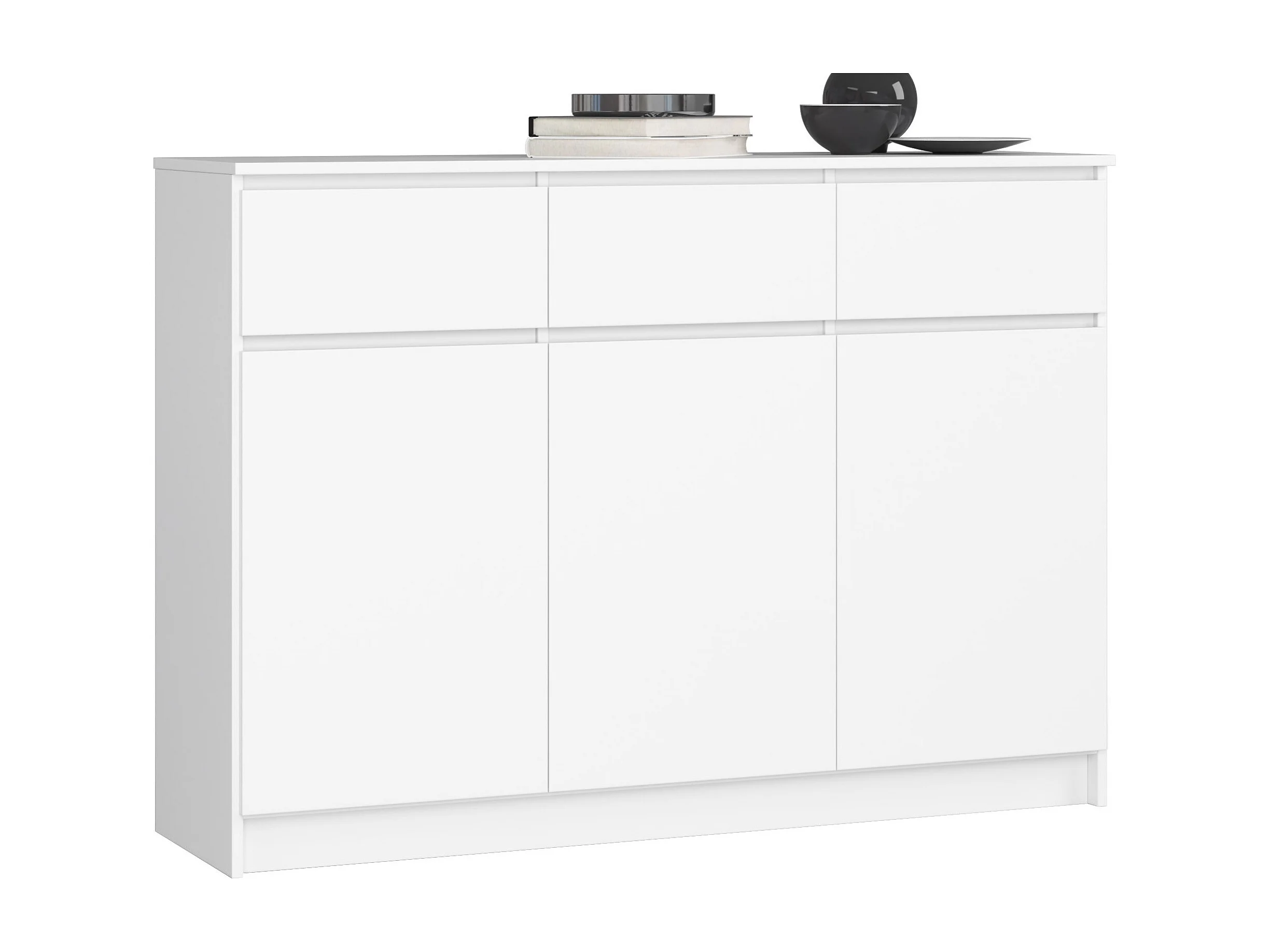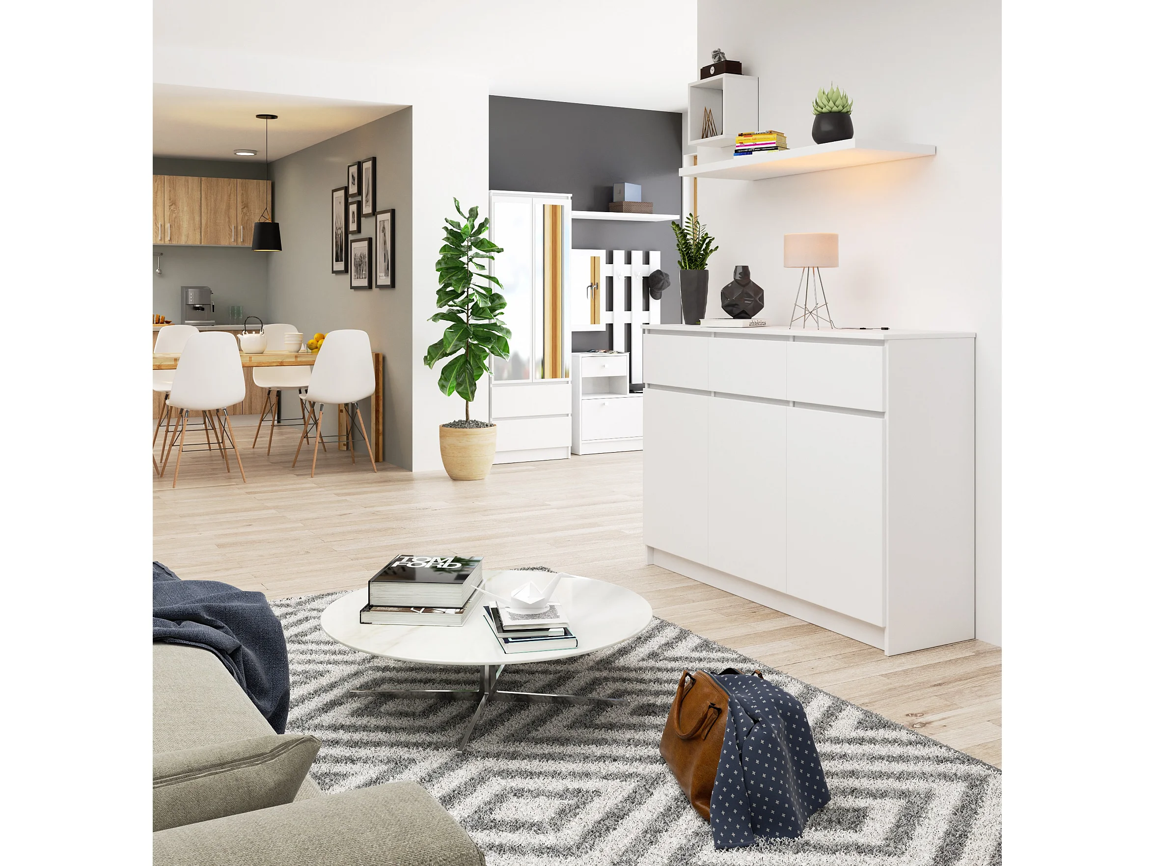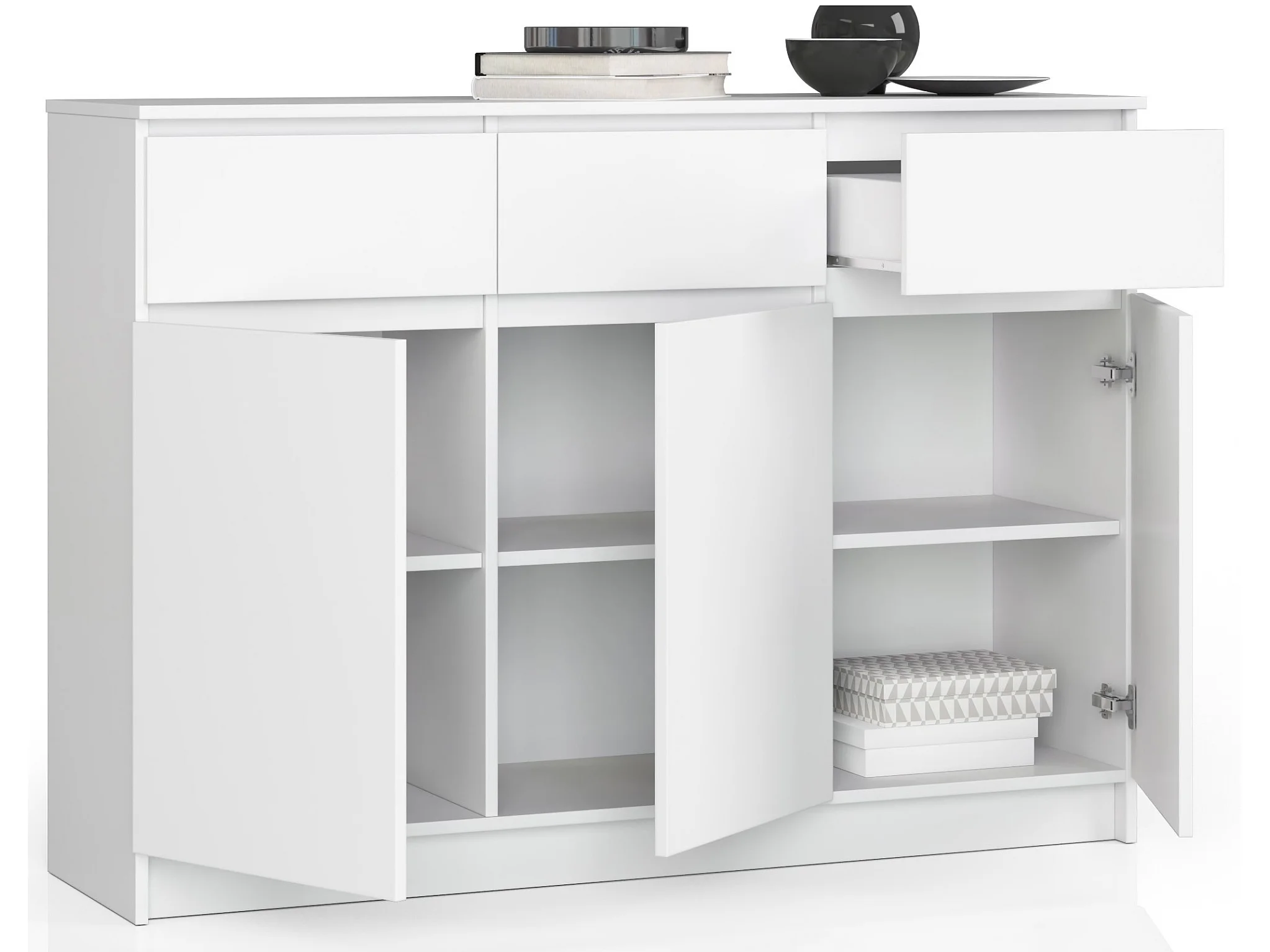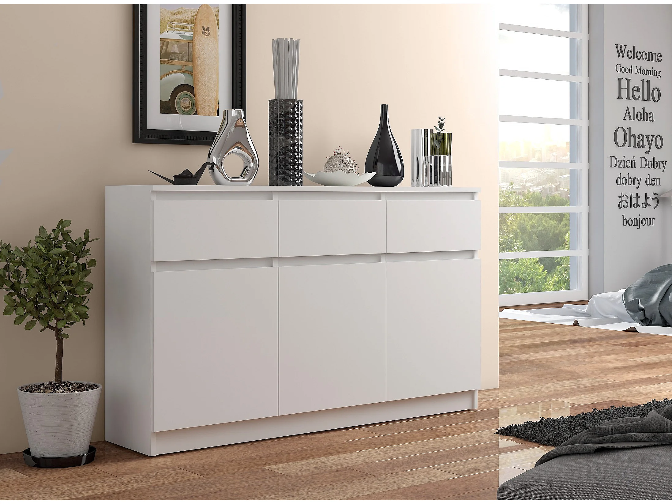 Commode AKORD K140 Blanche 138 cm 3 portes 3 tiroirs façade Blanche 6 étagères 138x40x99 cm