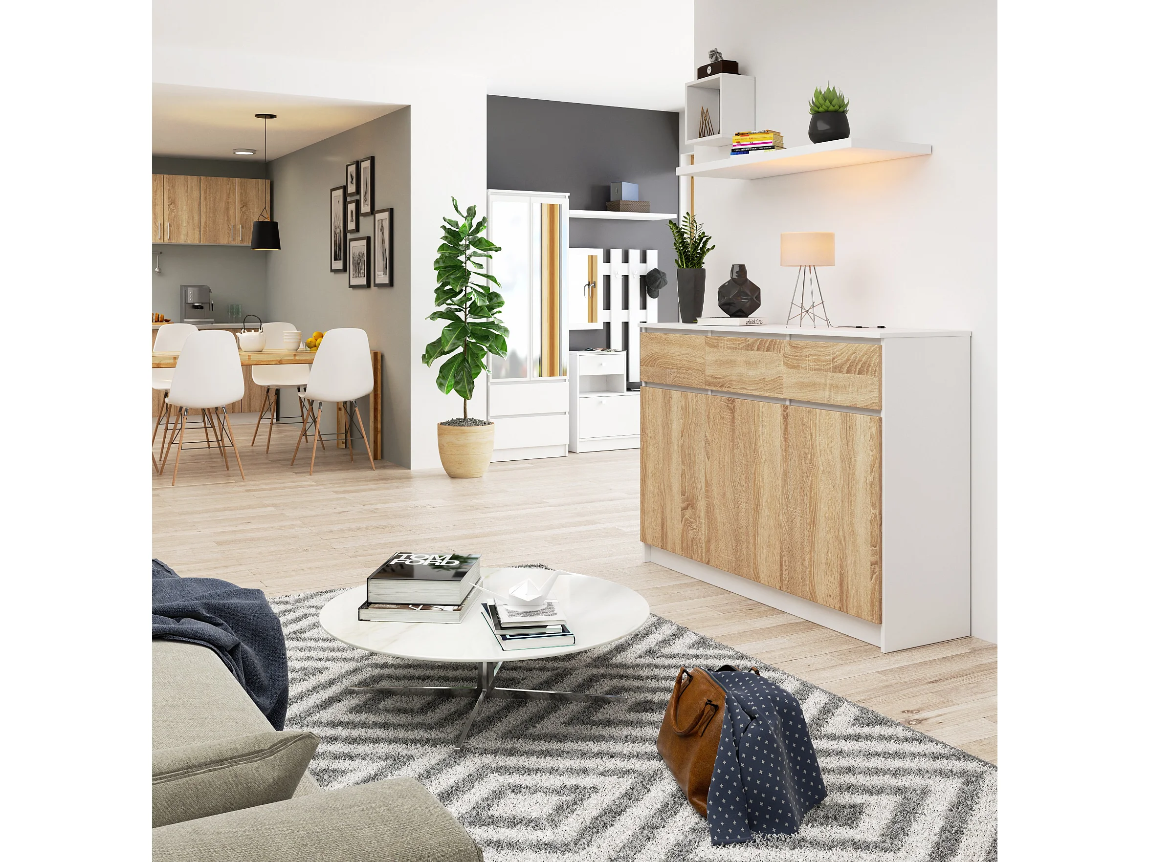 Commode AKORD K140 Blanche 138 cm 3 portes 3 tiroirs façade Chêne Sonoma 6 étagères 138x40x99 cm