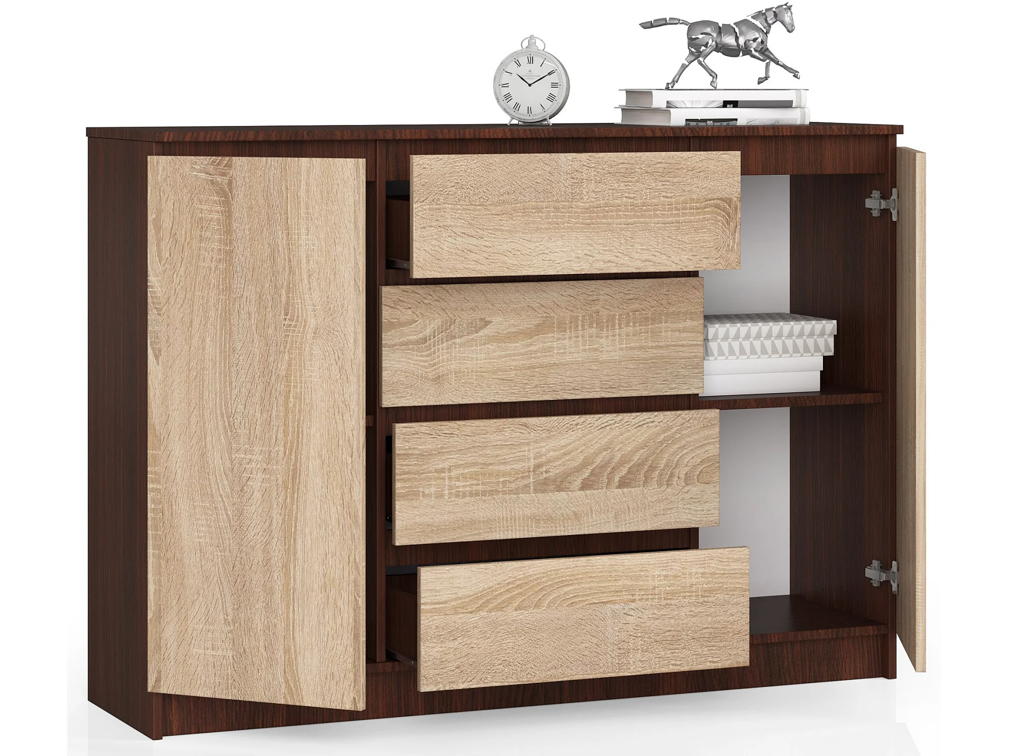 Commode AKORD K140 Wengé 138 cm 2 portes 4 tiroirs façade Chêne Sonoma 4 étagères 138x40x99 cm