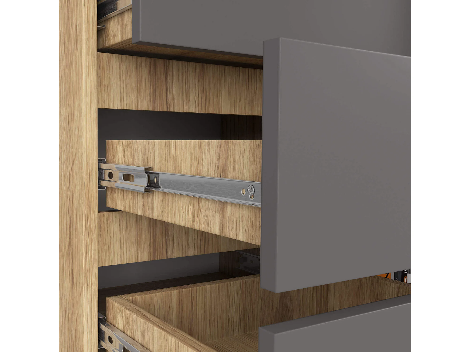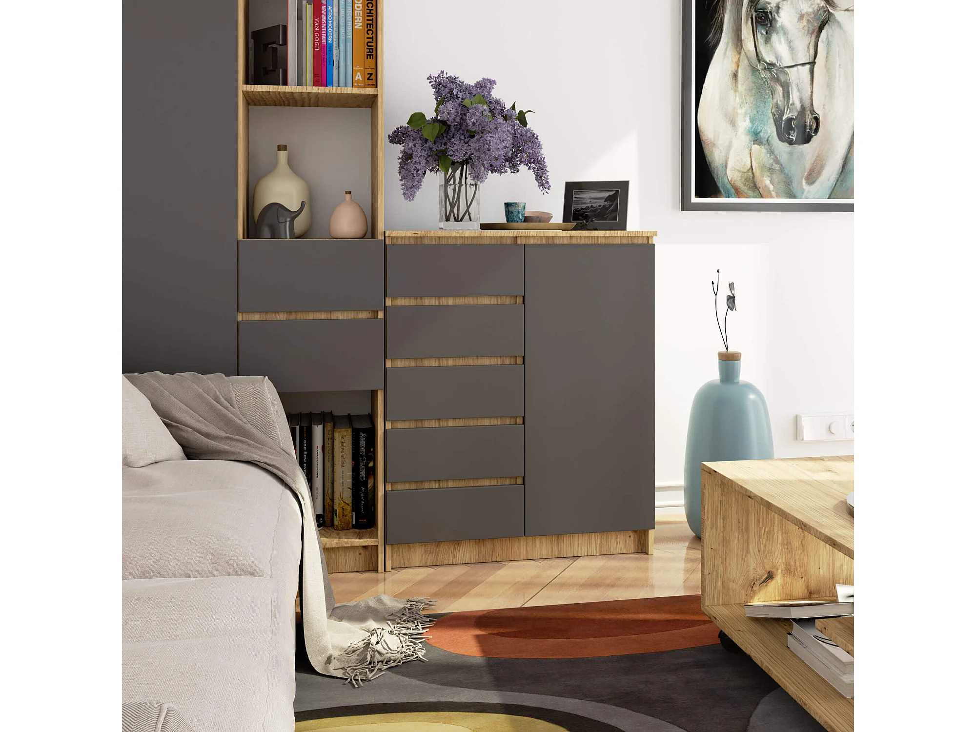 Commode AKORD K80 Chêne Artisan 80 cm 1 porte 5 tiroirs façade Gris Graphite 3 étagères 80x35x97 cm