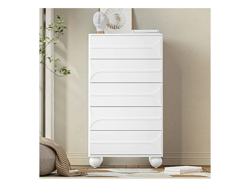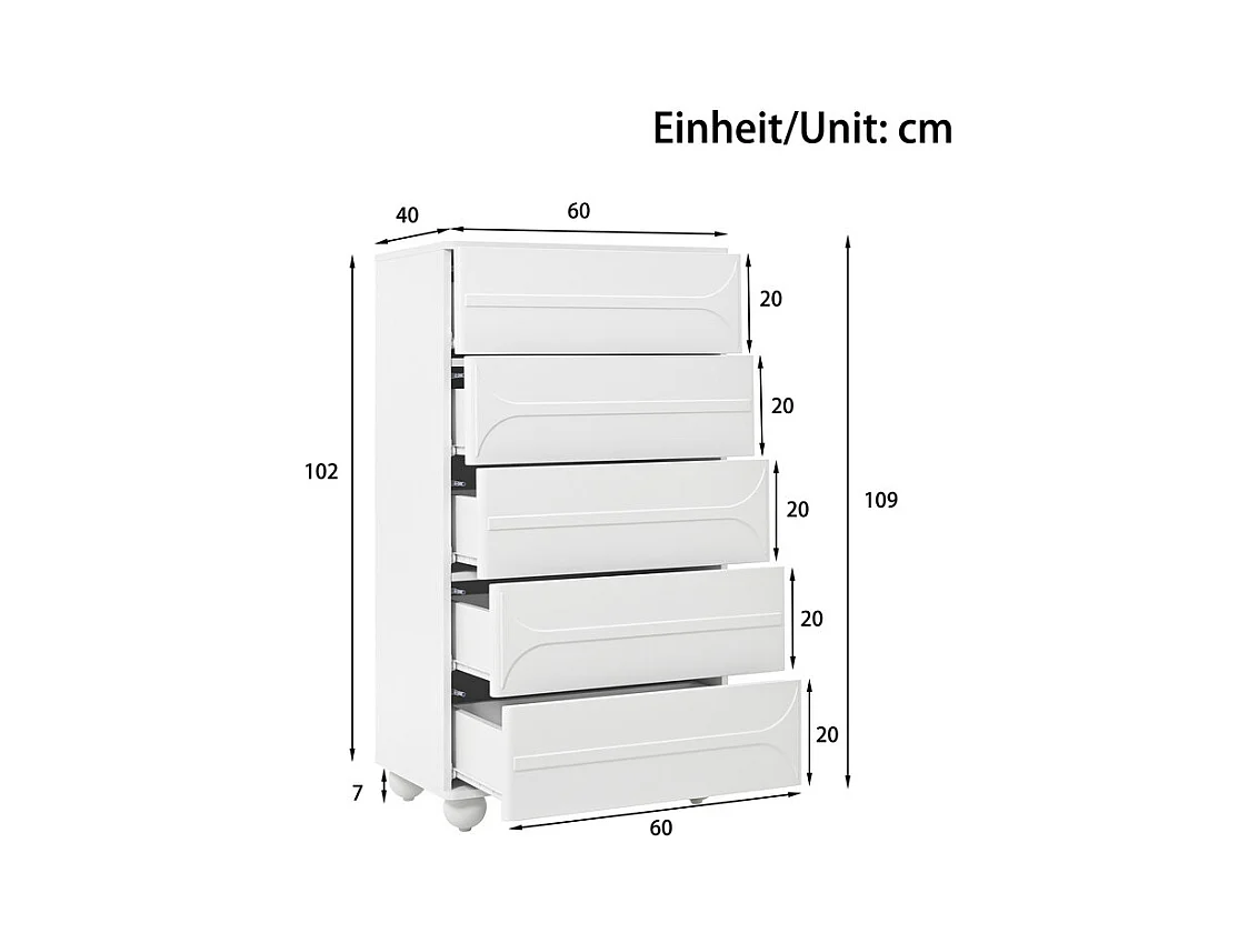 Commode avec 5 tiroirs - Design de relief - Corners arrondis - pieds métal - Panneau de particule + MDF - 60×40×109cm