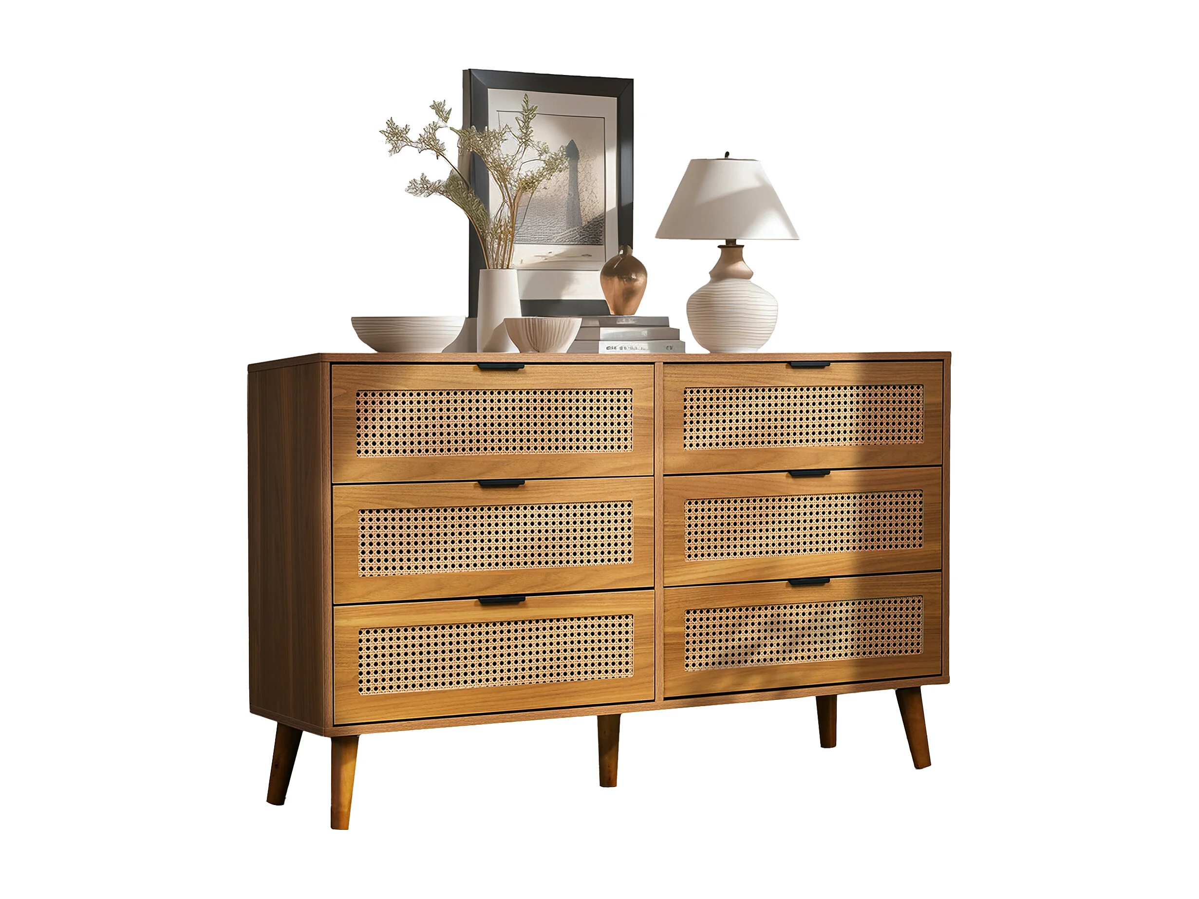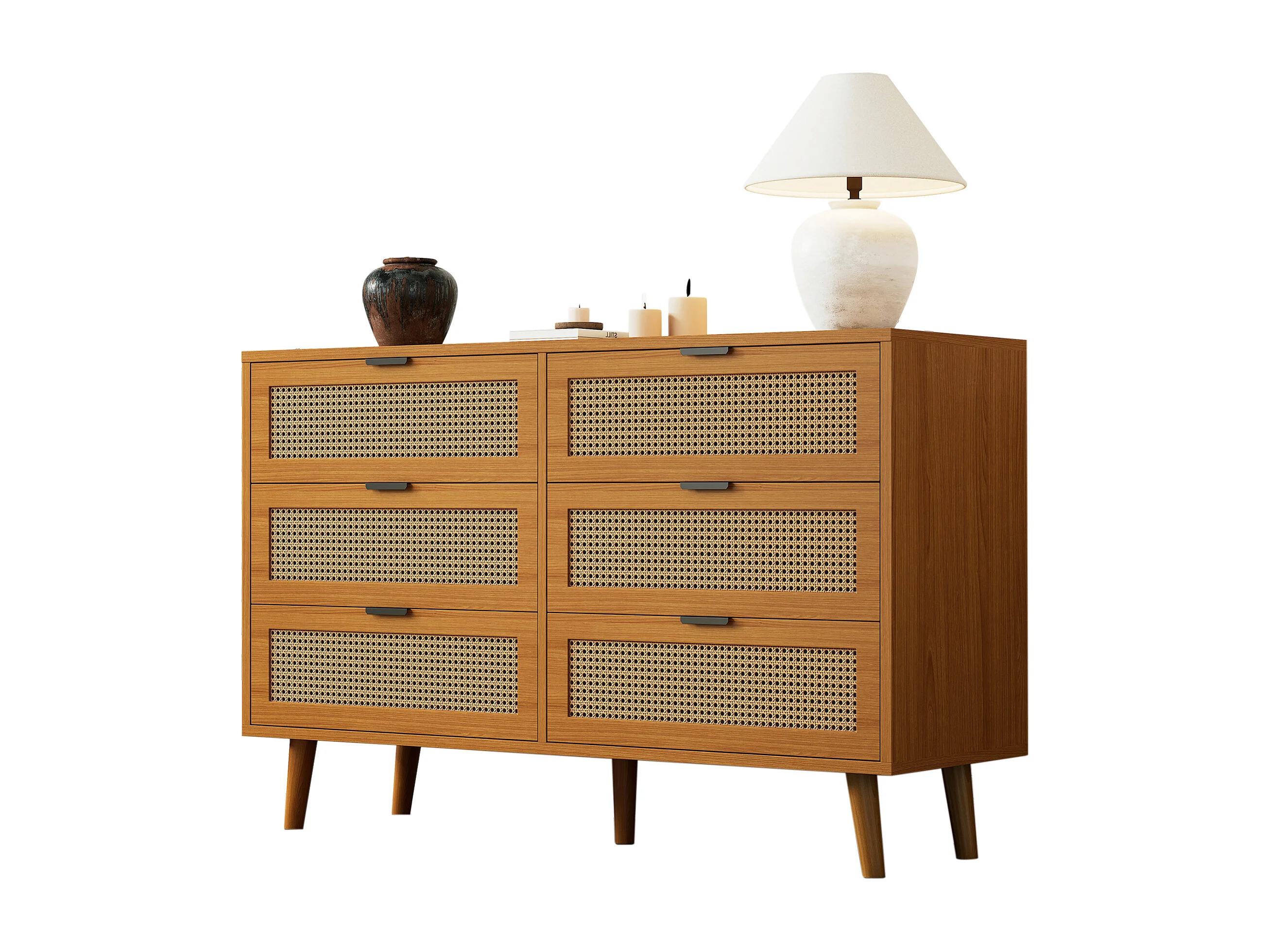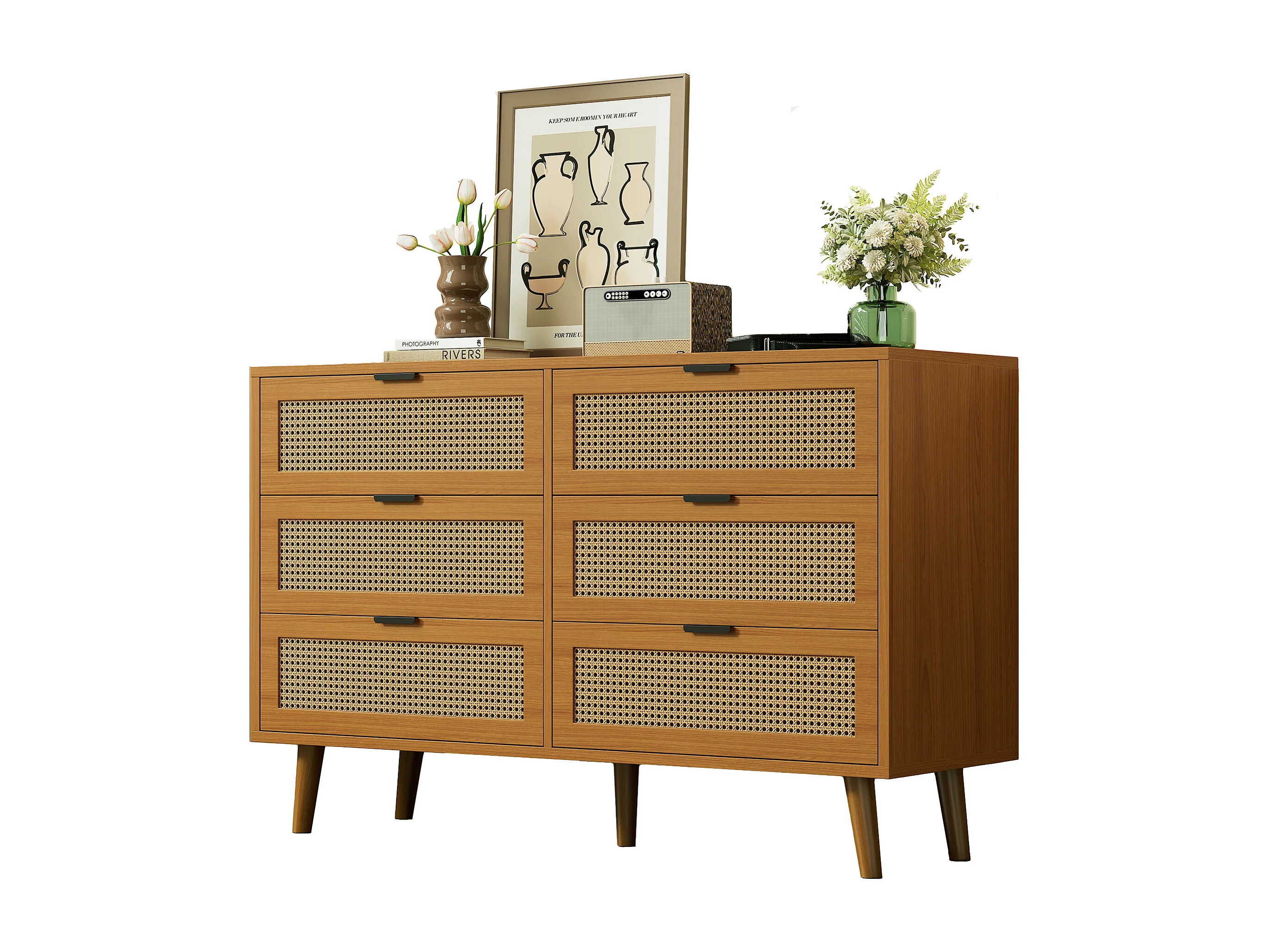 Commode avec 6 tiroirs, meuble de rangement en bois avec poignées métalliques, style rétro, pour chambre et bureau (120x40x76.5 cm)