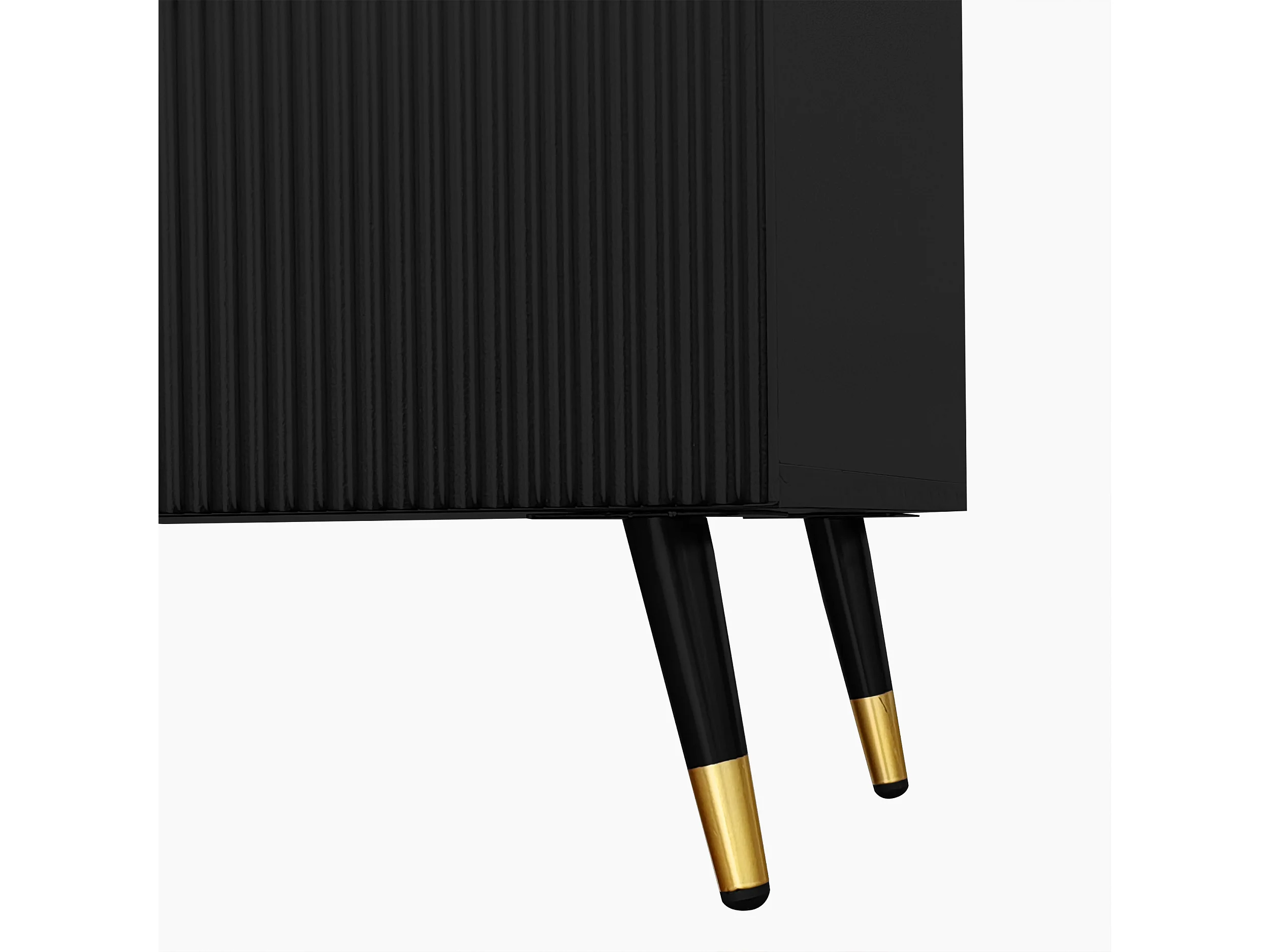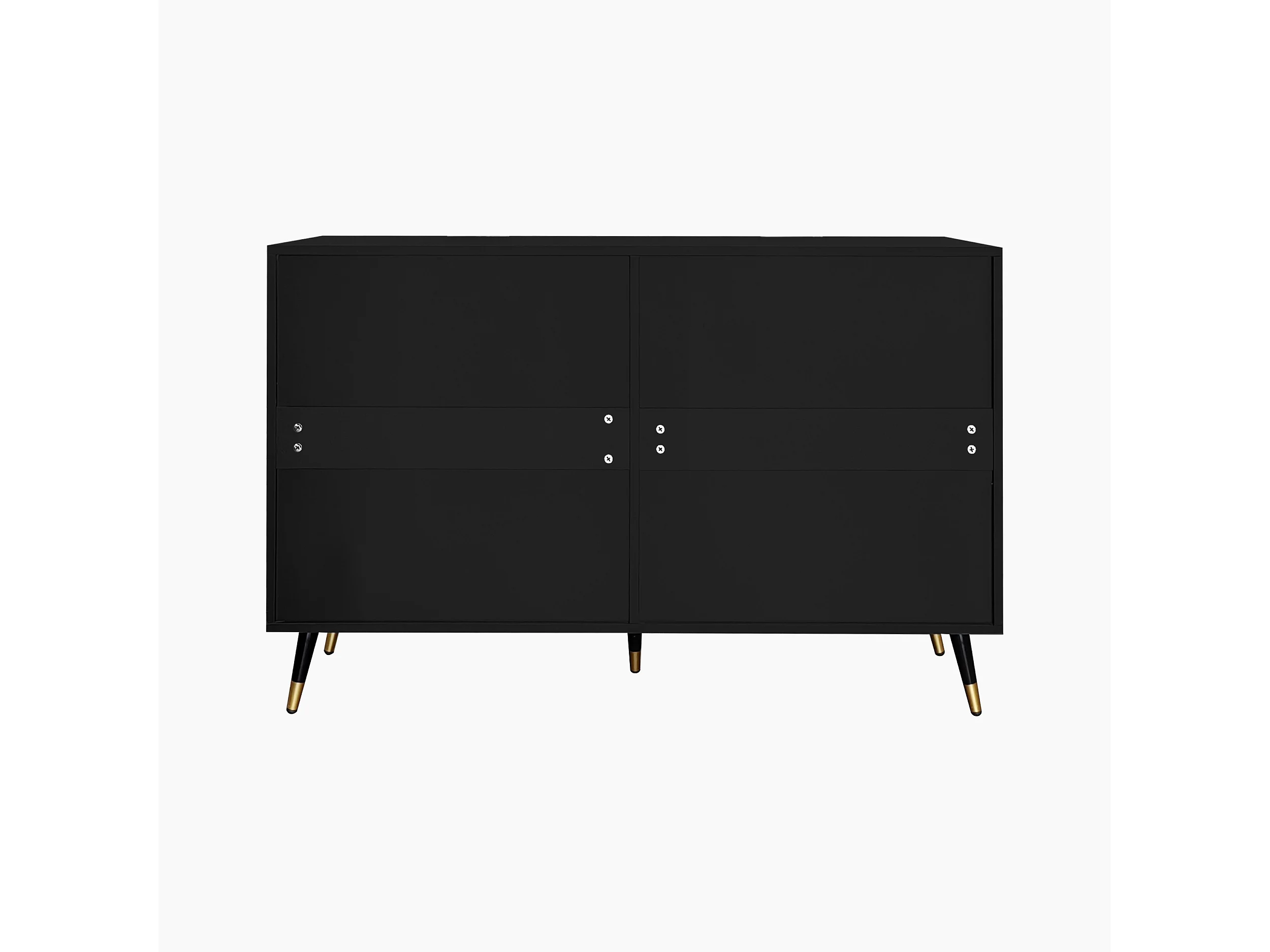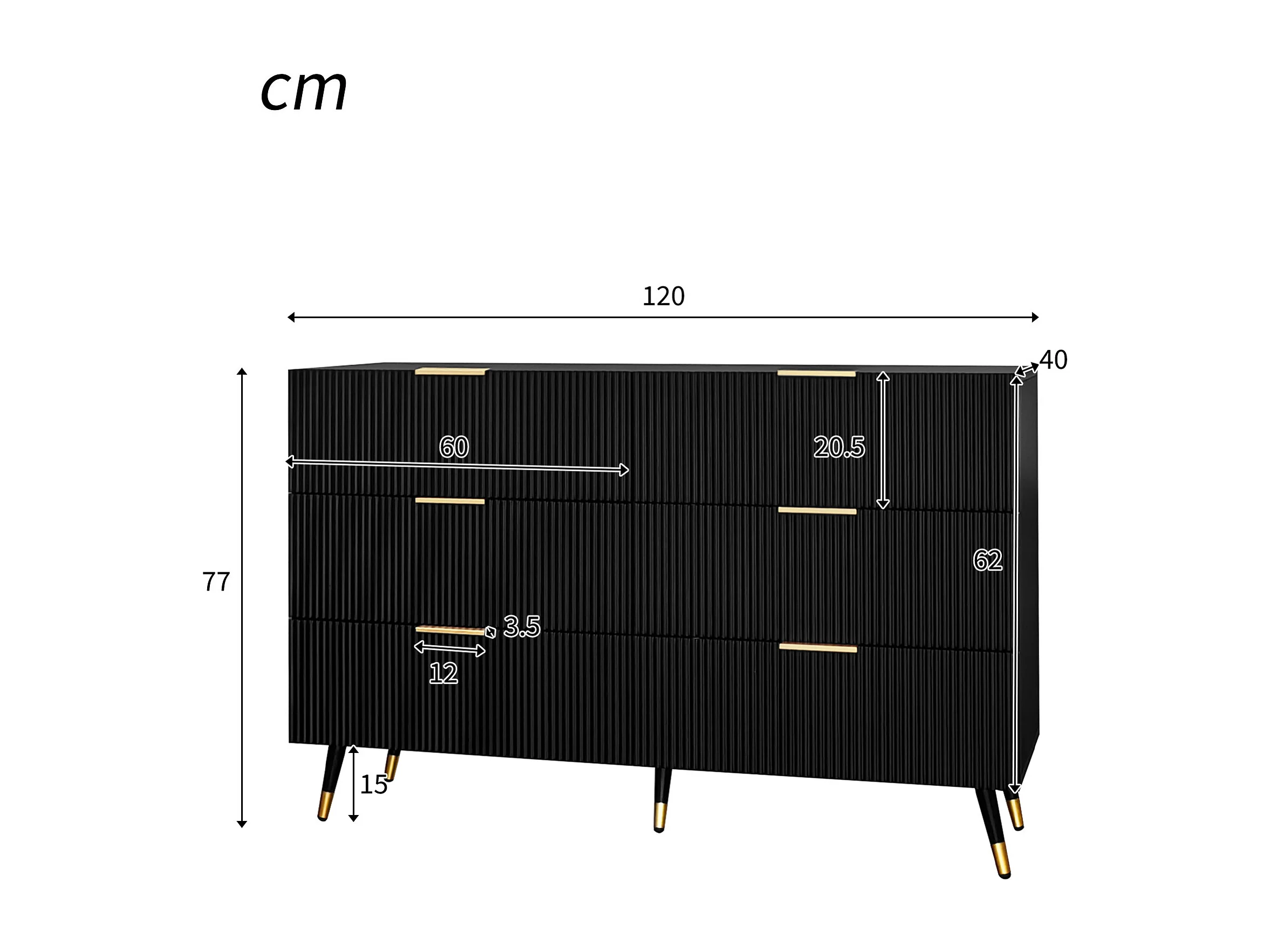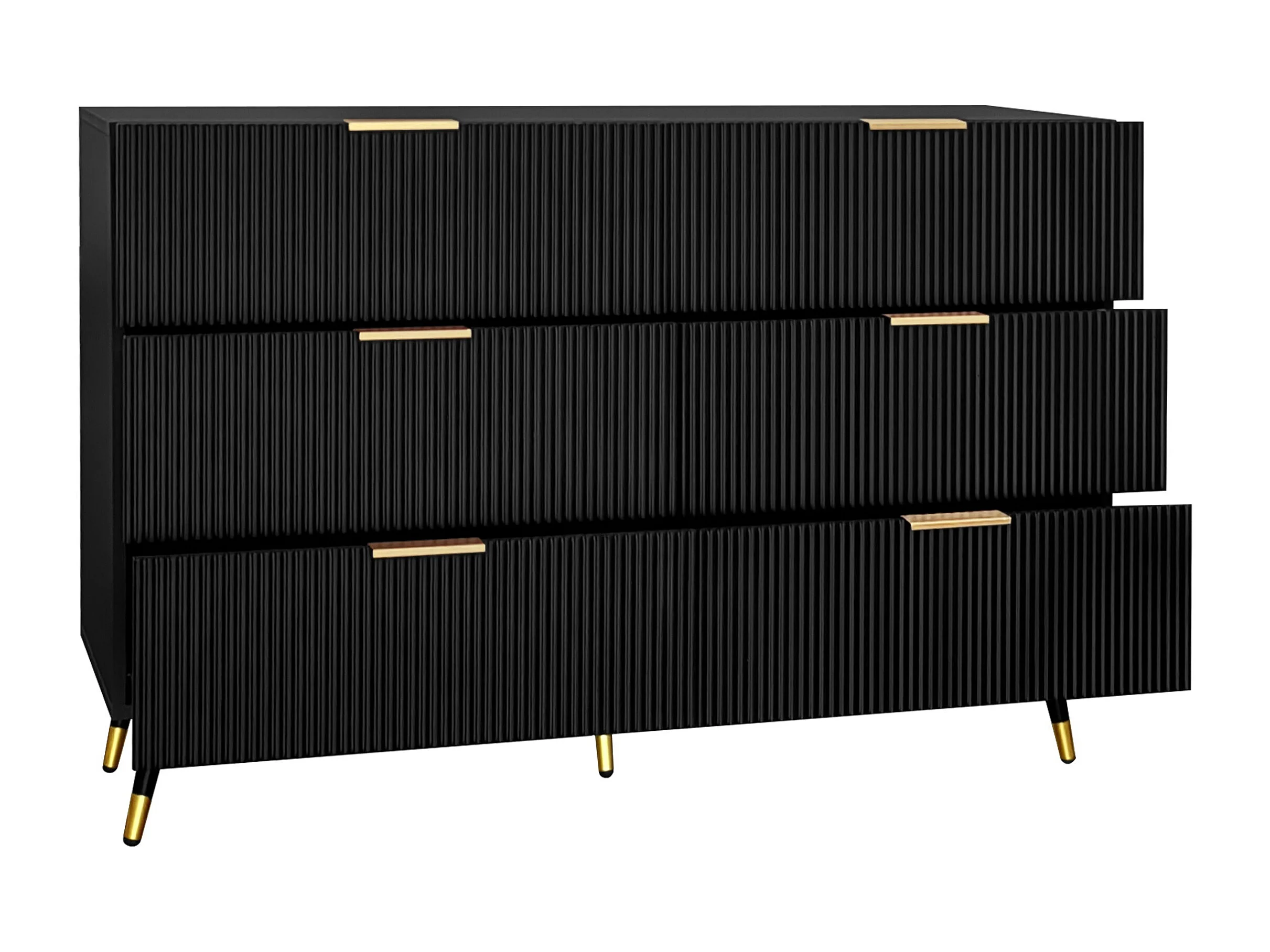 Buffet 120x40x77 cm, 6 tiroirs, surface ondulée, poignées et pieds dorés, panneau de particules, noir