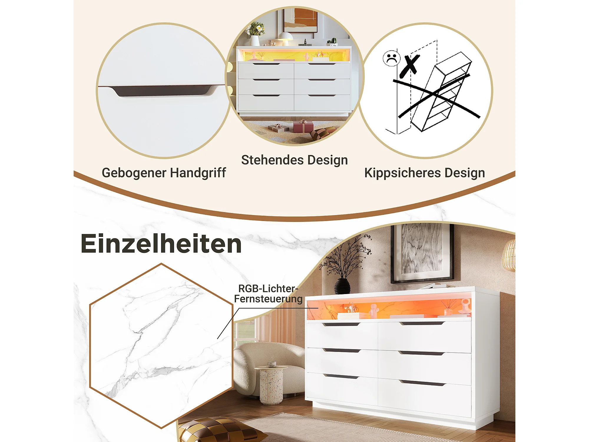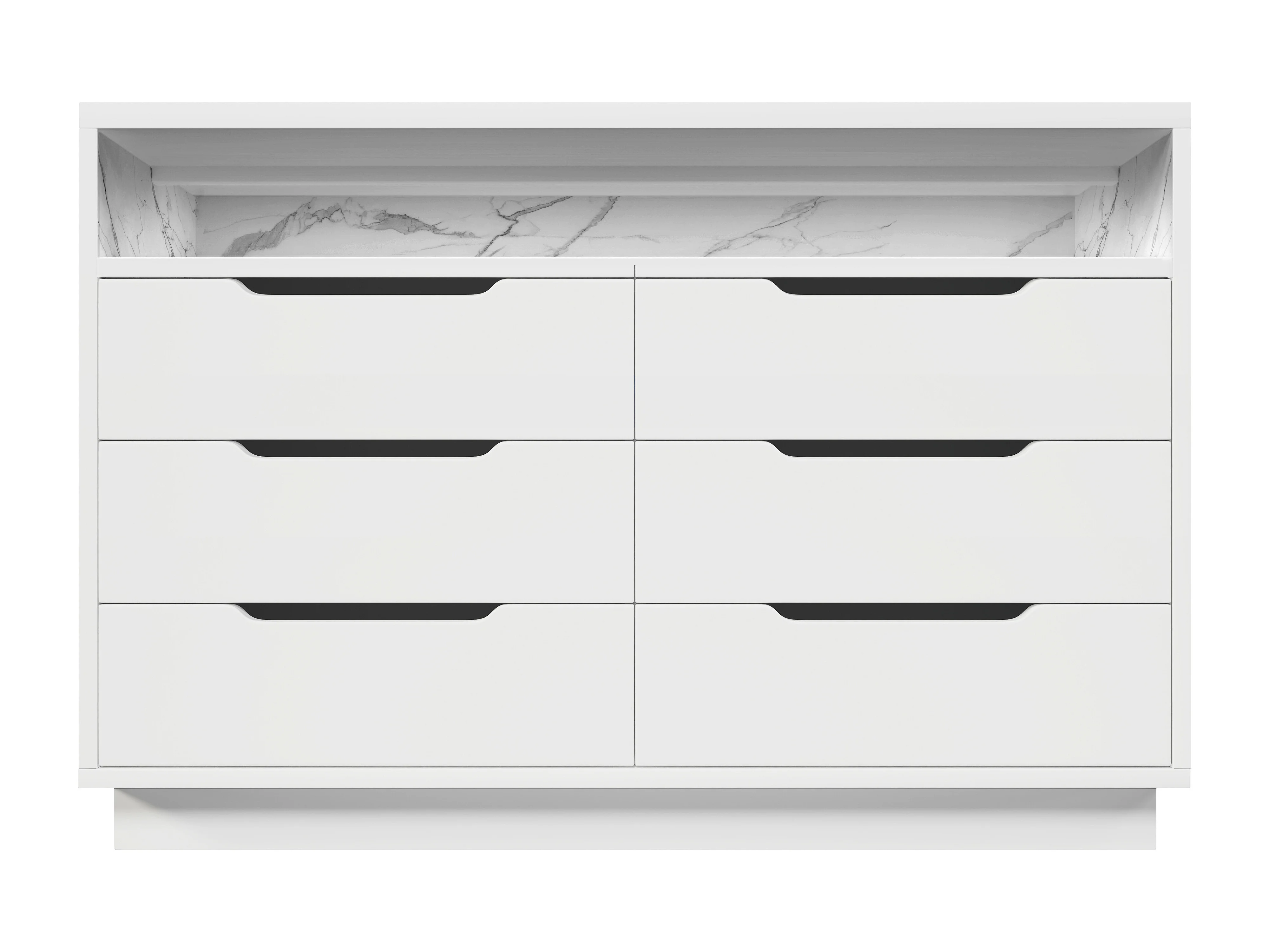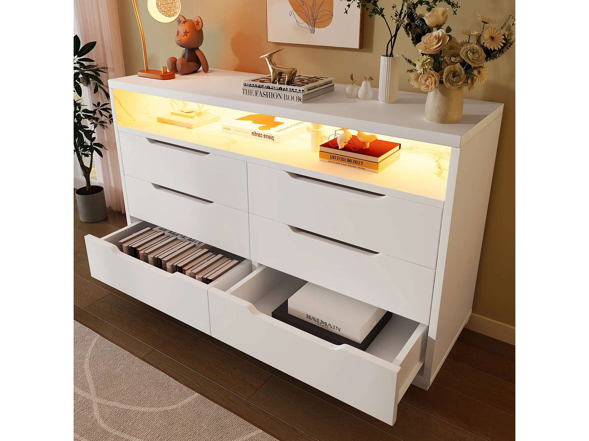 Commode avec LED, 6 tiroirs, design marbré, MDF, blanc (120x40x85 cm)