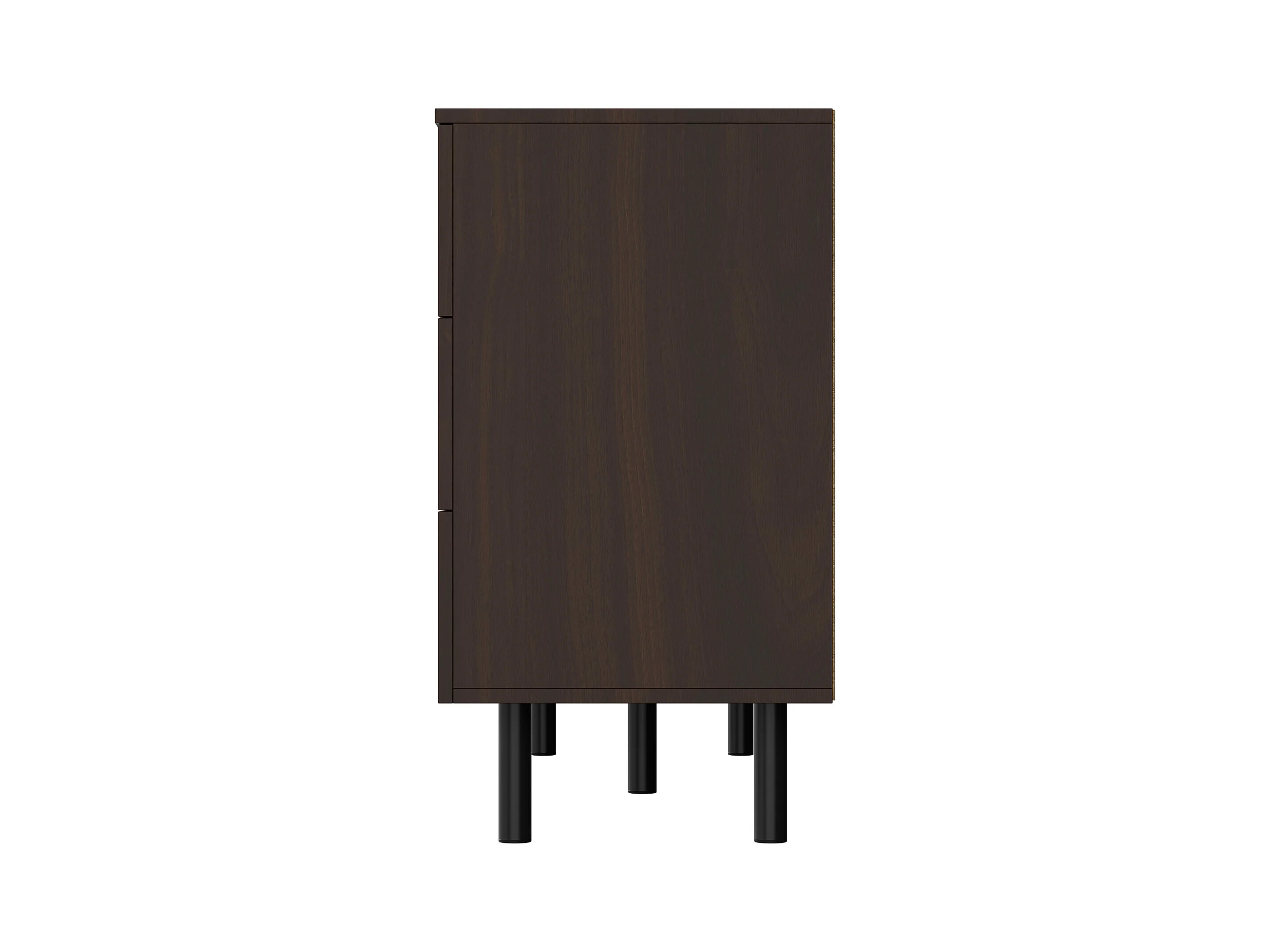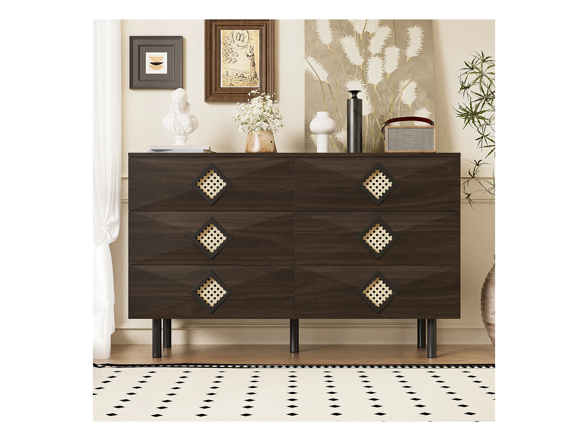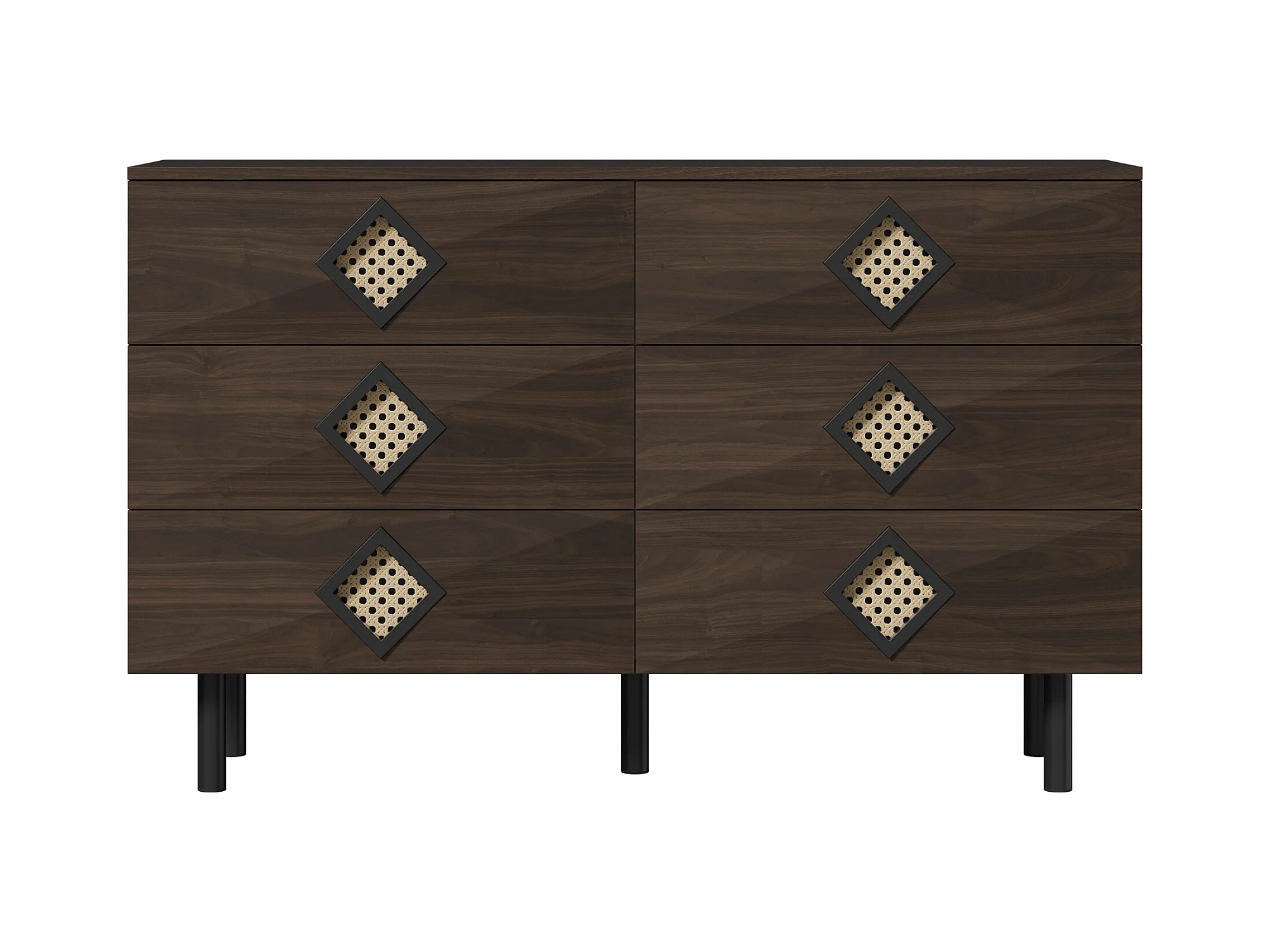 Commode basse en noyer avec 6 tiroirs, poignées en rotin en forme de losange 120x40x74,5cm